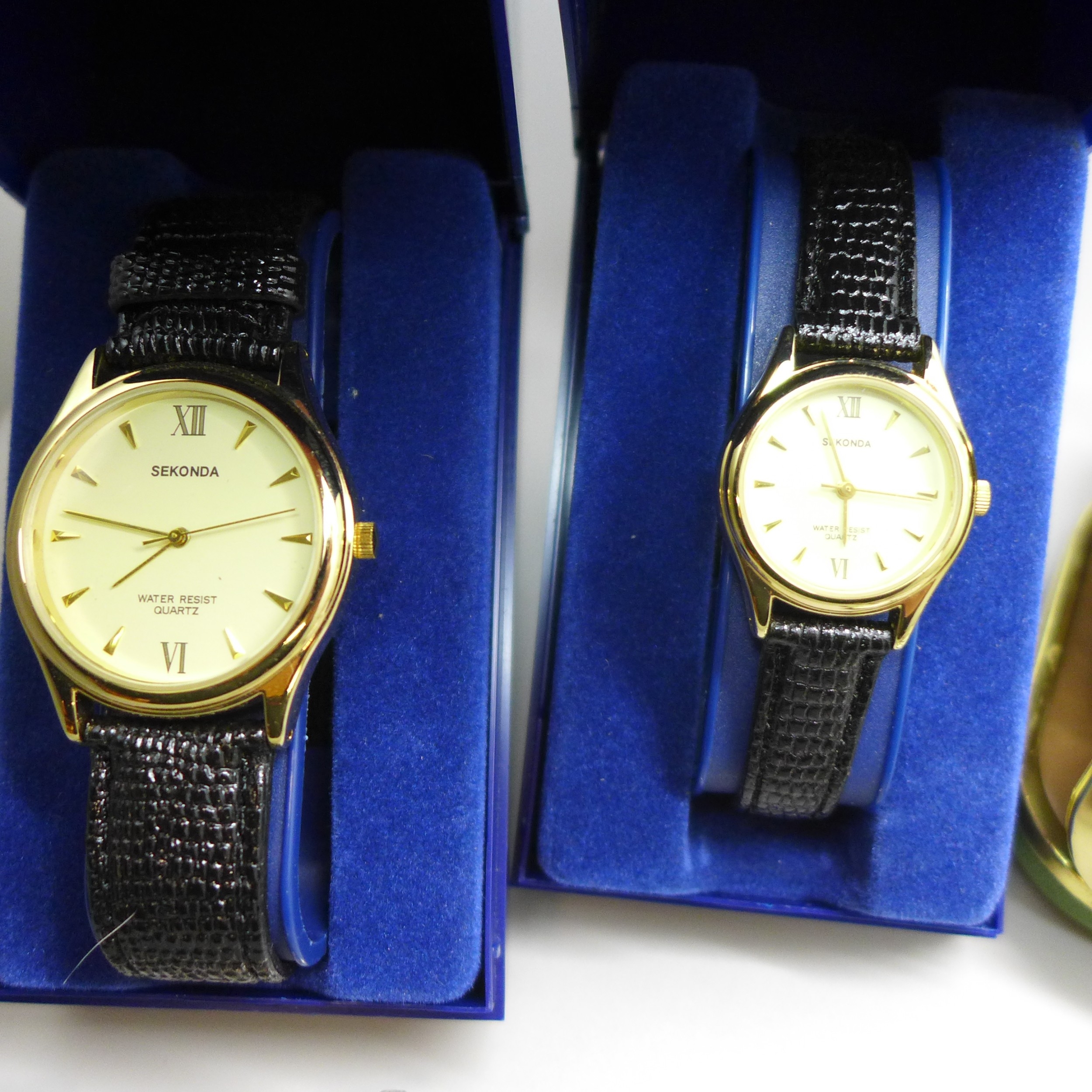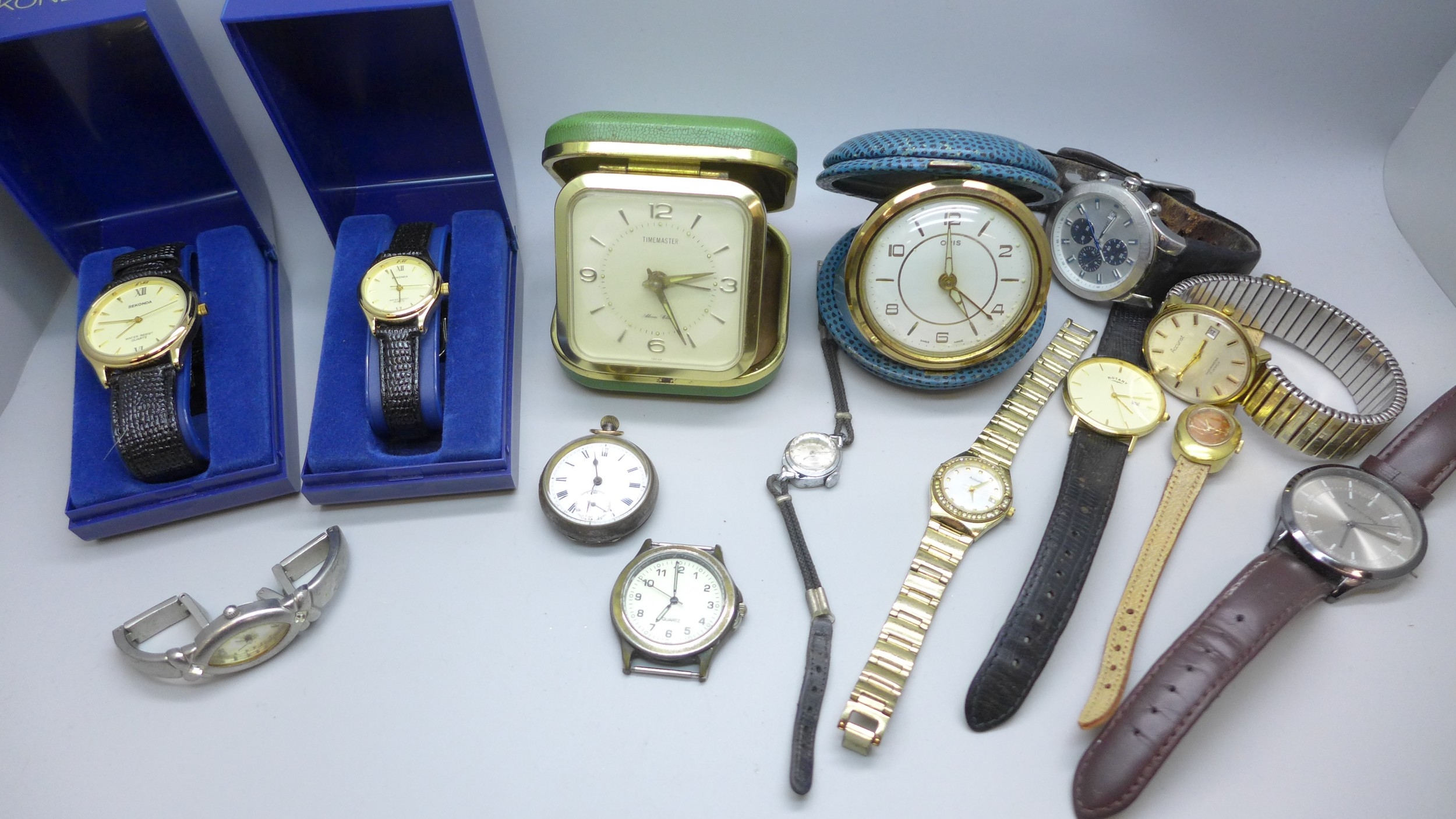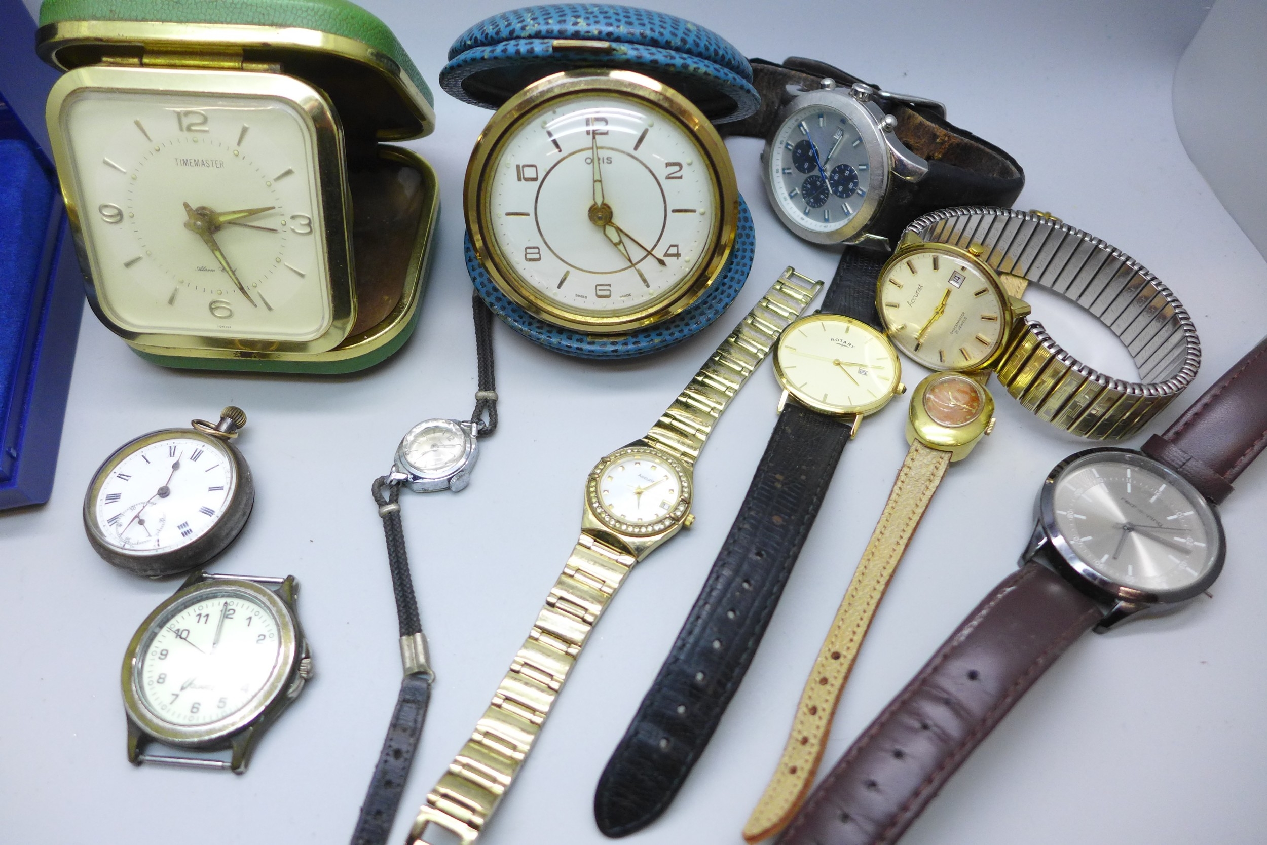 A collection of watches including Accurist, and travel clocks