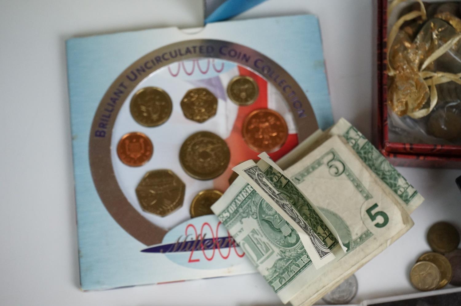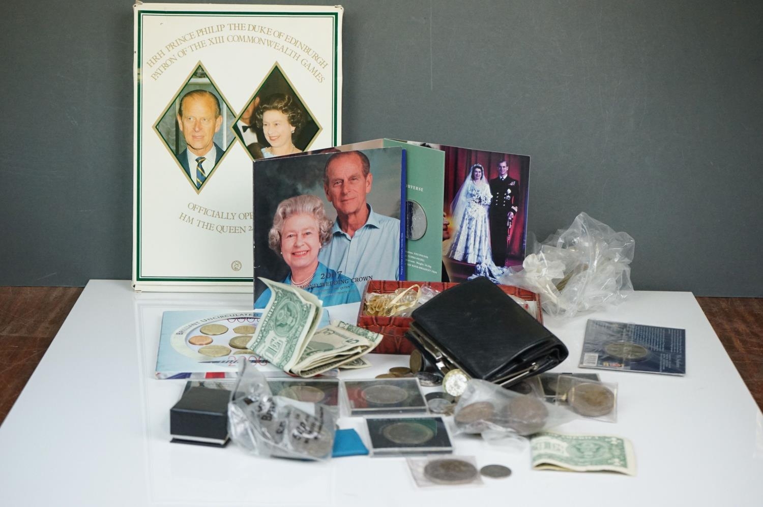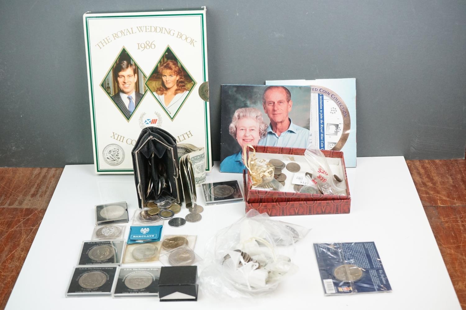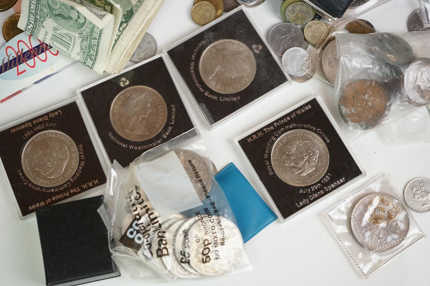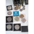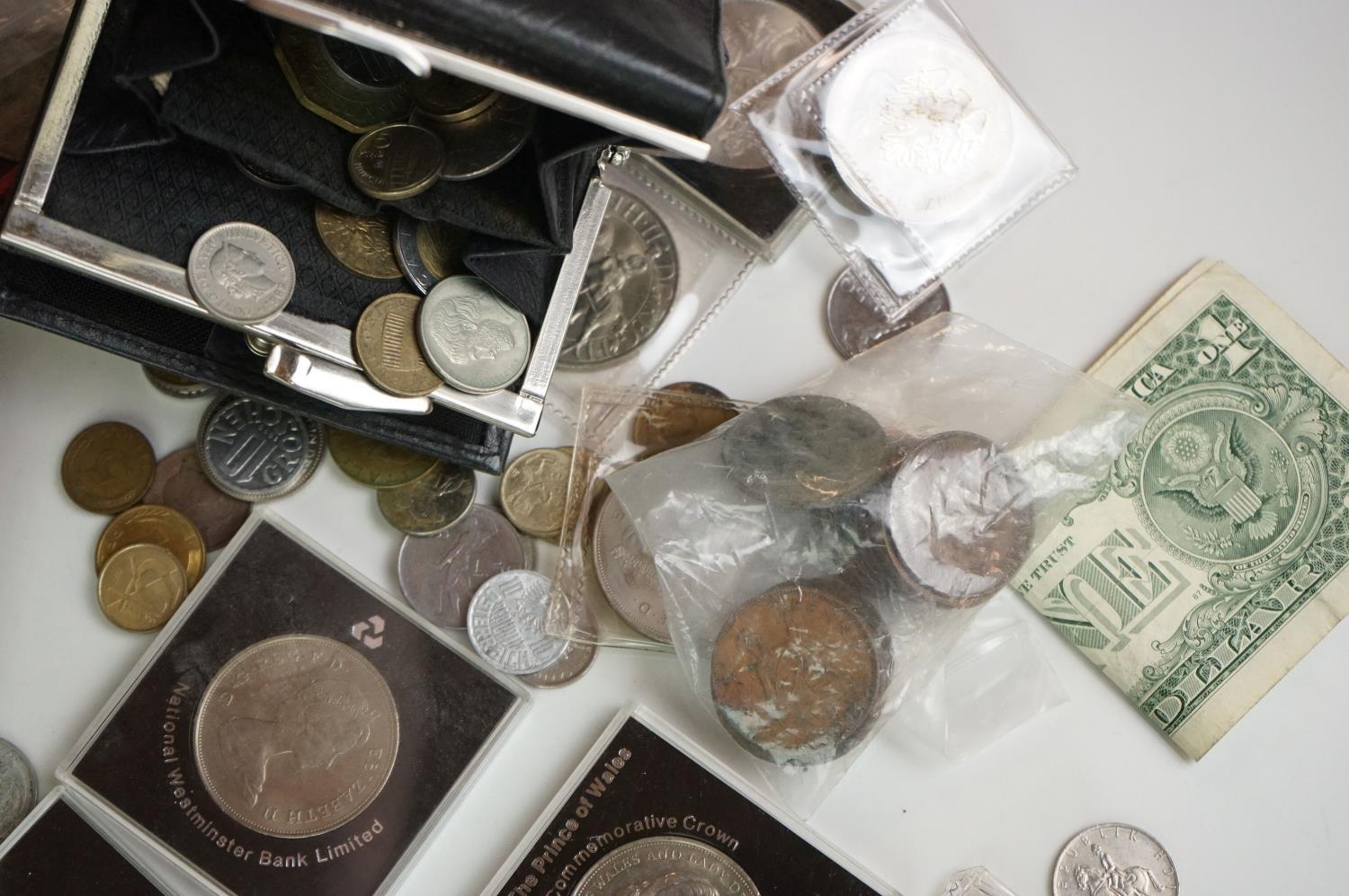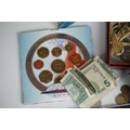 A collection of British and world coins to include commemorative and proof examples, an American silver dollar, a collection of banknotes and a small quantity of British pre-decimal coinage