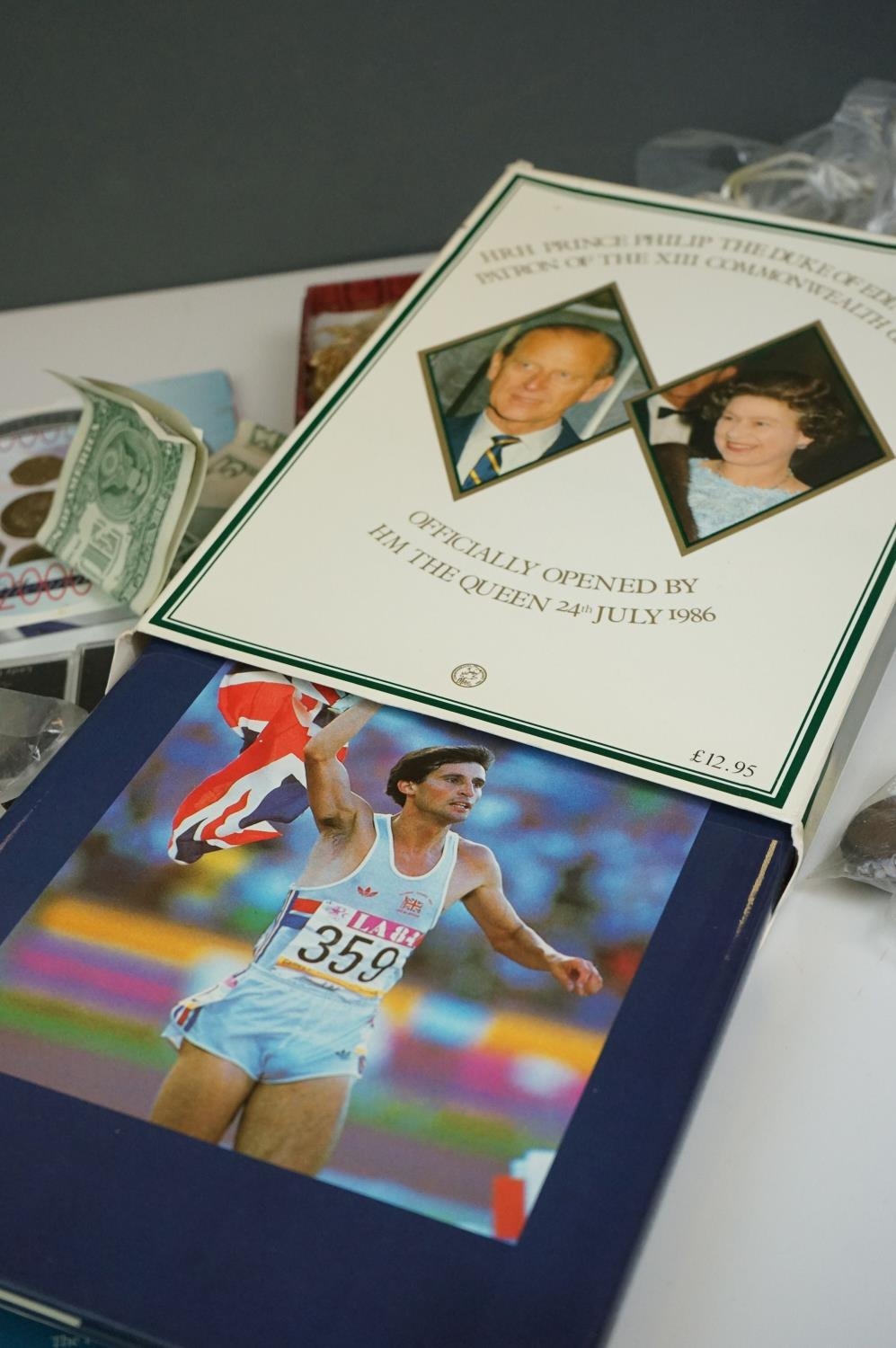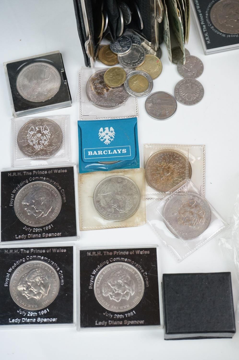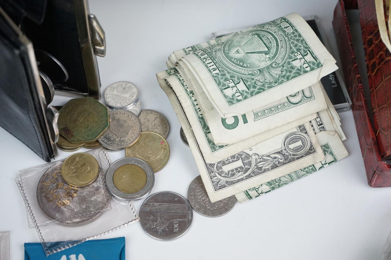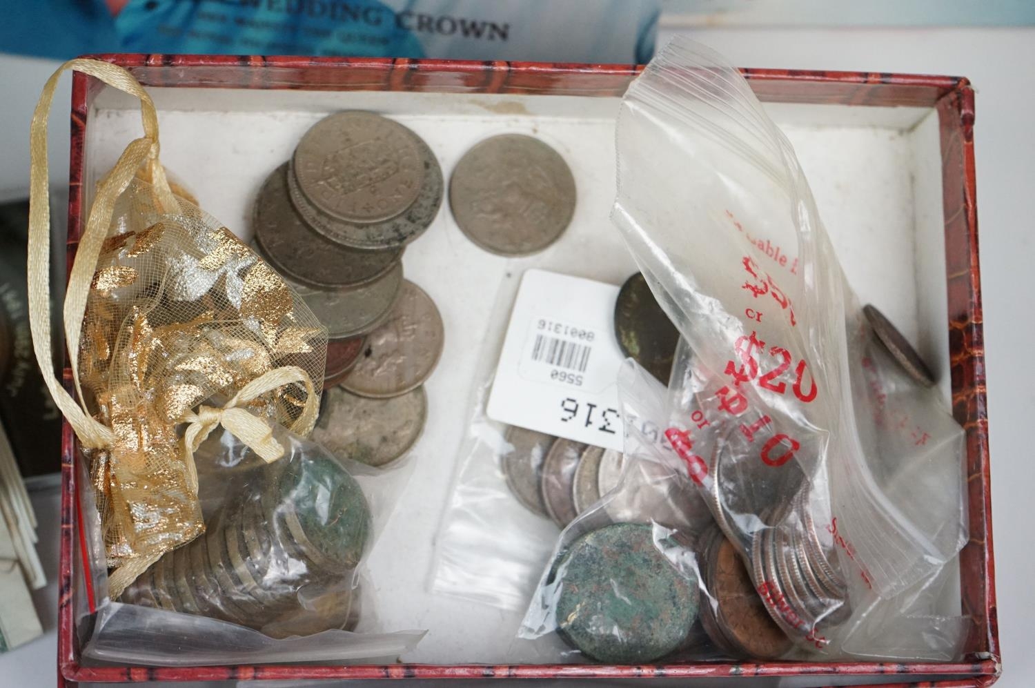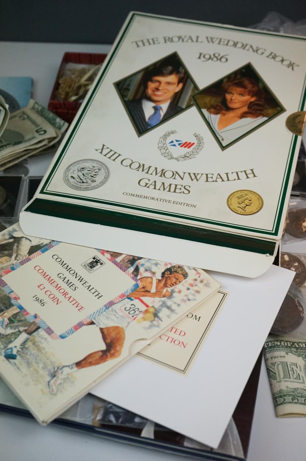 A collection of British and world coins to include commemorative and proof examples, an American silver dollar, a collection of banknotes and a small quantity of British pre-decimal coinage