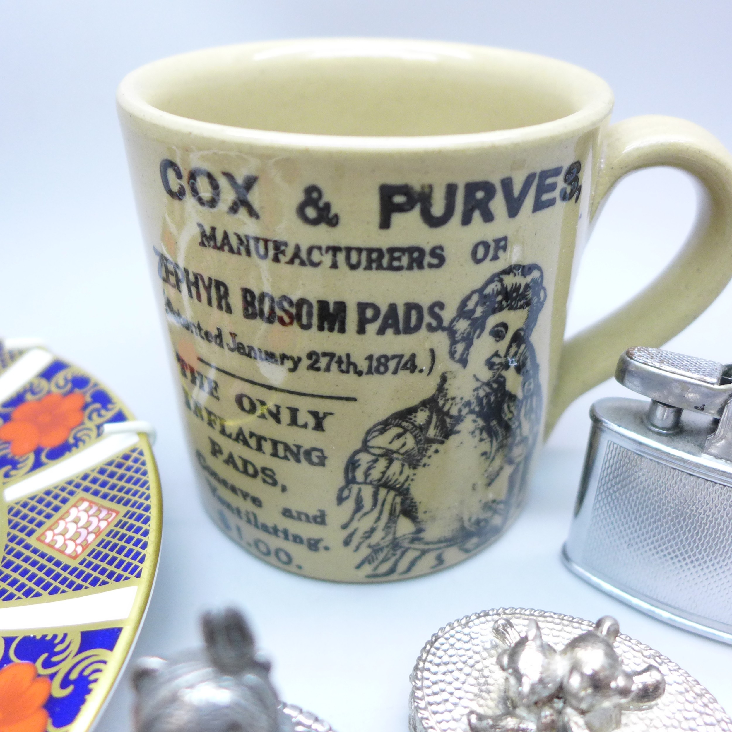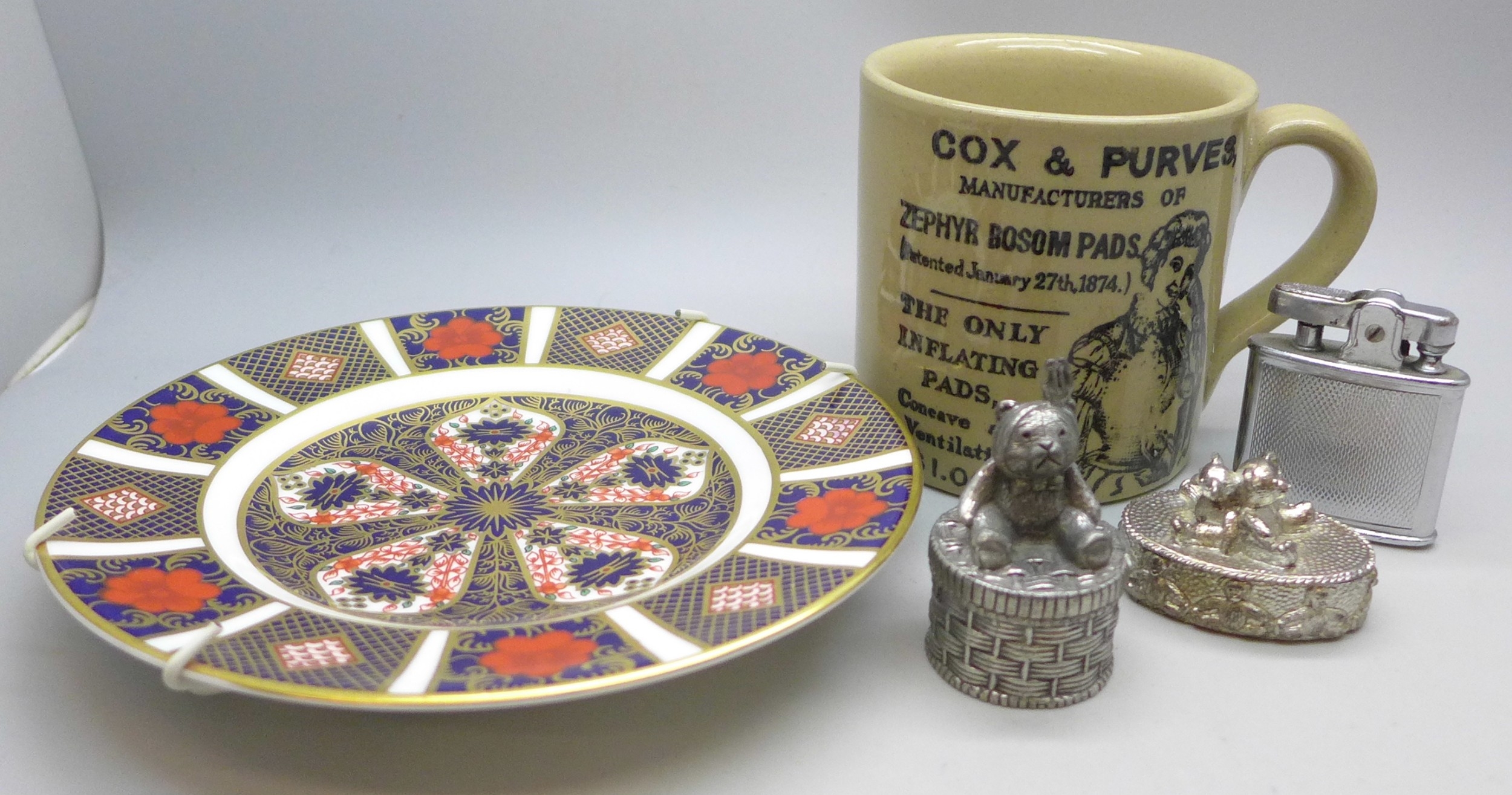 A Royal Crown Derby 1128 Old Imari plate, a pair of christening trinket boxes, a Ronson lighter and a Pearsons pottery mug *THIS LOT IS NOT AVAILABLE FOR PACKING AND POSTING
