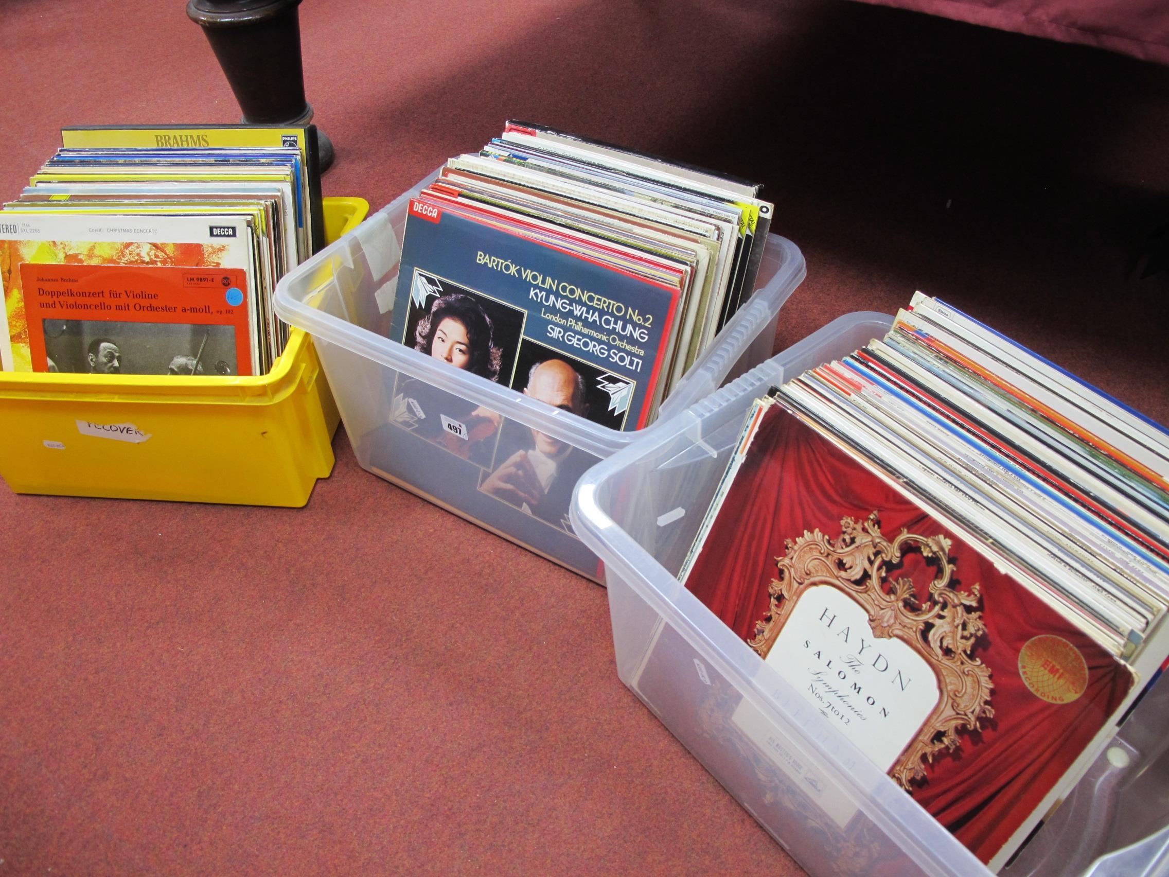 Approximately One Hundred and Sixty Classical L.P's, with some very noteworthy titles, including Kyung-Wha Chung, Sir Georg Solit, The LPO, Bela Bartok - Bartok Violin Concerto No. 2 (Decca SXL 6802, 1977, factory sample, test pressing), Choir Of St. Johns College Cambridge - Schubert Mass In E I-Tat (Argo ZRG825, 1975, factory sample test pressing), Sir Thomas Beecham and RPO - The Solomon Symphonies No. 11-12 (ASD 341, 1960 UK 1st pressing), Yehudi Menuhin, Pierre Boulez - BBC Symphony Orchestra - Berg Violin Concerto and Bartok Two Rhapsodies (ASD 2449, 1969). These are just a few examples in this cared for collection of Violin Concertos, String Concertos, etc, on Philips, Decca, HMV, EMI and DGG.