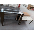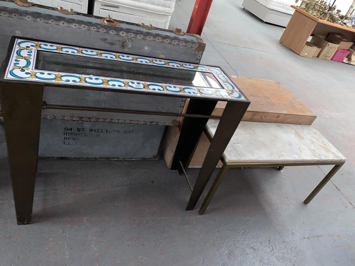 A marble top table and a tile and glass top side table