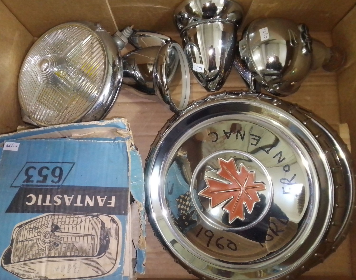 A box of assorted vintage/classic car parts comprising a Marchal Fantastic 653 and 660 lamps, bullet wing mirrors and four hub caps from a 1960 Ford Frontenac.