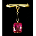 A 9ct Gold Suspended Ruby Brooch, set with a faceted ruby stone of approximately 4ct, (stone measures 16mm x 14mm), total gross weight 7.6g