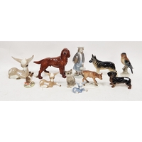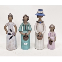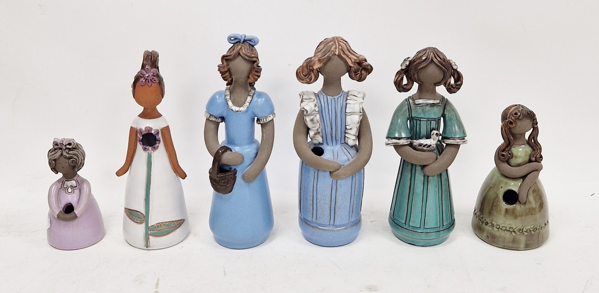 Six Elbogen (Sweden) stoneware figures of girls, each inscribed Elbogen/Handmade, various painted and incised initials, in sizes, including two girls in blue dress one holding a basket, another pierced with a flower design, a third holding a bird and two smaller examples, one in a lilac dress another in mottled green, tallest 25.5cm high approx (6)