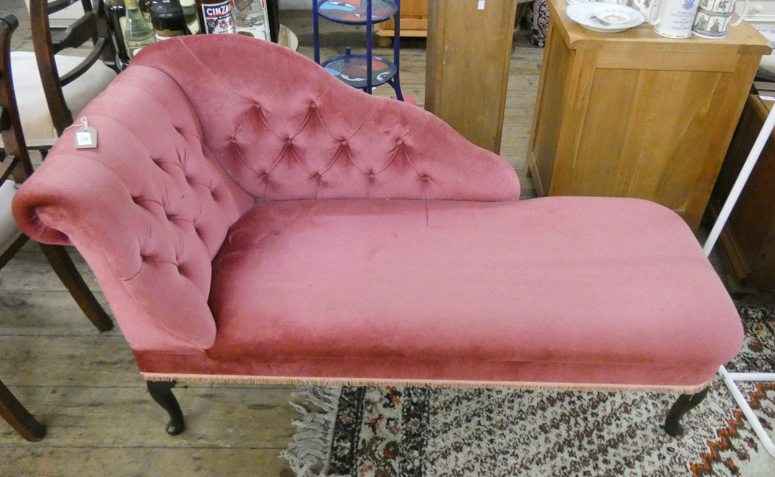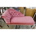 A small pink draylon upholstered buttoned couch