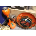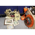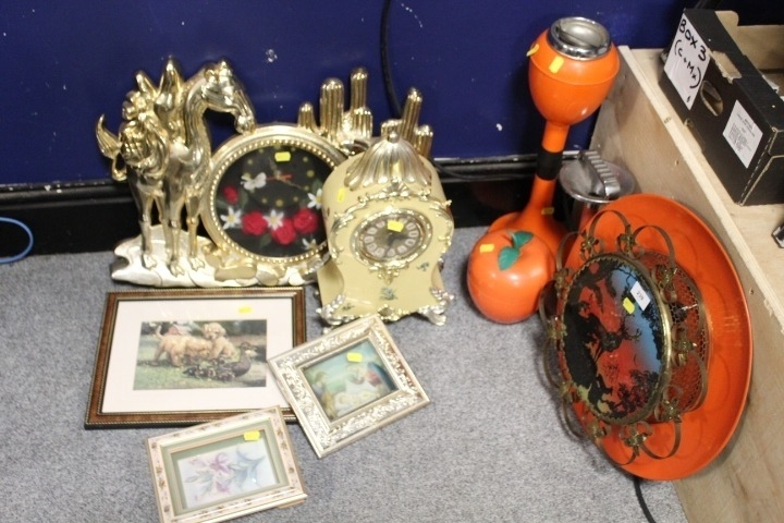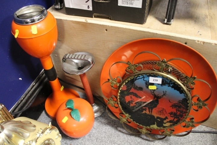 A quantity of retro and kitsch decorative items to include an orange plastic smokers stand etc
