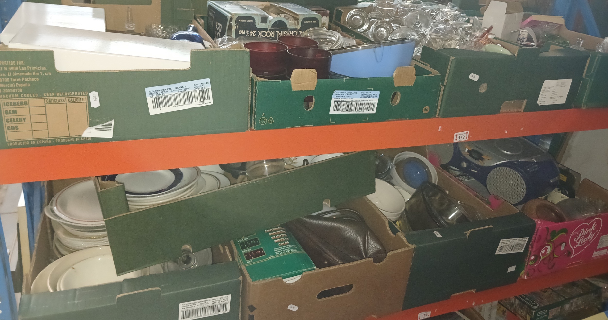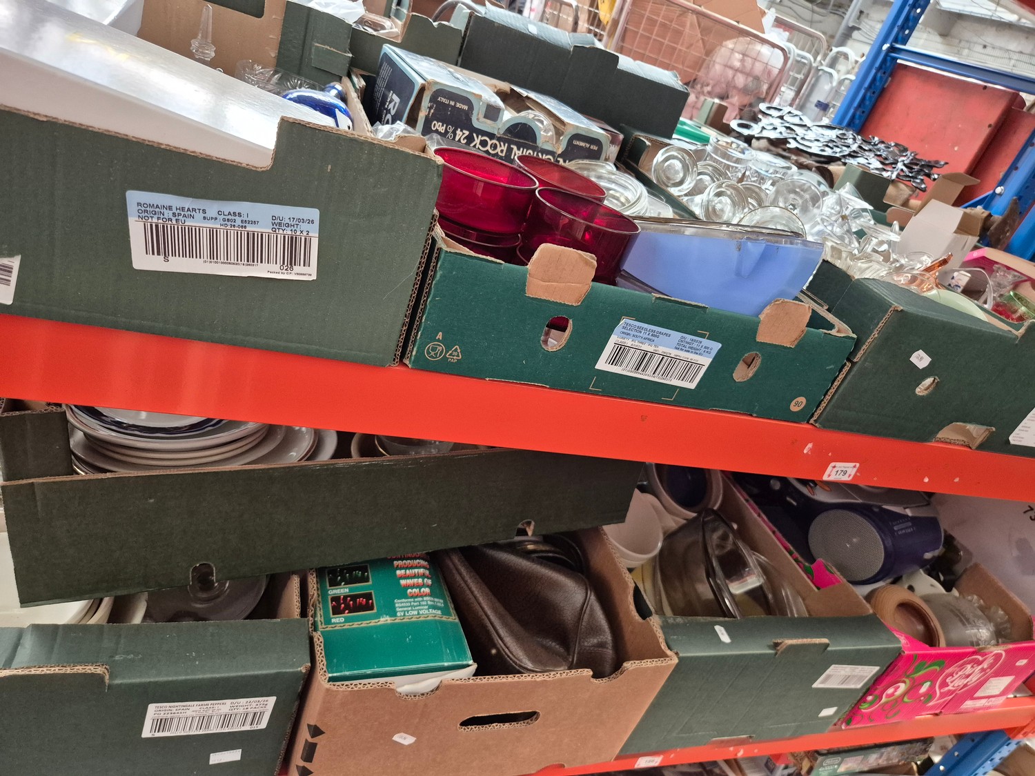 9 boxes of ceramics and glass, including kitchen items, drinking glasses, boxed candle holders, fibre optic lamps, pyrex wares etc