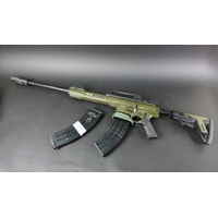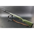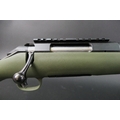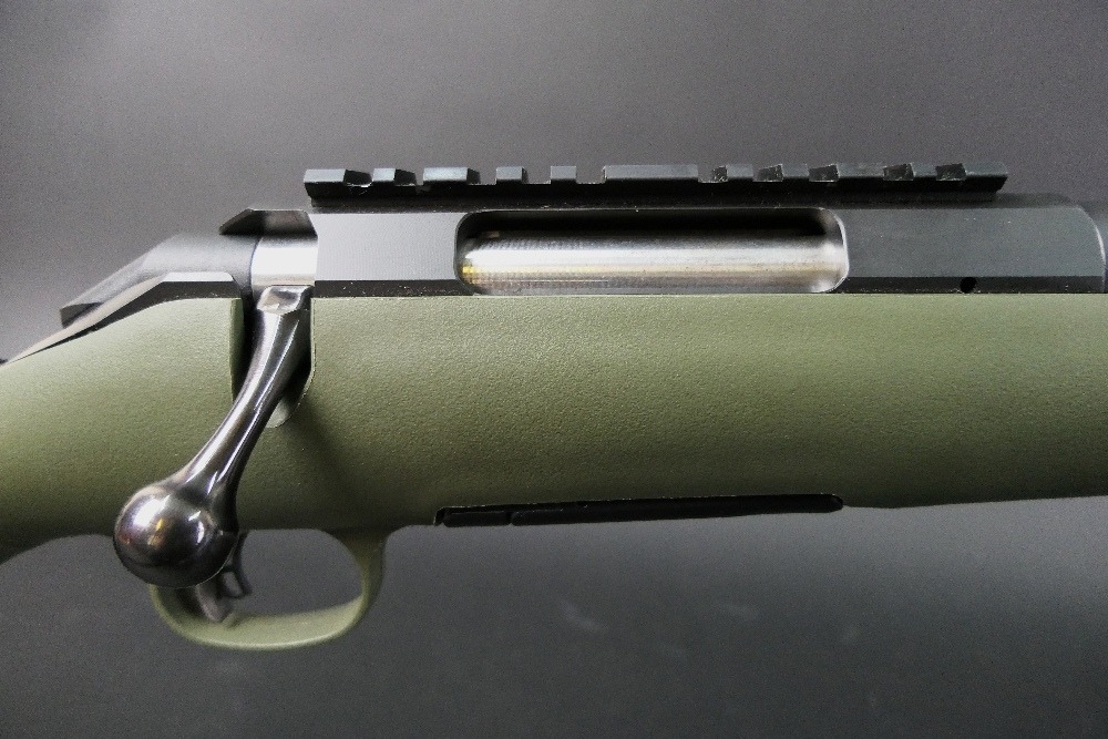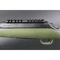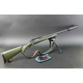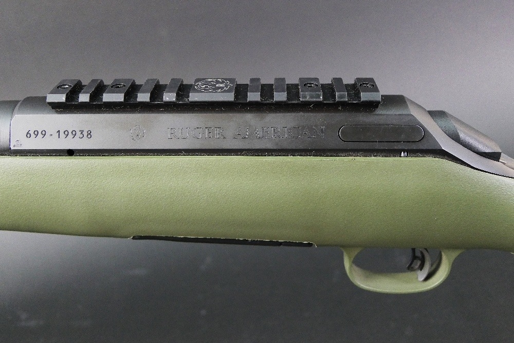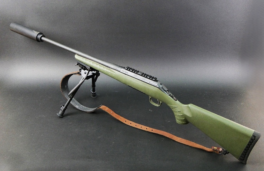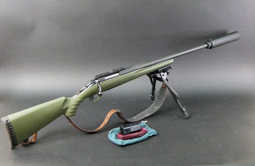 Ruger American cal 223 bolt action rifle, fitted with a DPT sound moderator, bipod, Bisley leather sling and a green synthetic stock, comes with two magazines. Sound moderator no serial number, Rifle Serial No. 699-19938.
