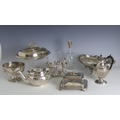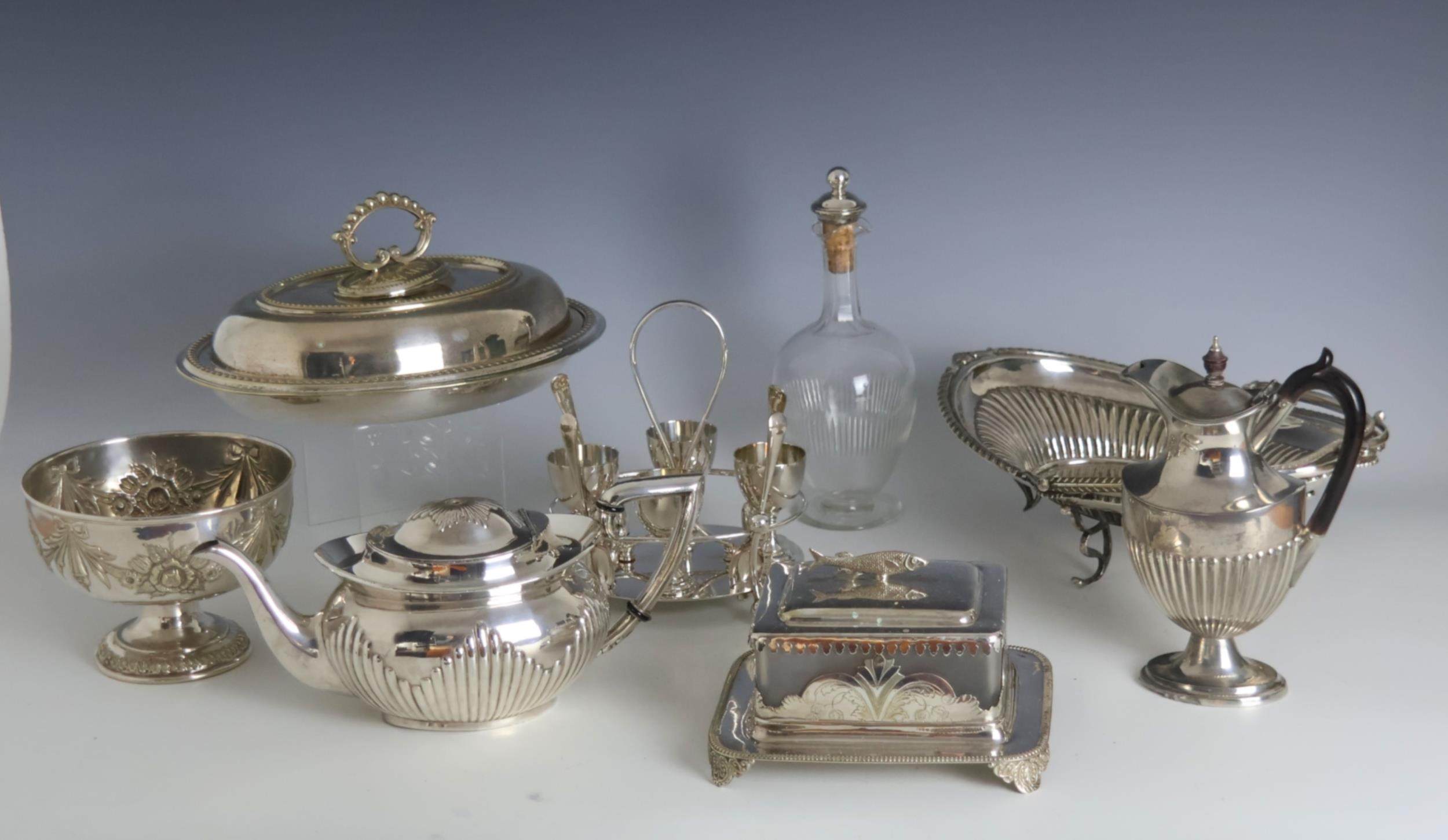 A selection of silver plate, including a sardine dish, of square form with cast sardine shaped handle above glass body, with silver plated teapot, egg cruet, entrée dish and further items (qty) (at fault)
