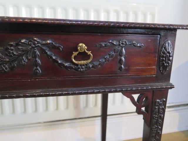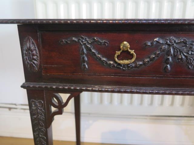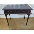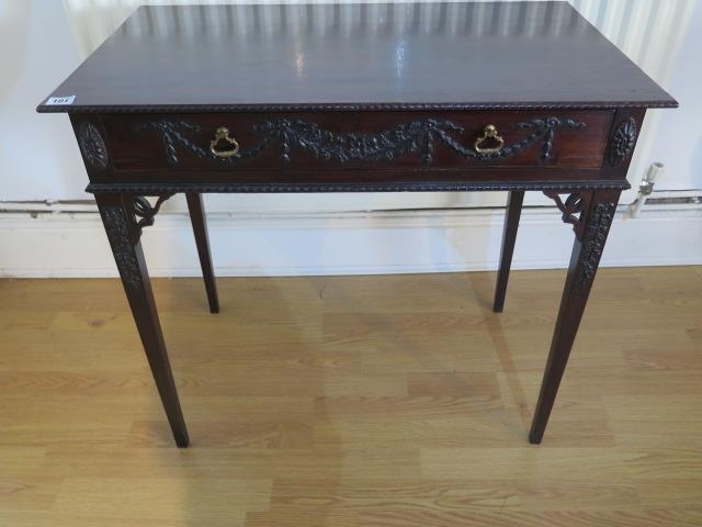 An Edwardian mahogany single drawer side table on square tapering legs, 72cm tall x 76cm x 44cm, generally good condition