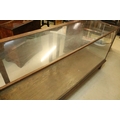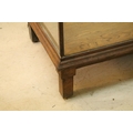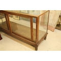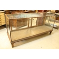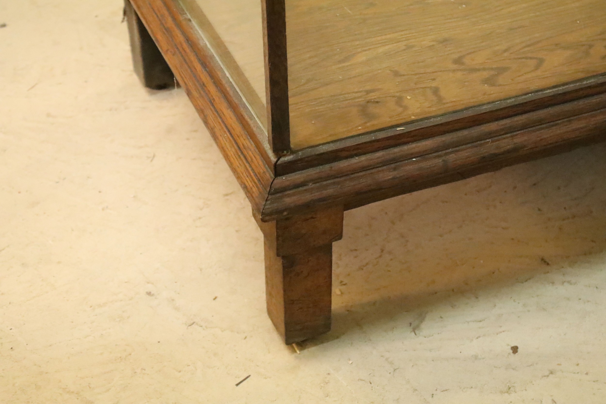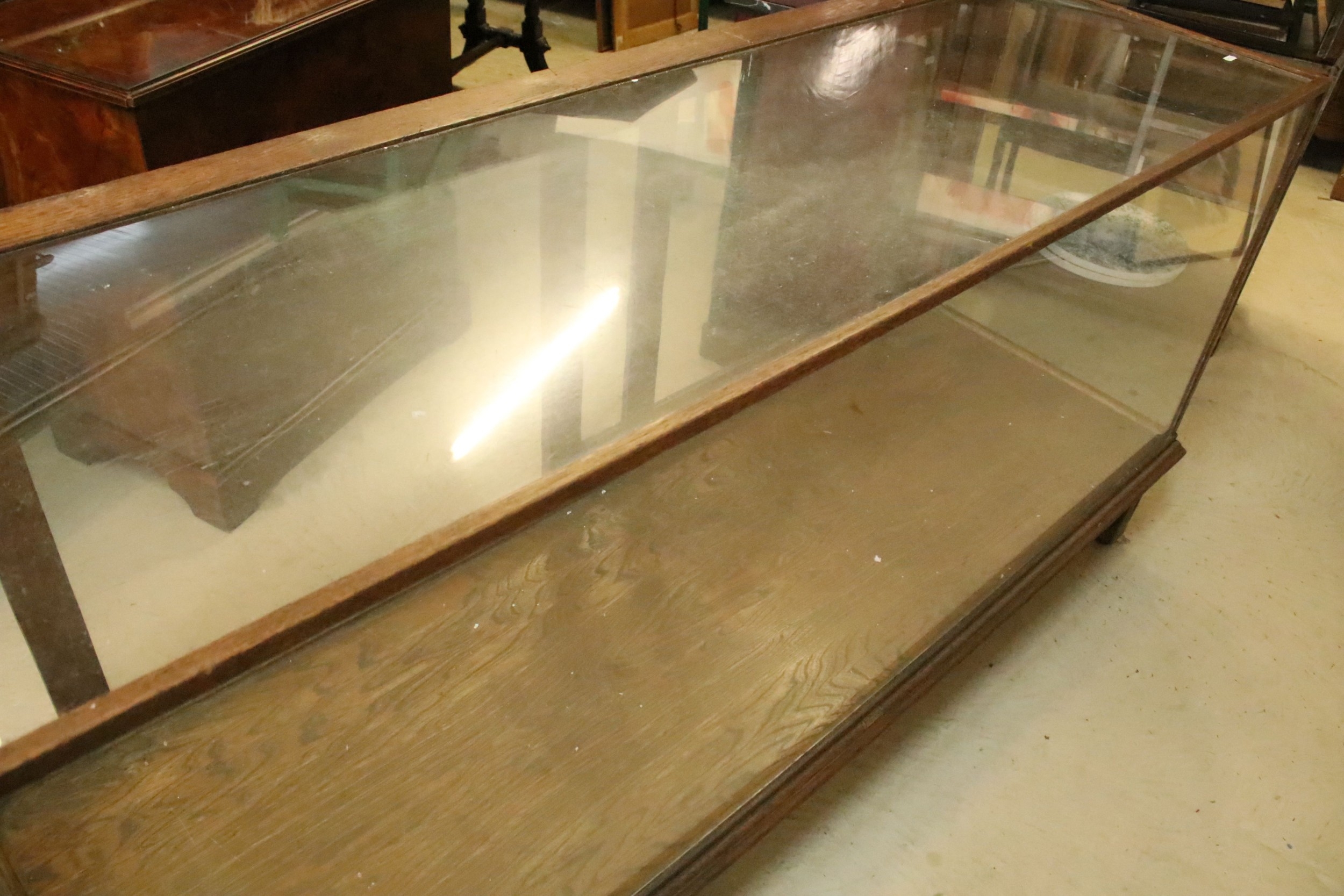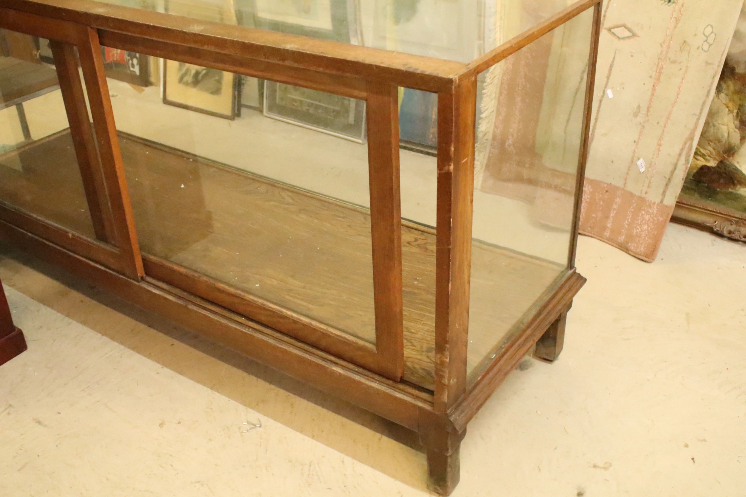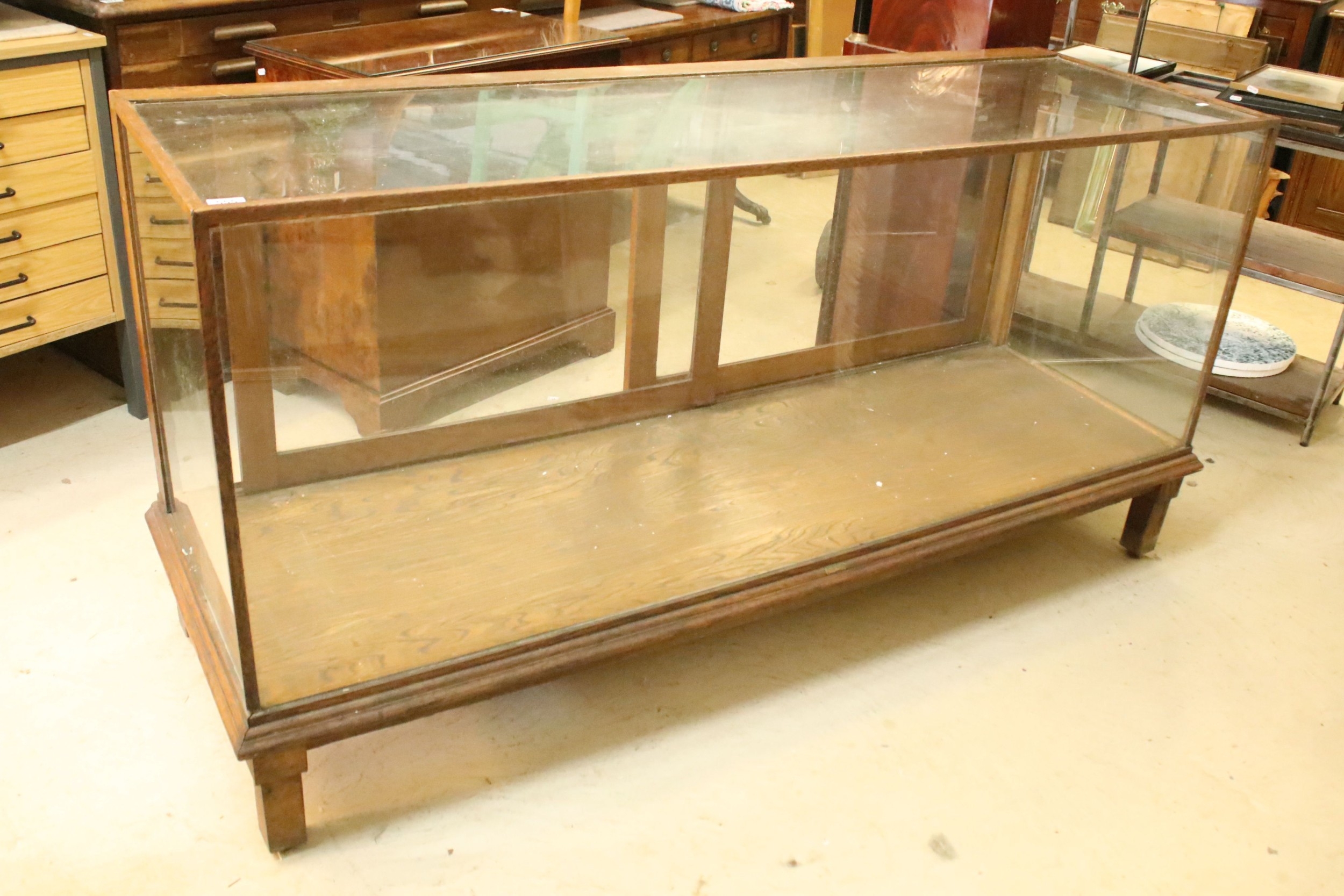 Early 20th century oak and glass display case, having vacant interior with sliding doors to rear, raised on oak base with stile legs, W 178cm x D 59cm x H 91cm