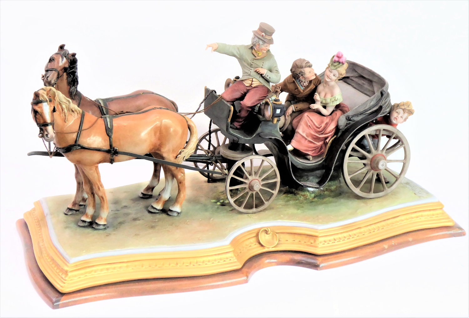 A large and impressive Capodimonte porcelain model: courting couple riding in a two-horse carriage with an urchin climbing aboard; blue-painted Capodimonte mark and signed to the rear B. [Bruno] Merli. (Stained-wood plinth-style base 64.5 wide x 33.5 cm deep). (32 cm high including stand).