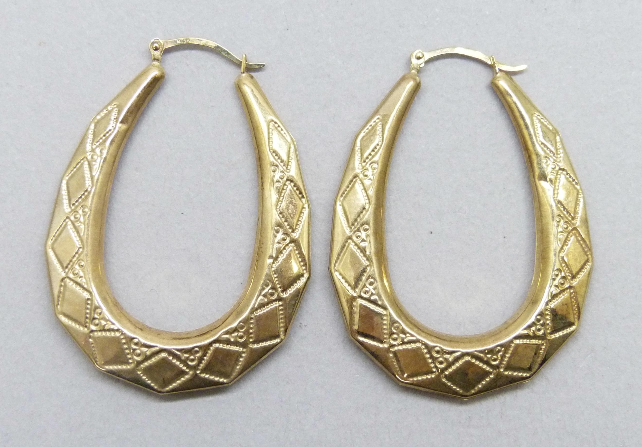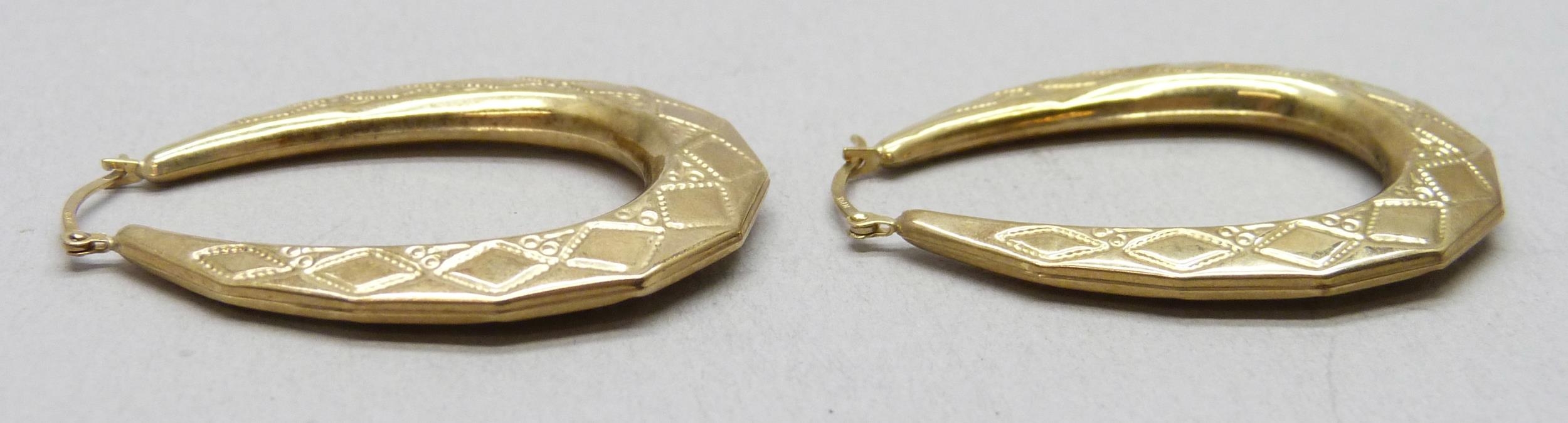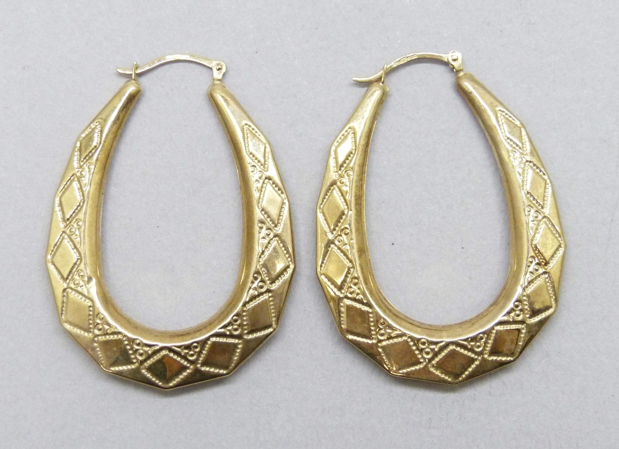A pair of 9ct gold hoop earrings, 2.2g, 4.1cm drop