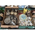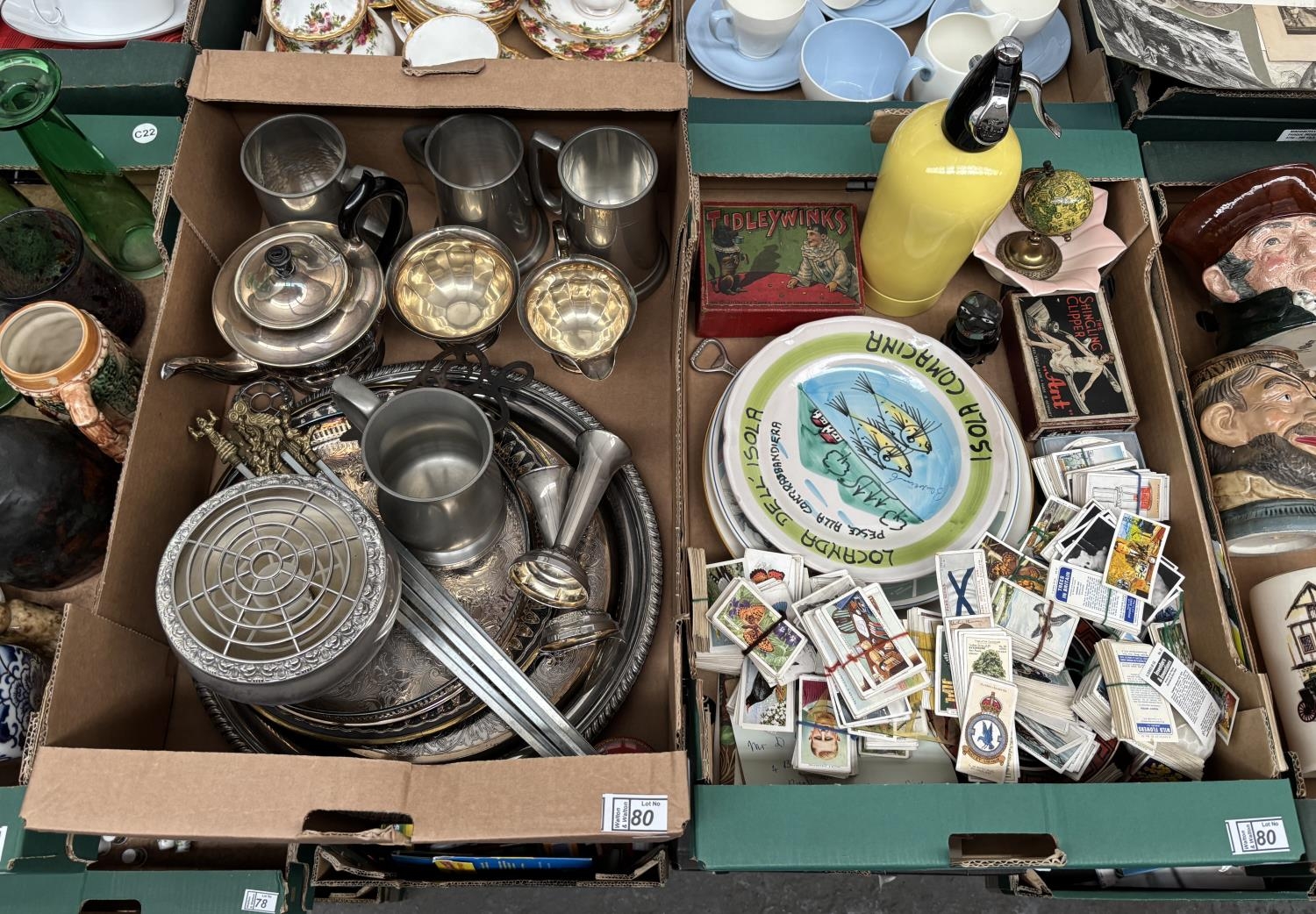 2 Boxes containing plated ware, pewter tankards and collectible cigarette cards