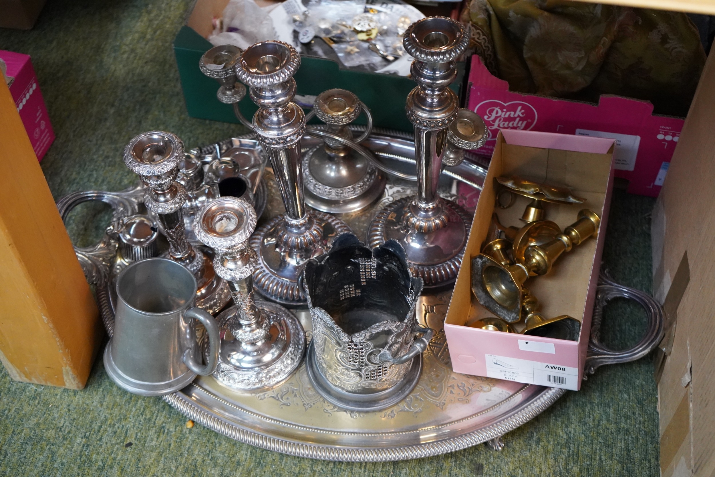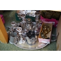 Collection of assorted Silver plated flatware to include two handled tray, Copper Silver plated candlesticks etc.