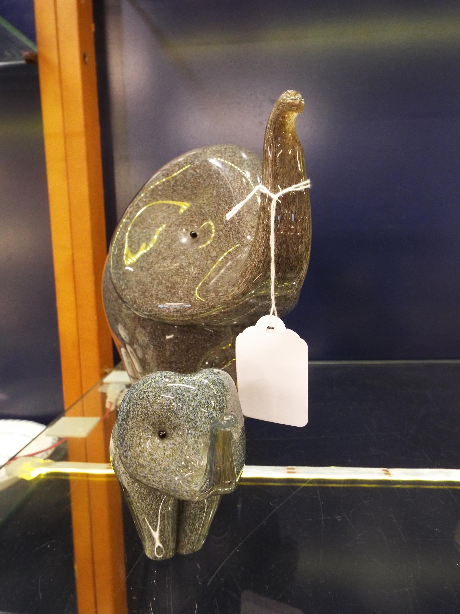 A large Langham glass elephant (trunk A/F) and a small elephant