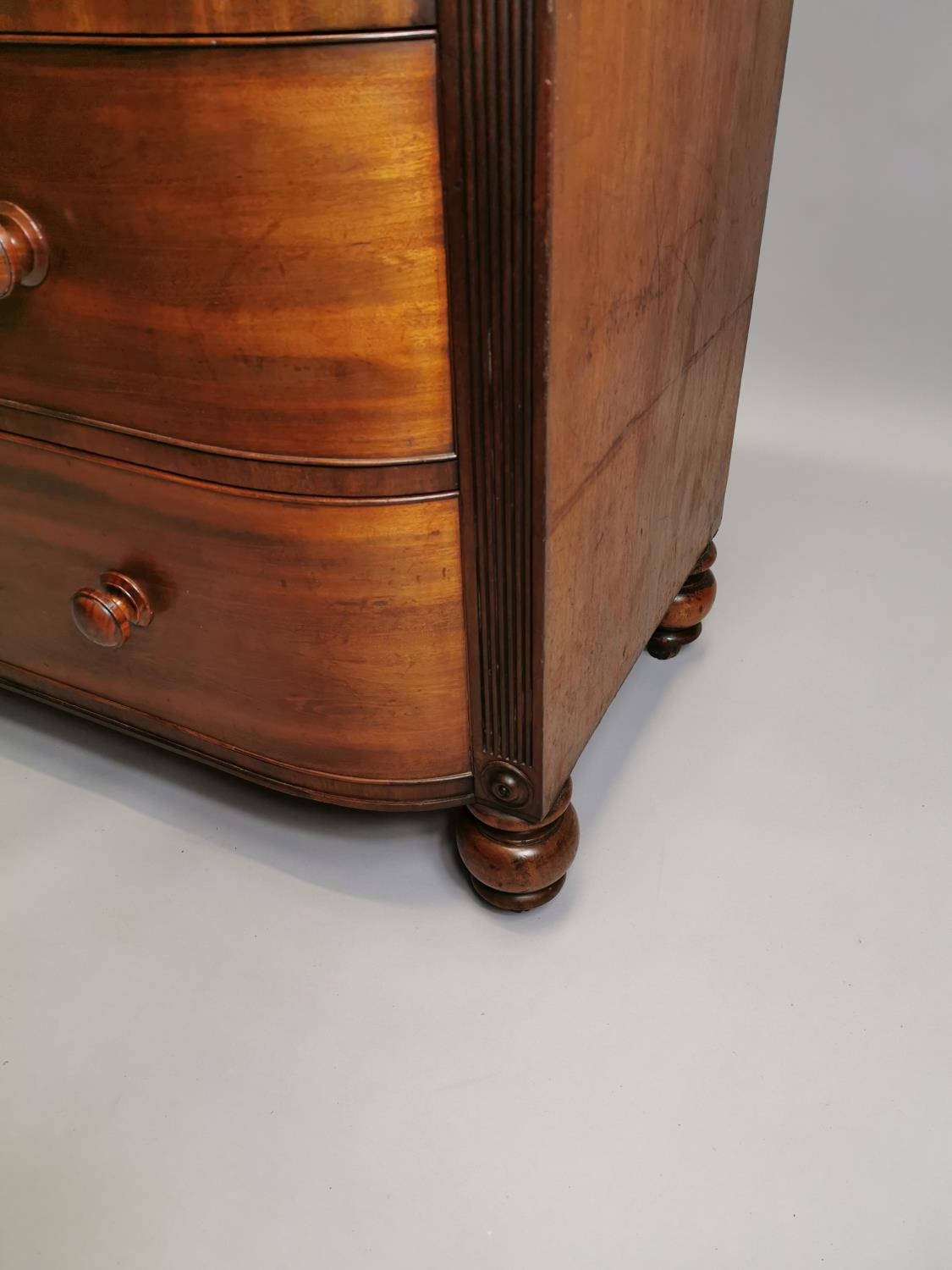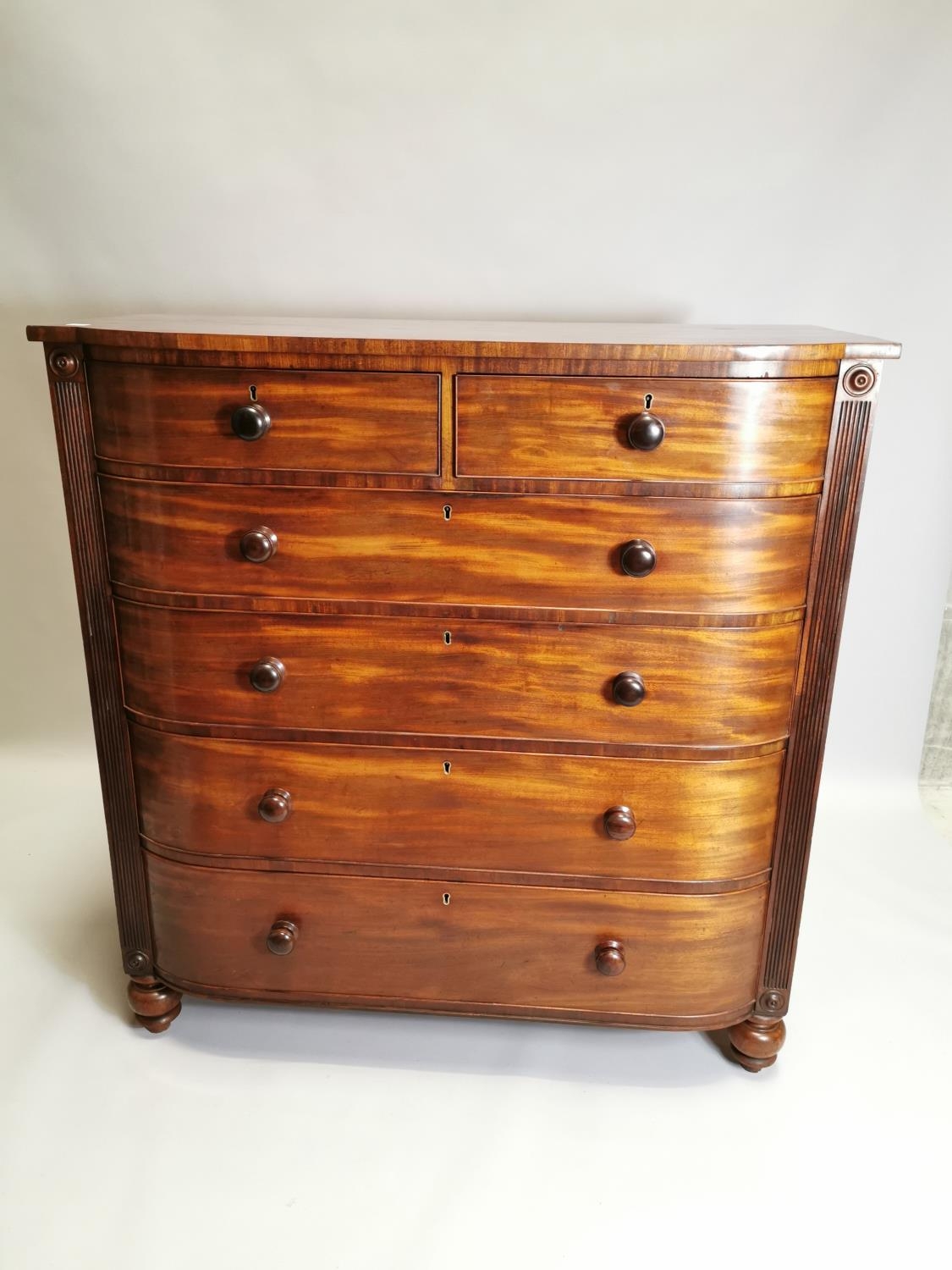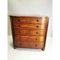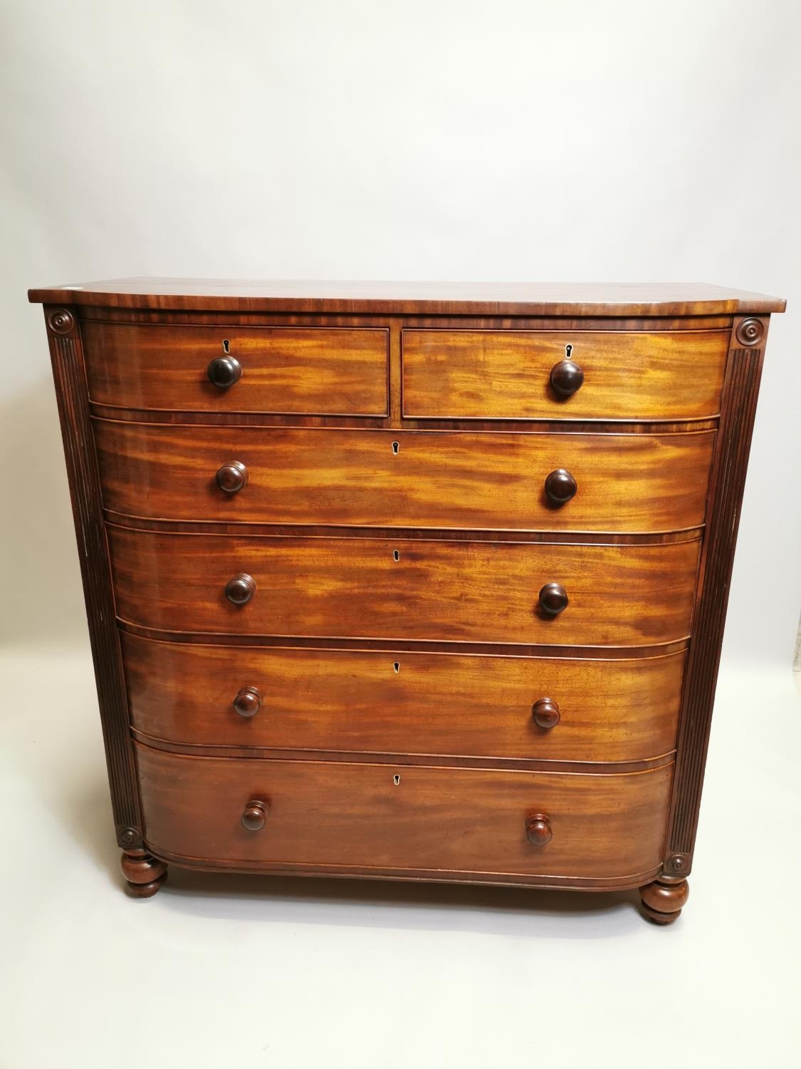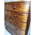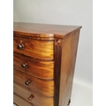 William IV mahogany chest the shaped front above the short drawers and four graduated drawers , raised on bun feet { 131cm H X 125cm W X 59cm D }.
