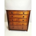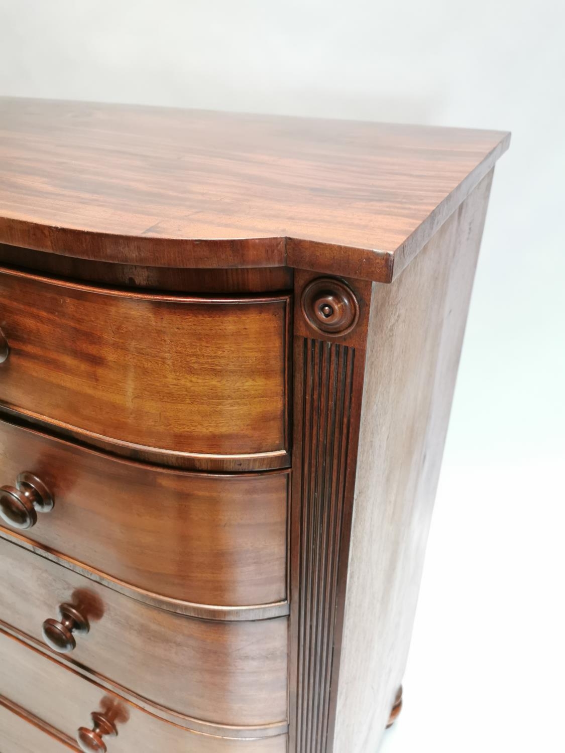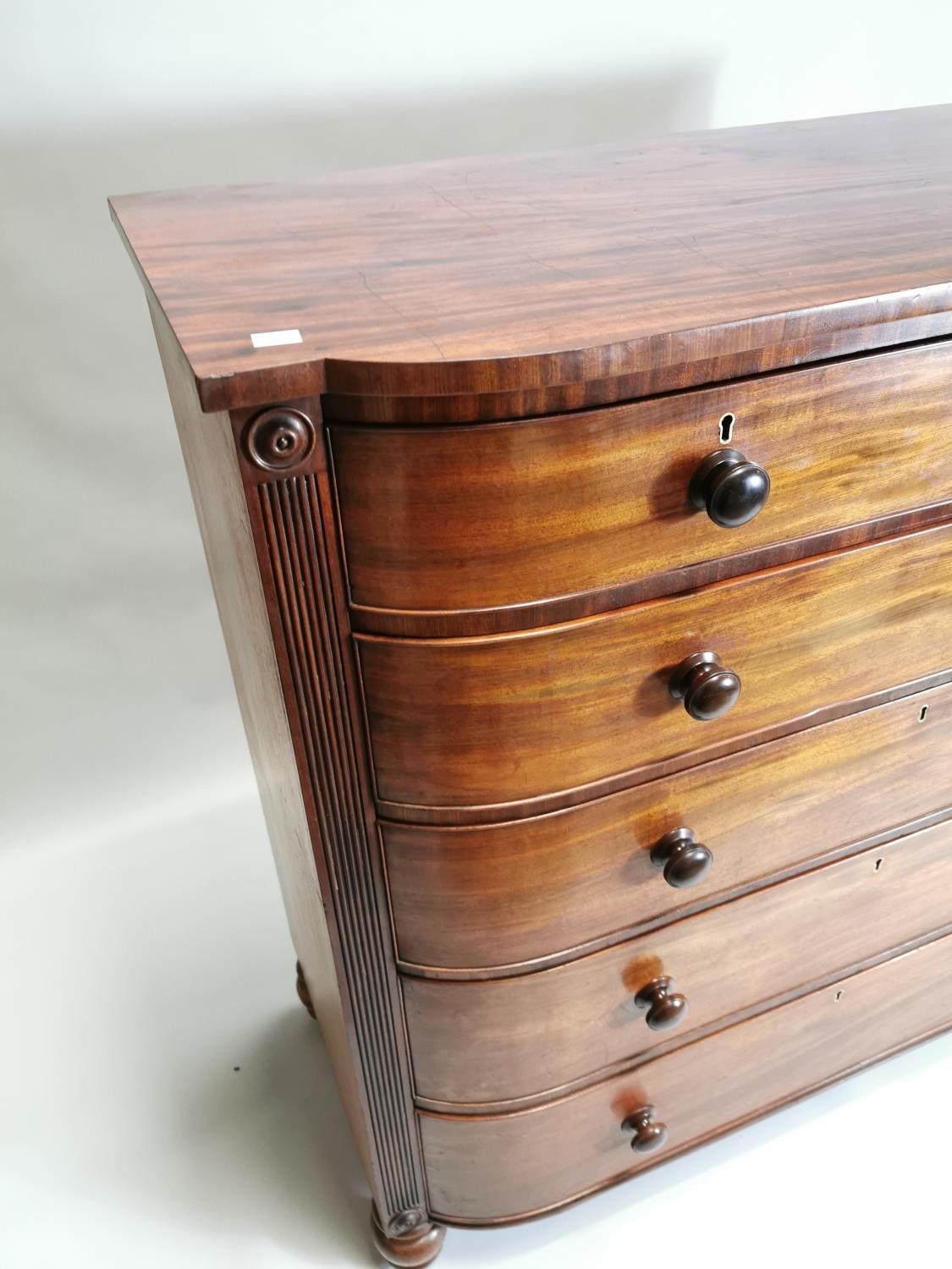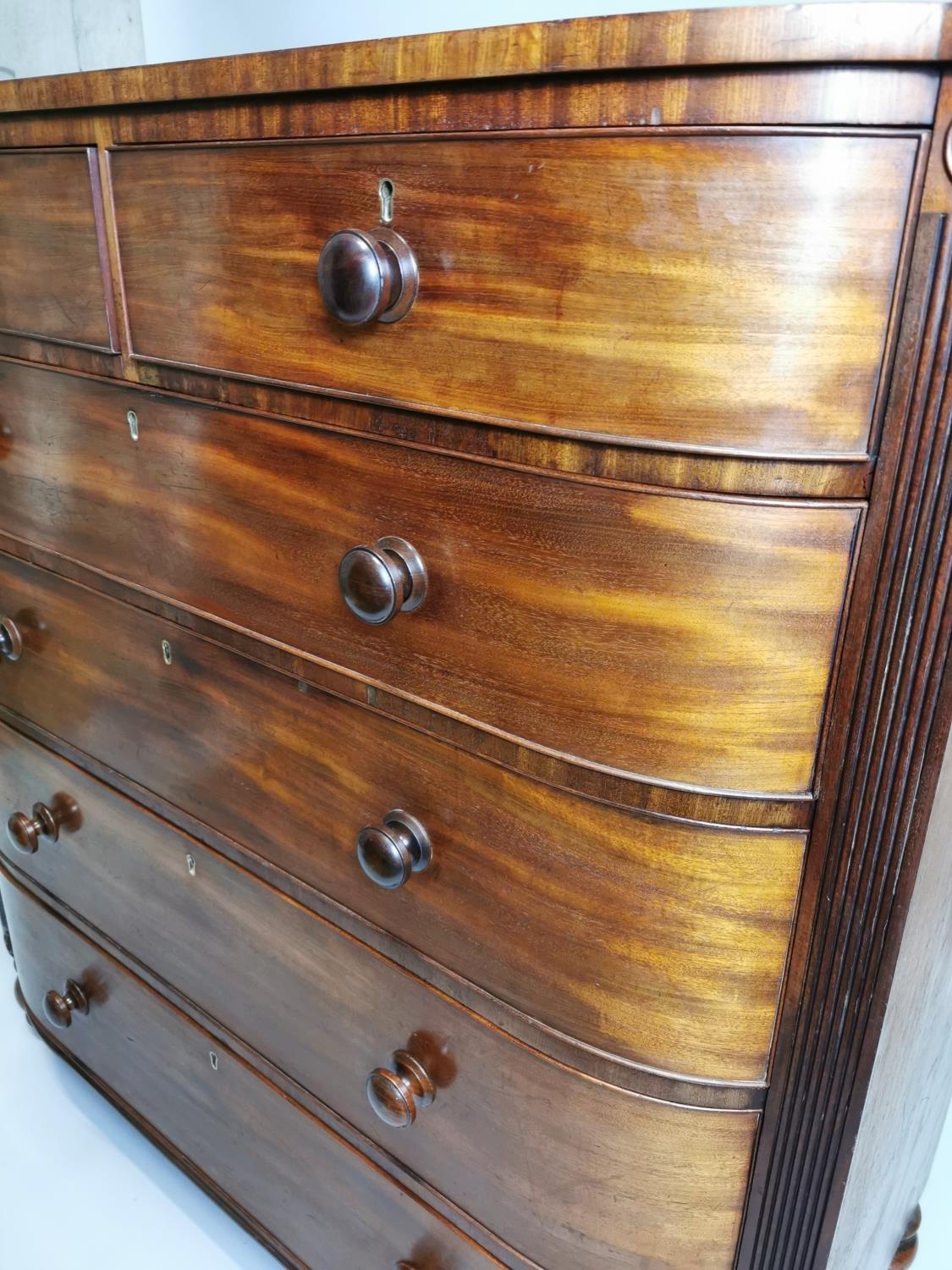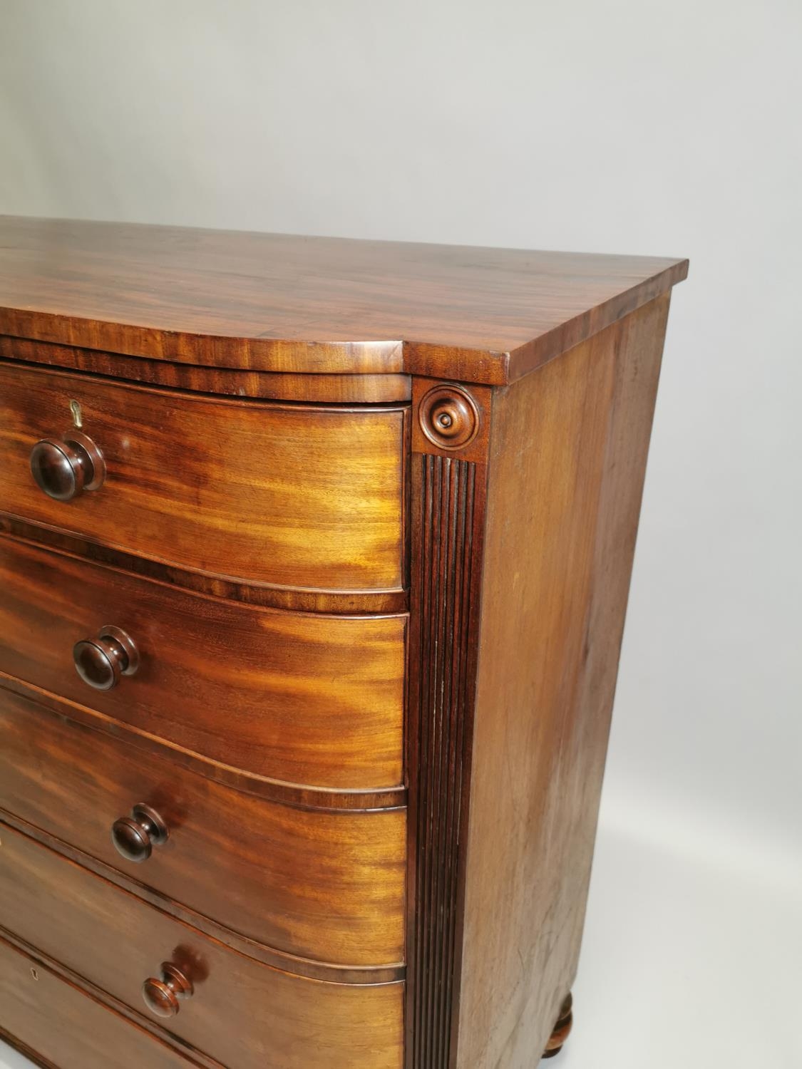 William IV mahogany chest the shaped front above the short drawers and four graduated drawers , raised on bun feet { 131cm H X 125cm W X 59cm D }.