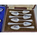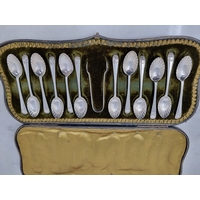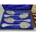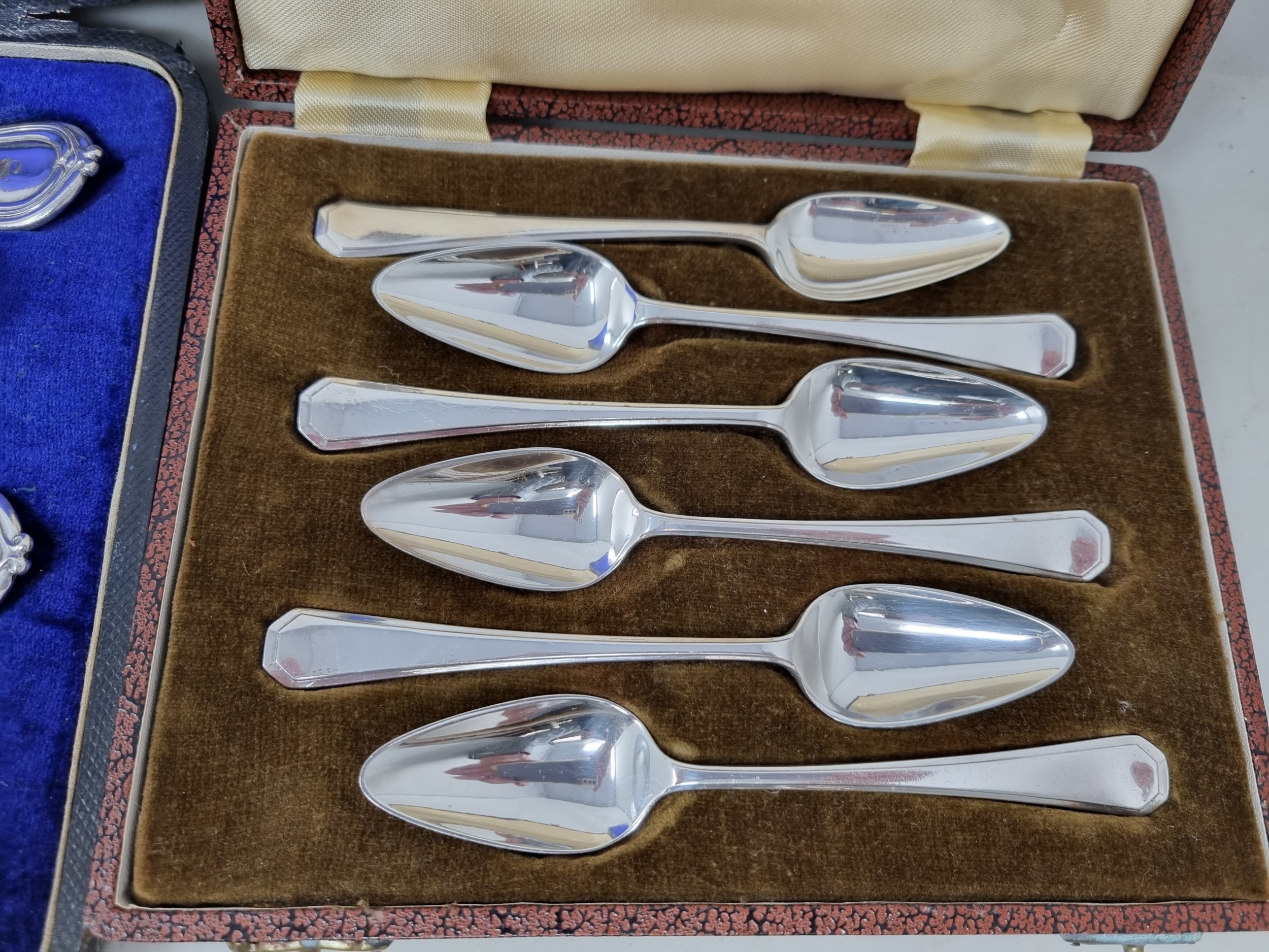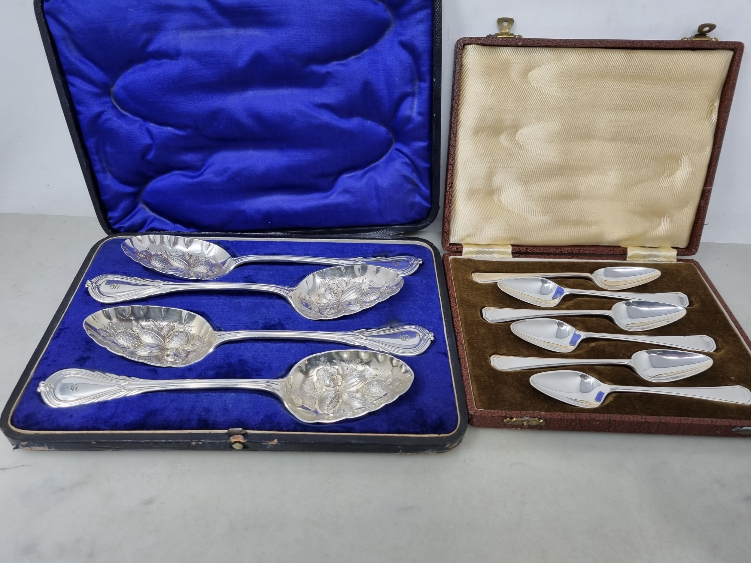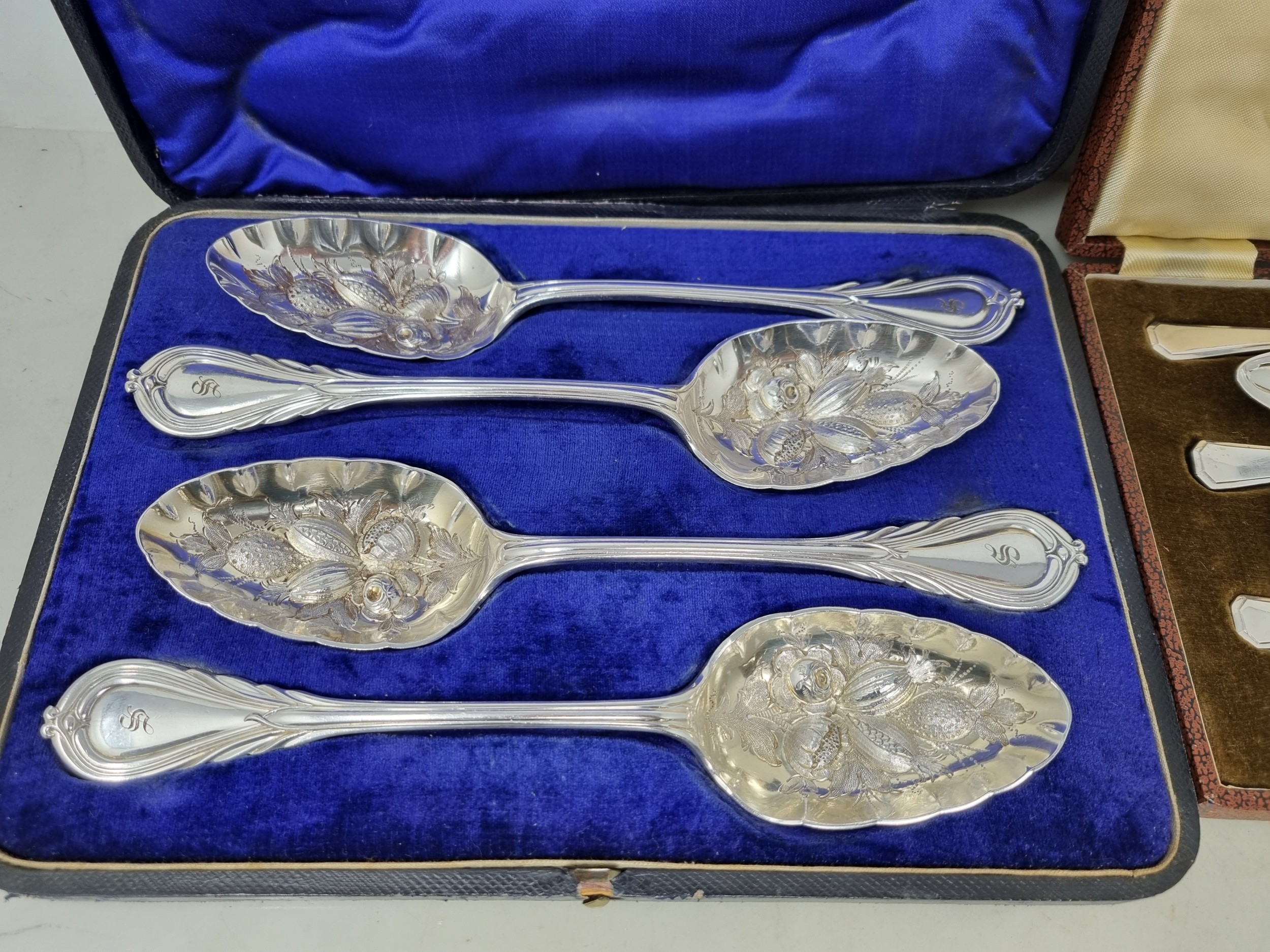 A set four plated Fruit Spoons with berry embossed bowls and engraved initial, and six plated Grapefruit Spoons, both cased