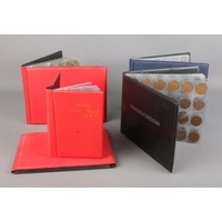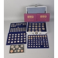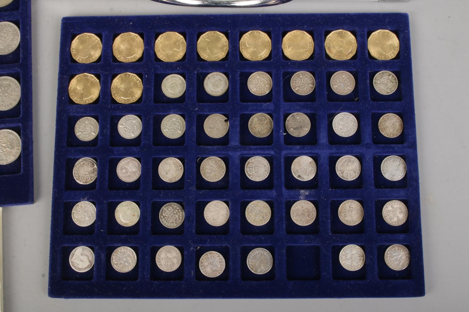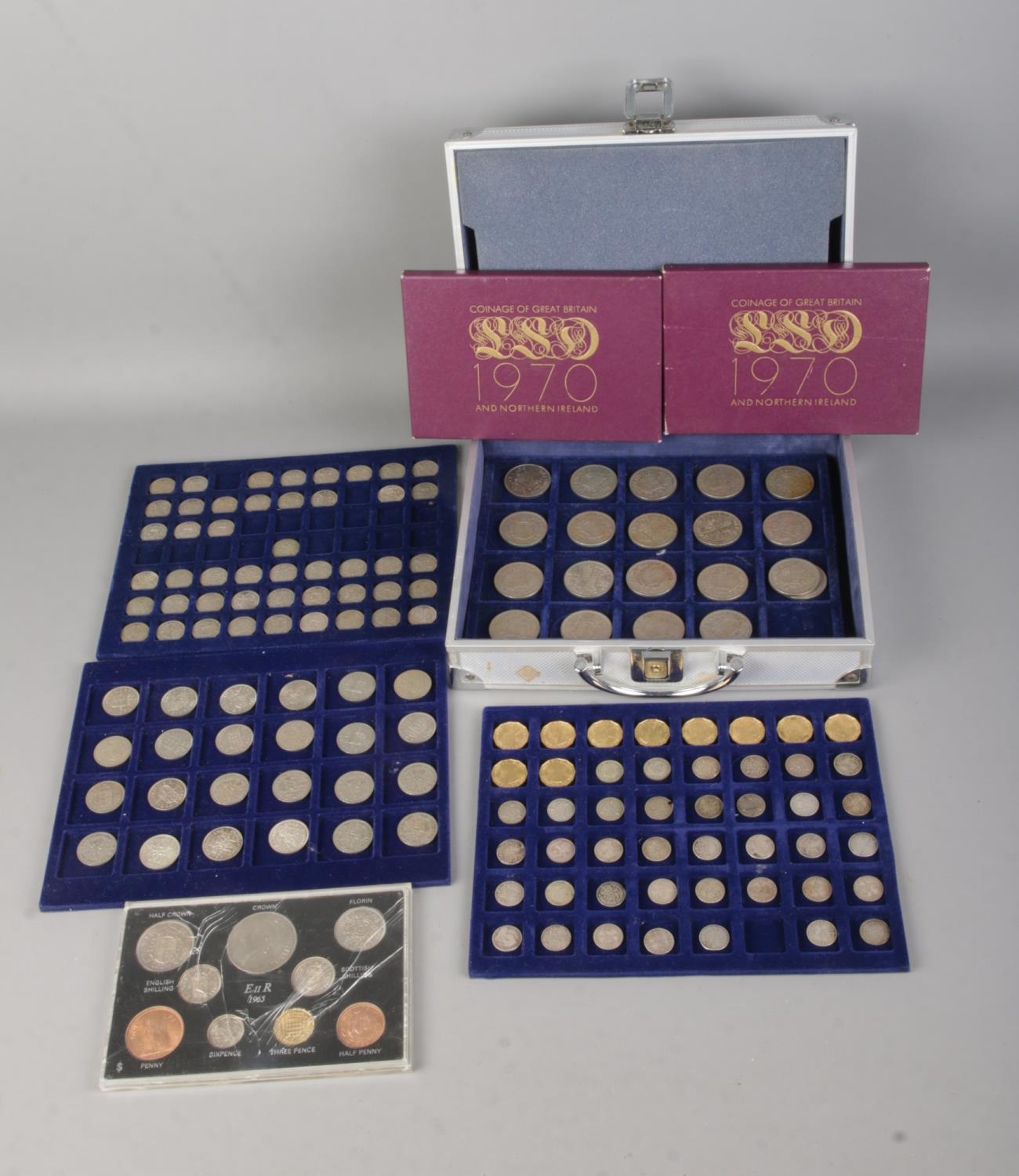 A collection of British mostly pre-decimals coins in small aluminium collectors case along with two 1970 coinage of Great Britain and Northern Ireland sets. Also includes small quantity of silver three pence coins.