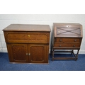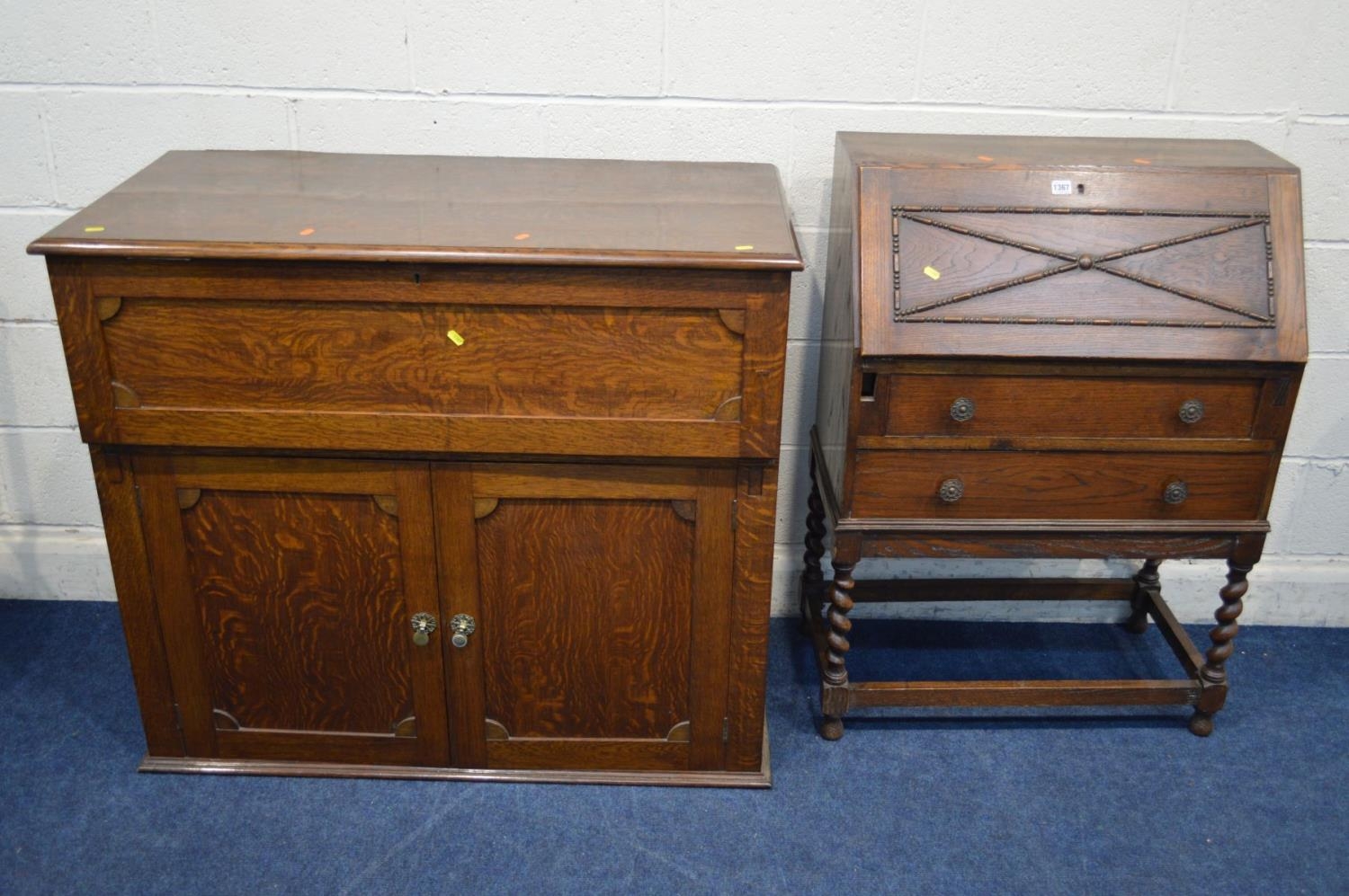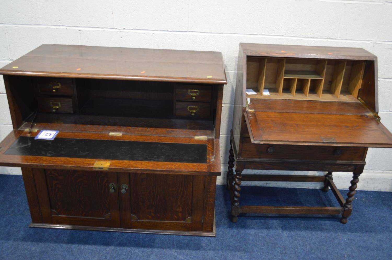 AN EARLY TO MID 20TH CENTURY OAK BUREAU with two drawers, width 74cm x depth 37cm x height 104cm together with an oak upright fall front bureau with two drawers (cabriole legs removed) (2)