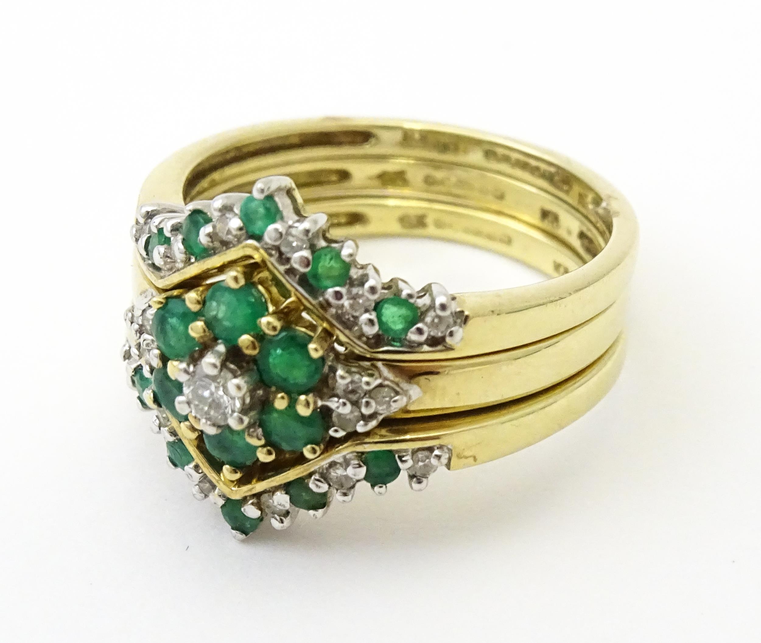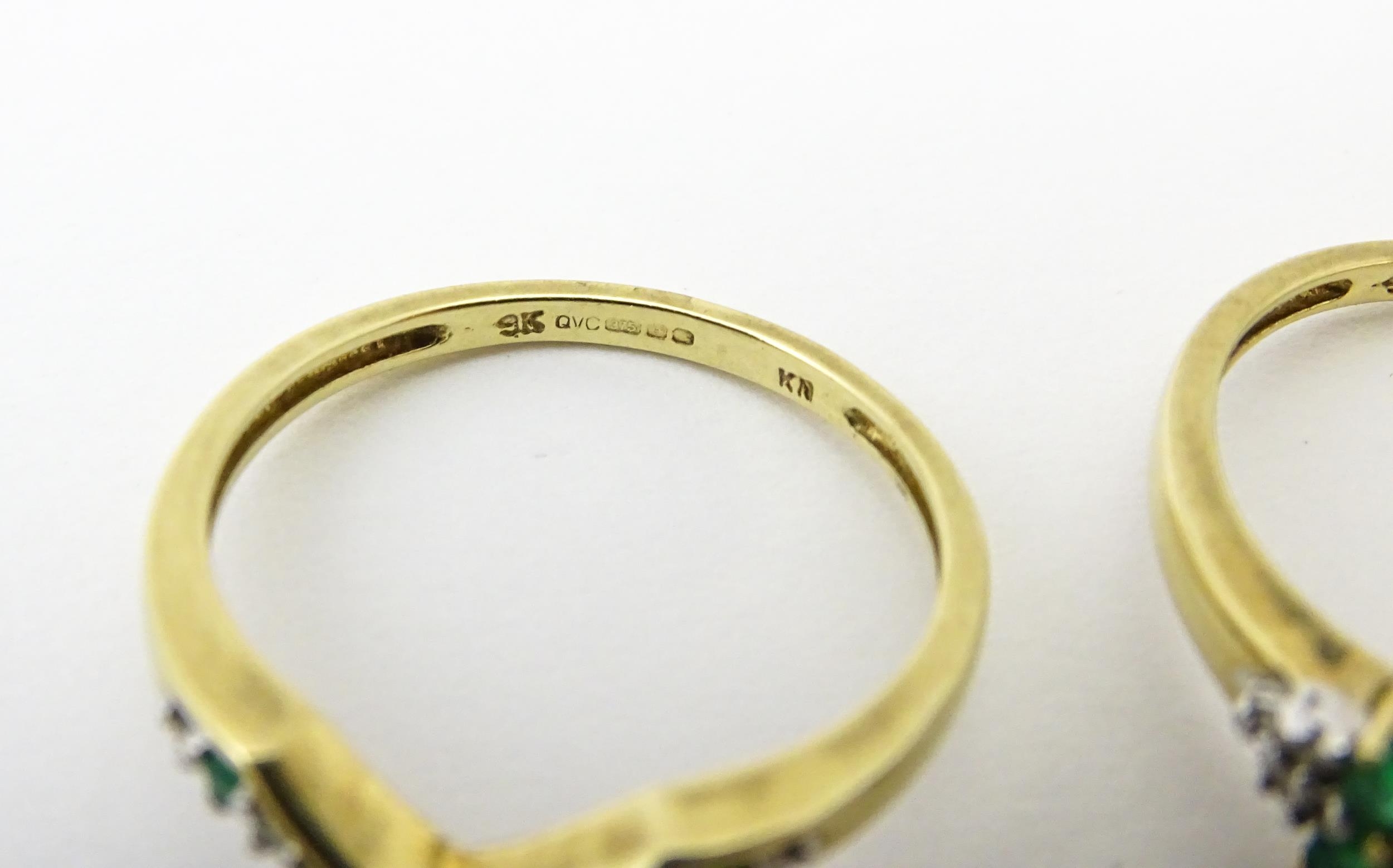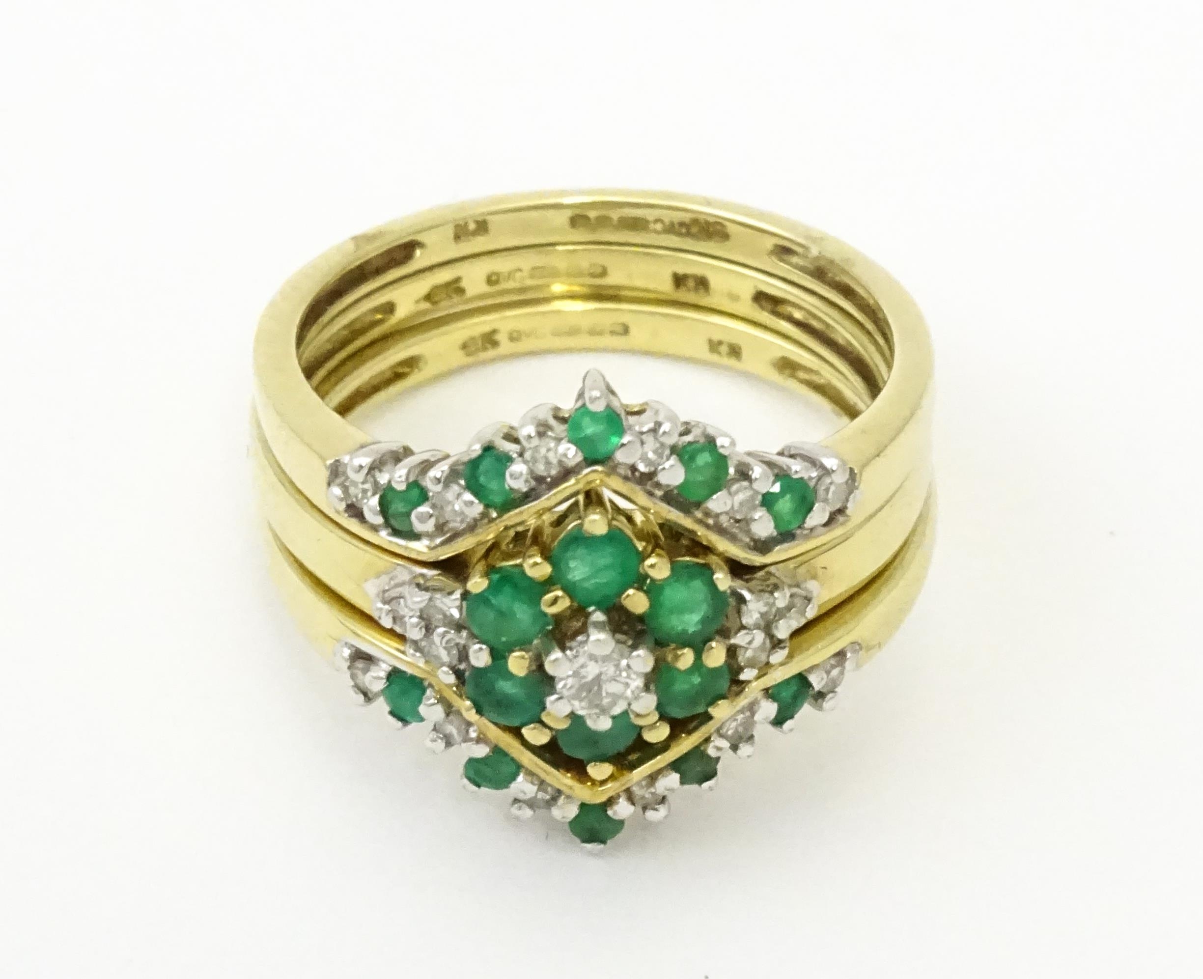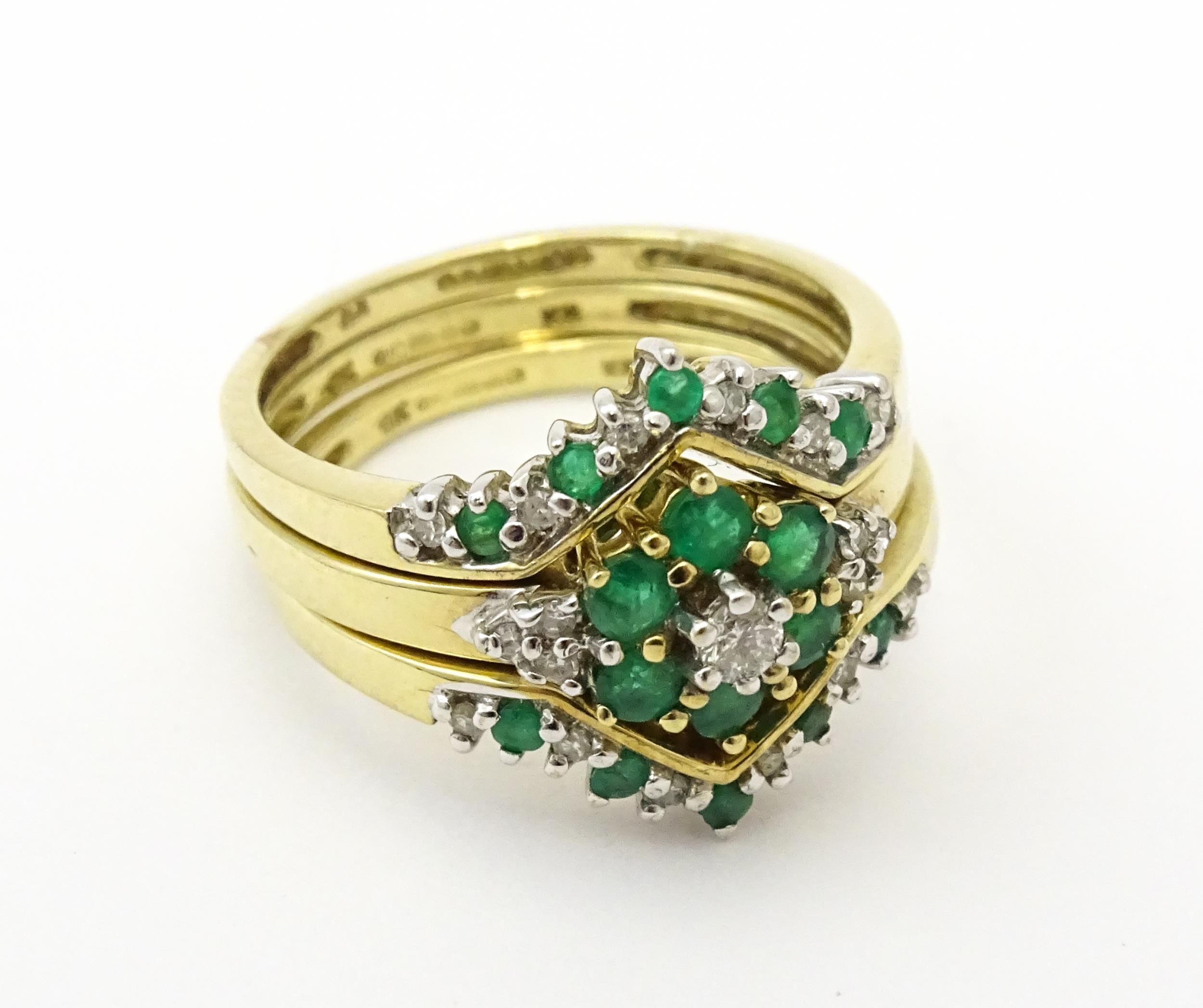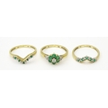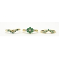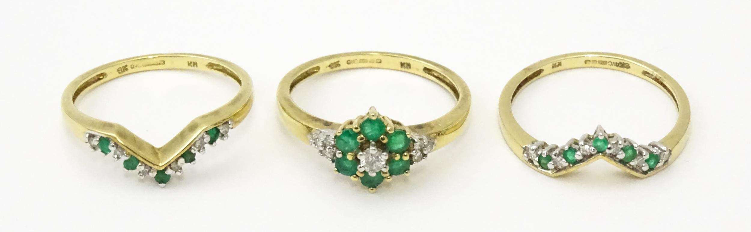 A set of three 9ct gold rings set with emeralds and diamonds. Ring size approx. P (3)