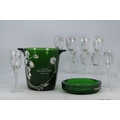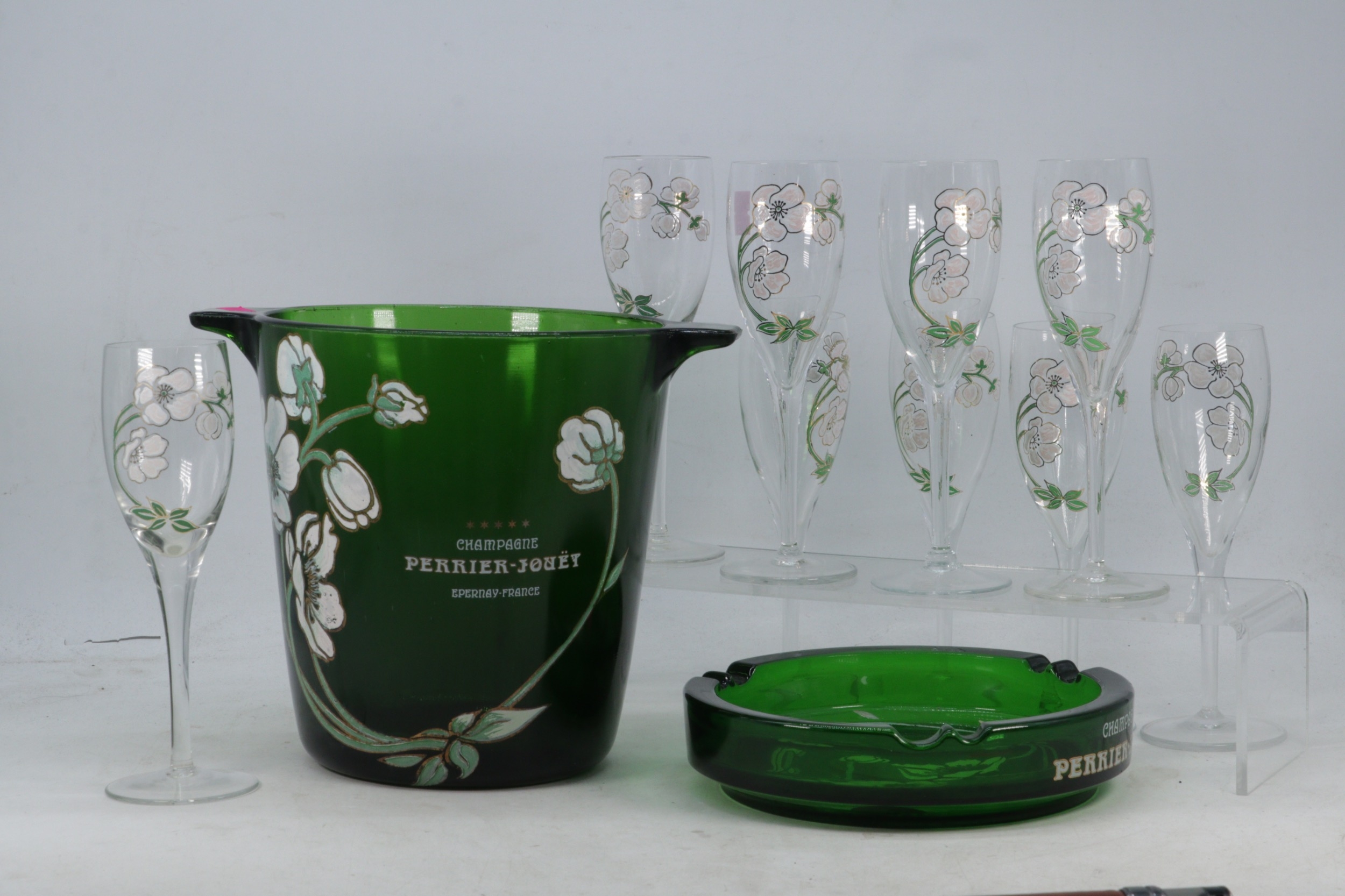 Perrier-Jouet green glass champagne bucket with matching ashtray also with 9 flutes
