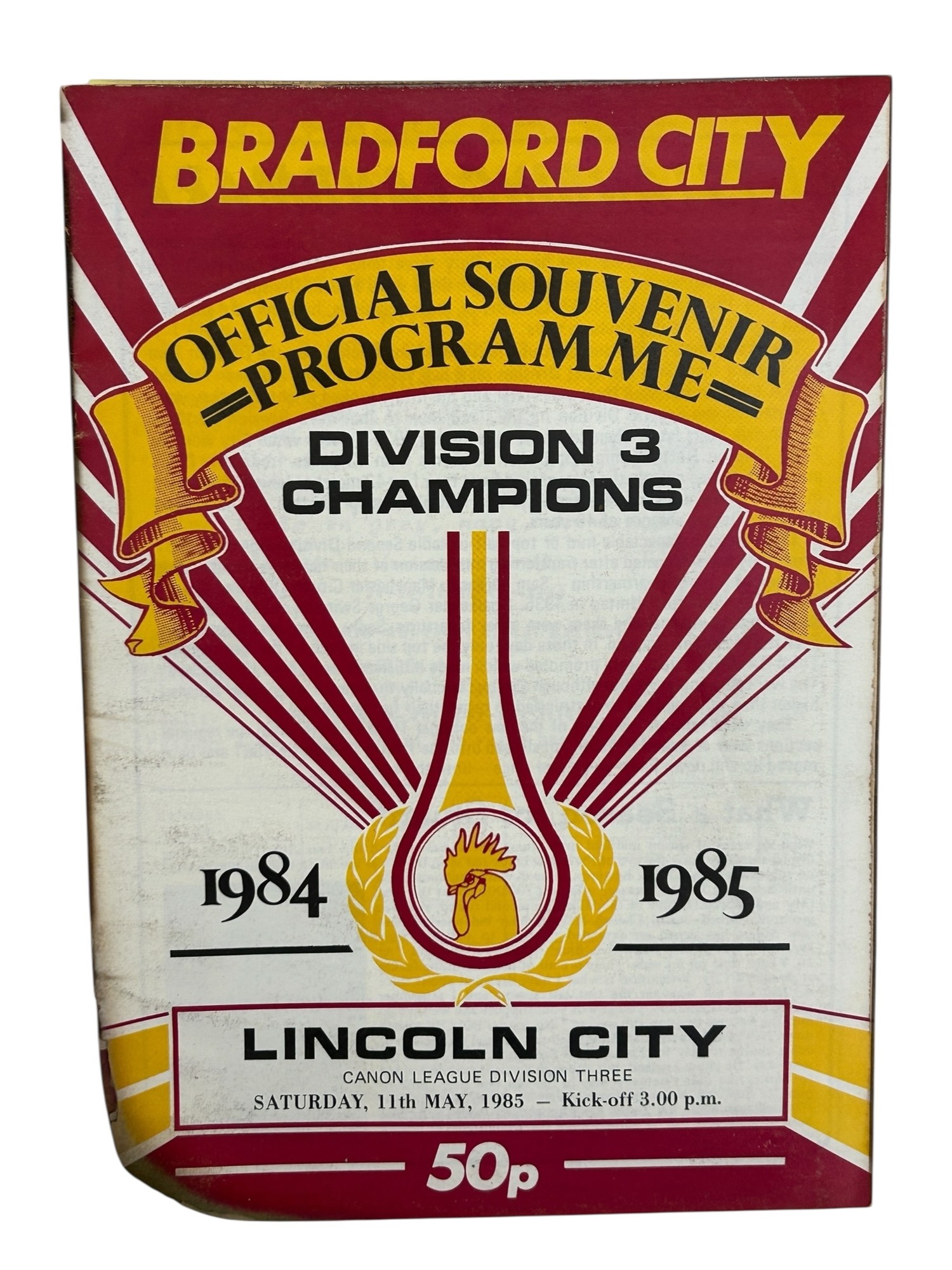 1985 BRADFORD FIRE DISASTER FOOTBALL PROGRAMME, BRADFORD CITY VERSUS LINCOLN CITY, 11/5/1985. SHOWING WEAR