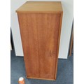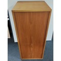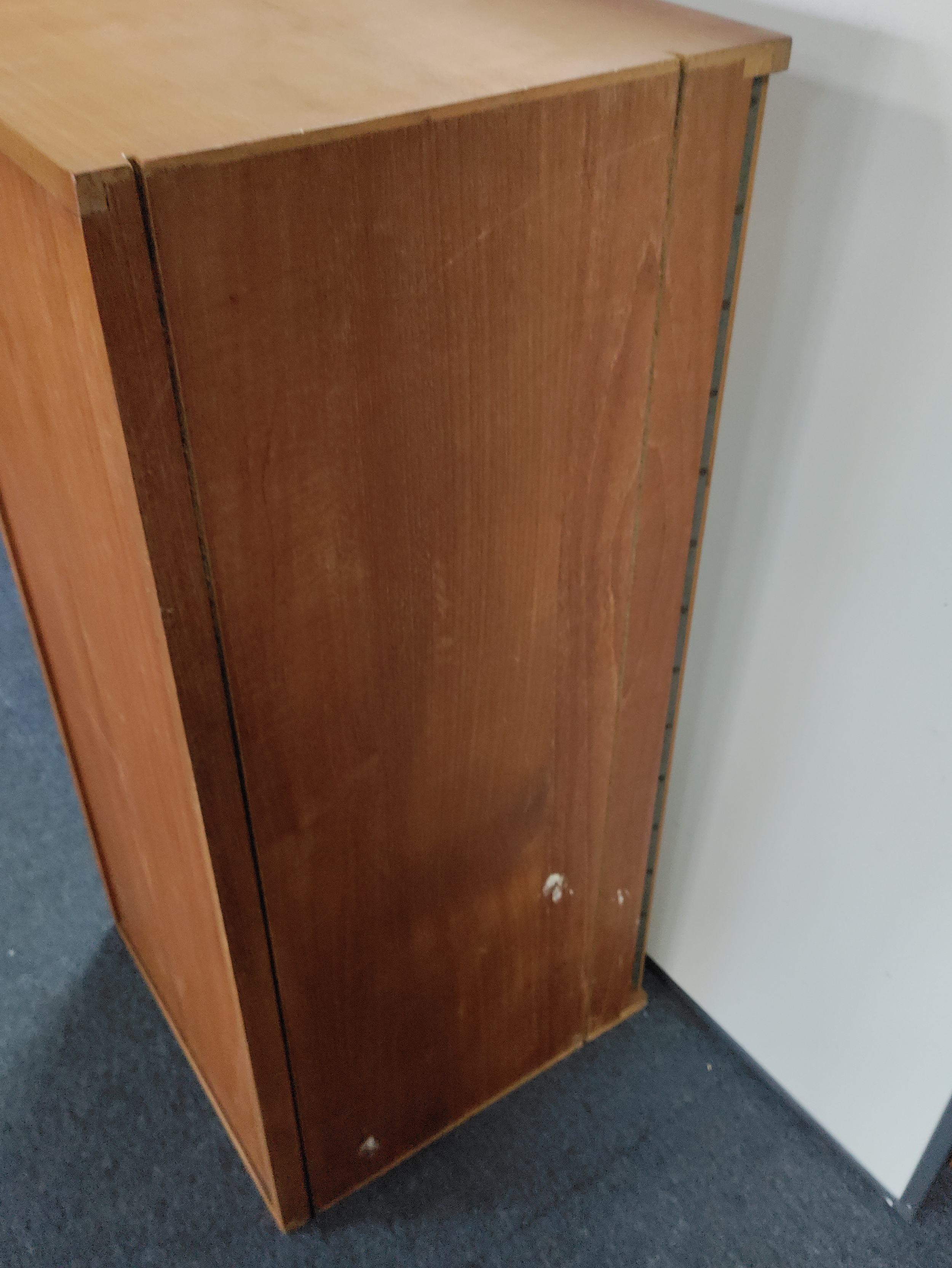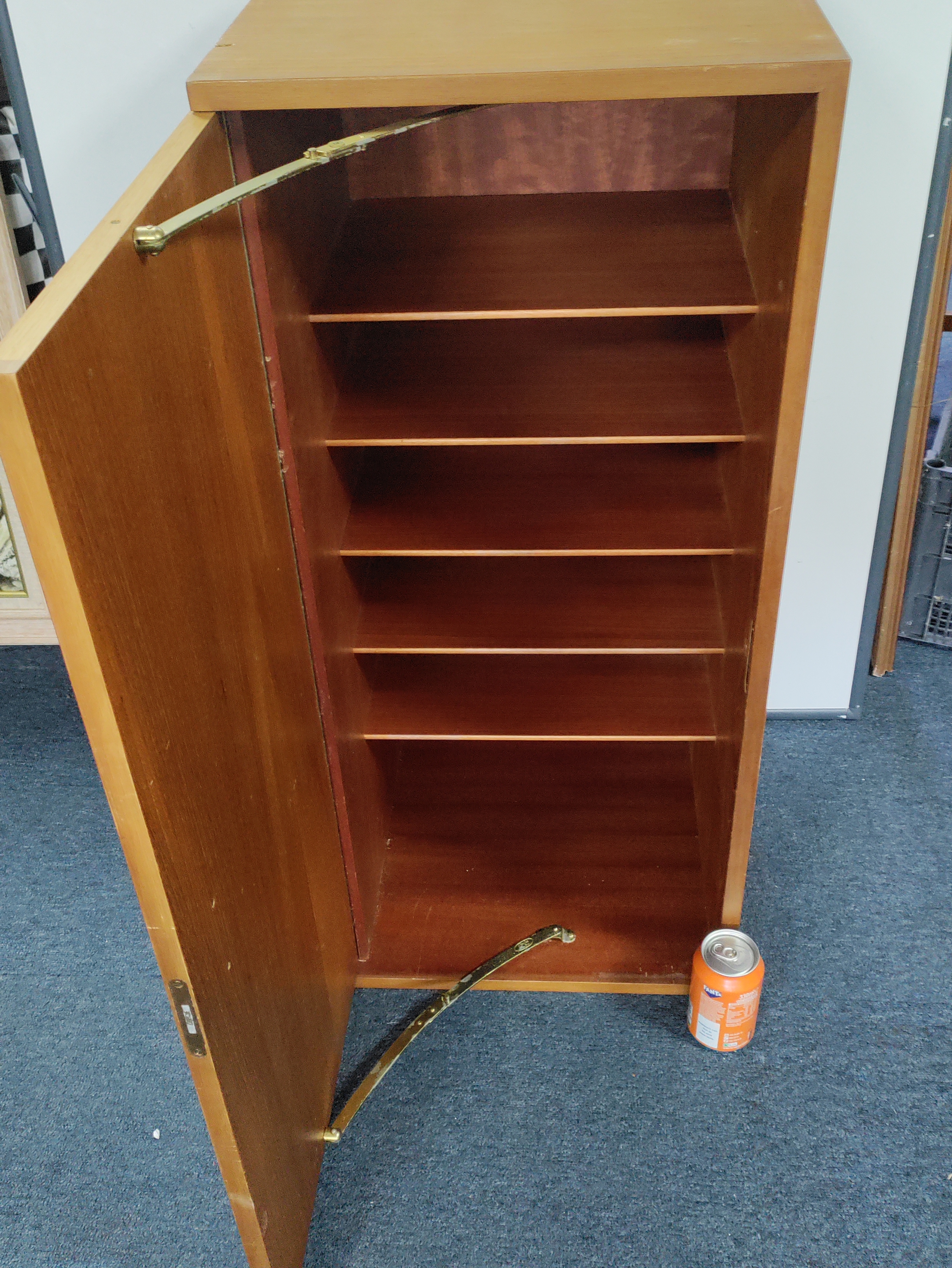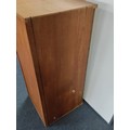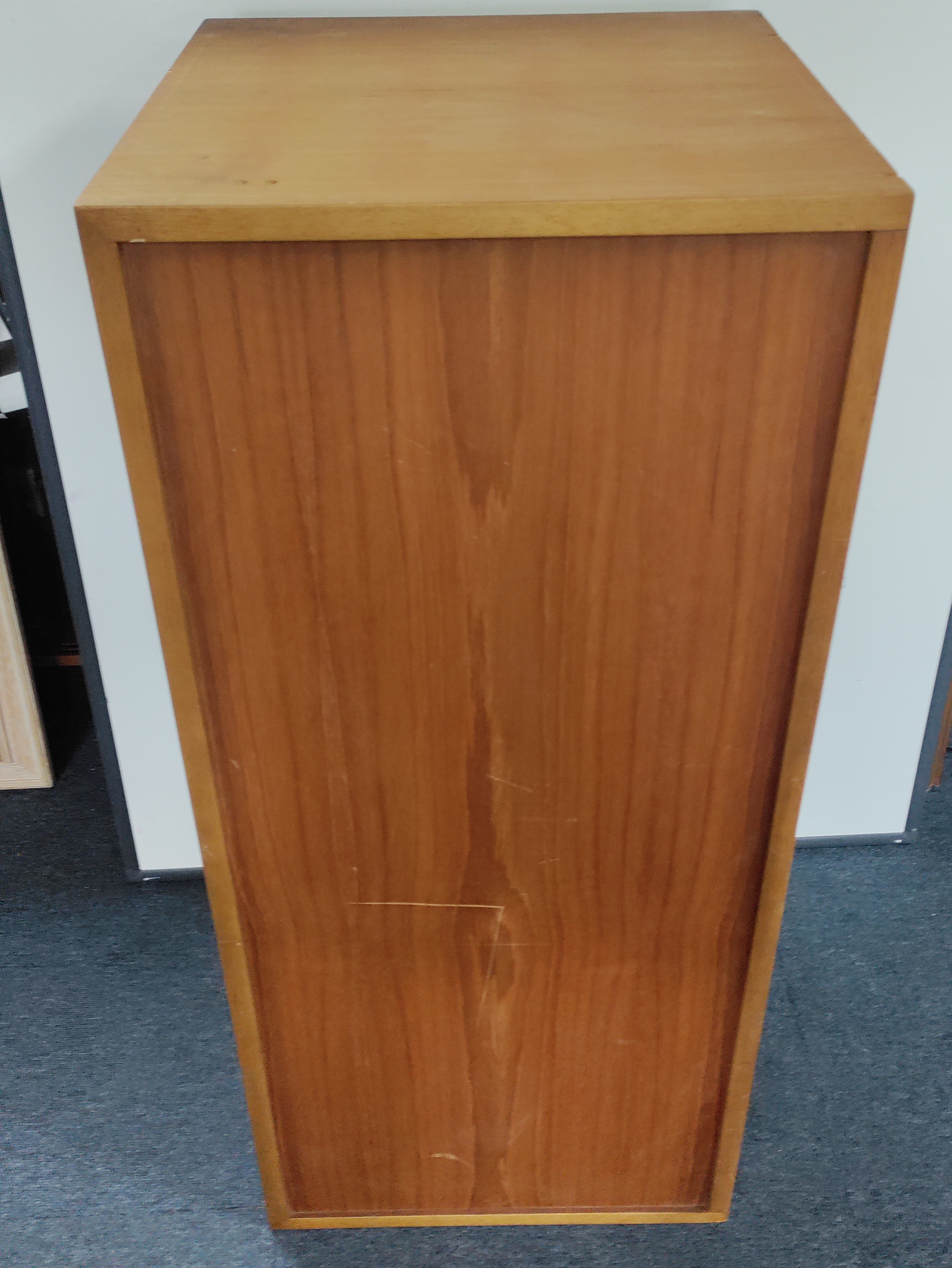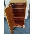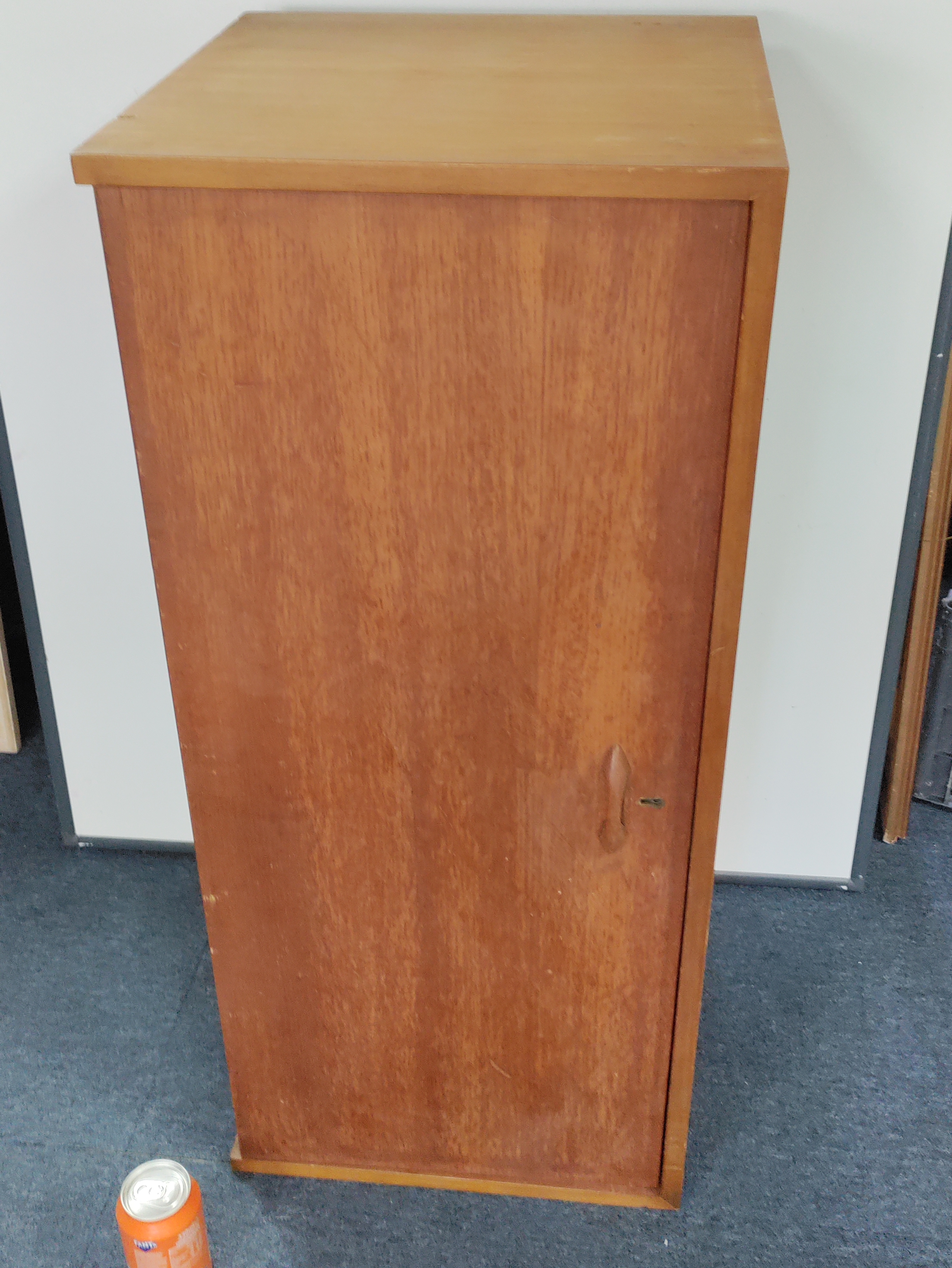 A mid century teak shelved cabinet. H 89cm x W 40cm x D 40cm.