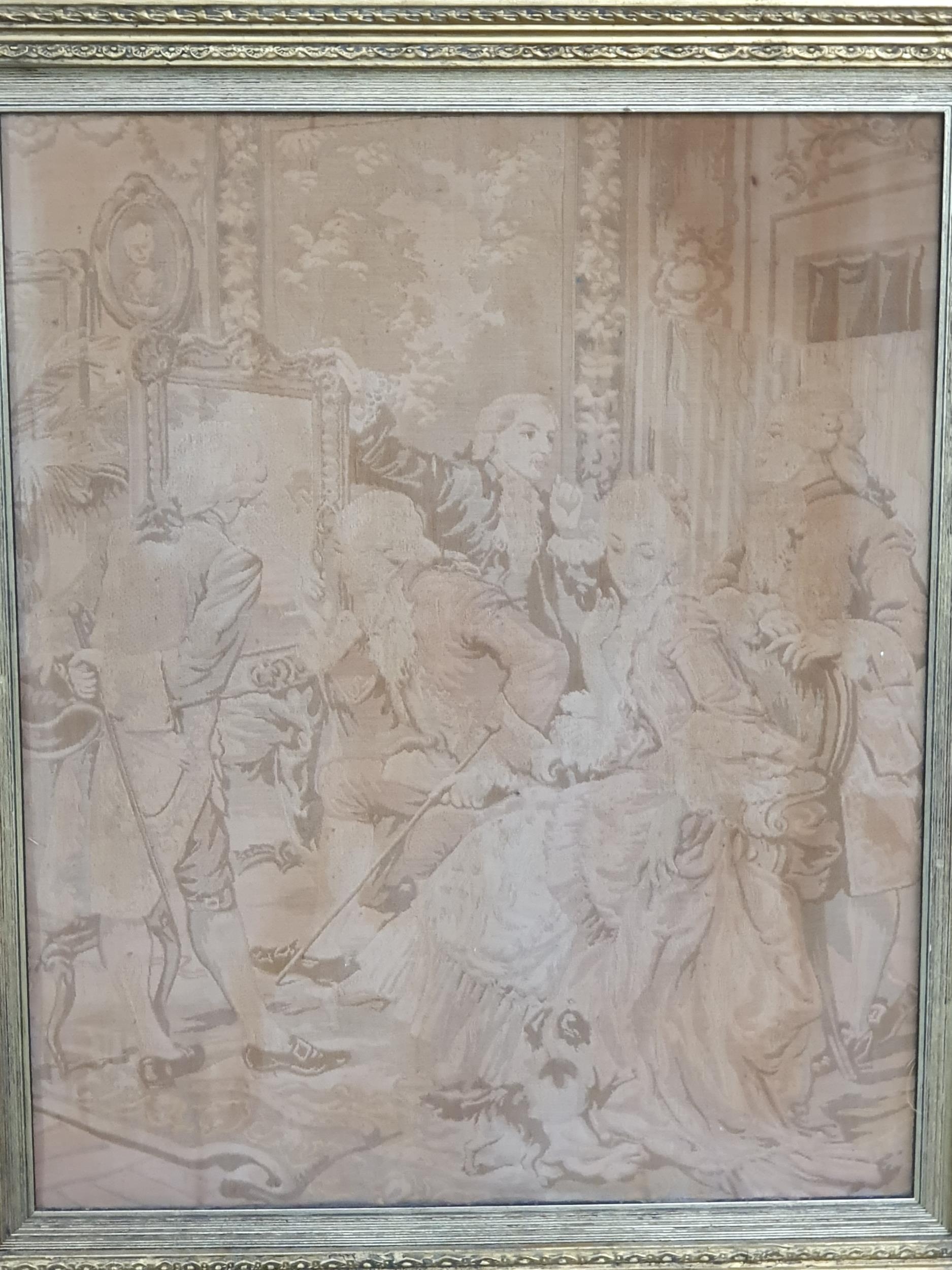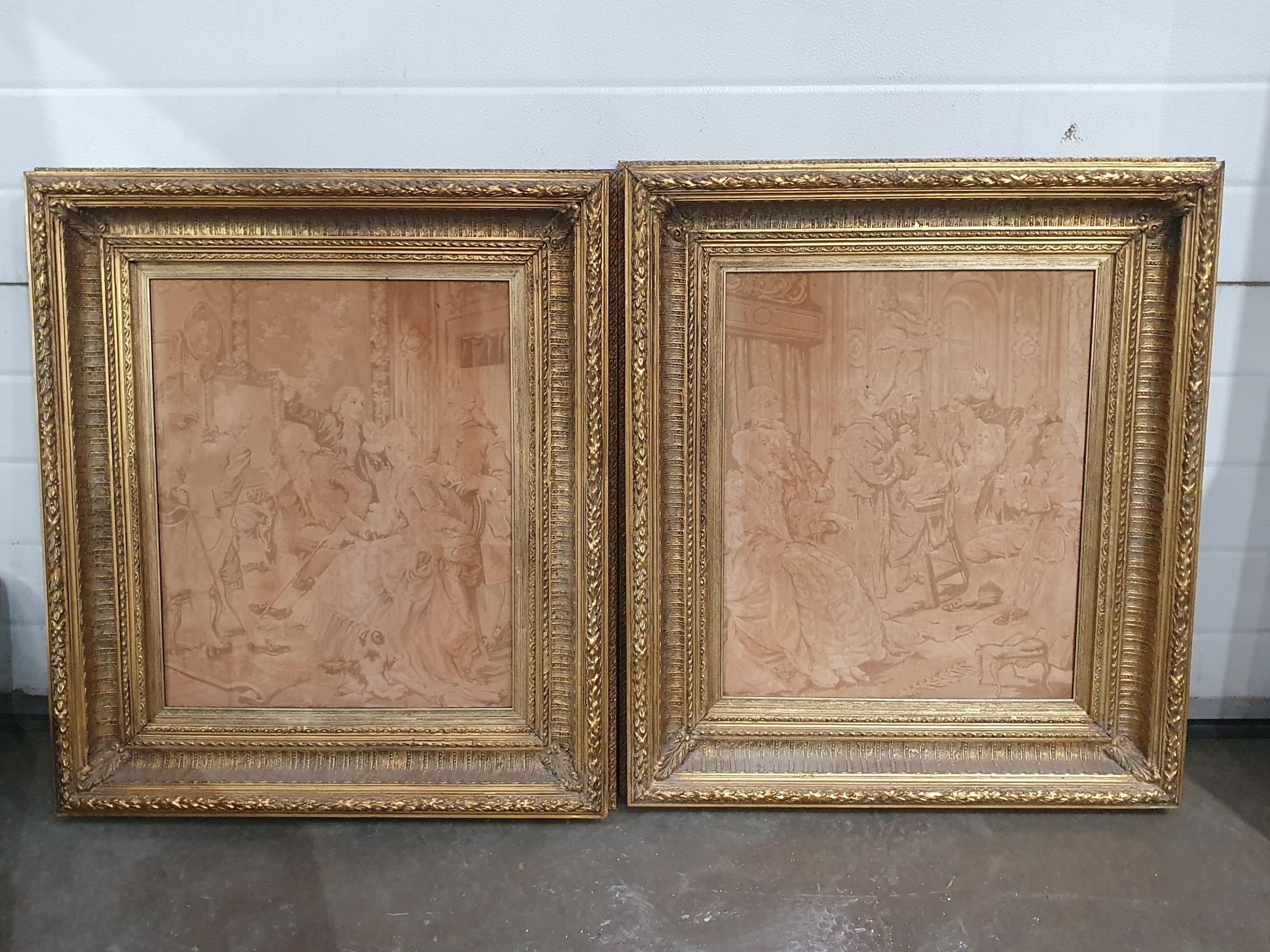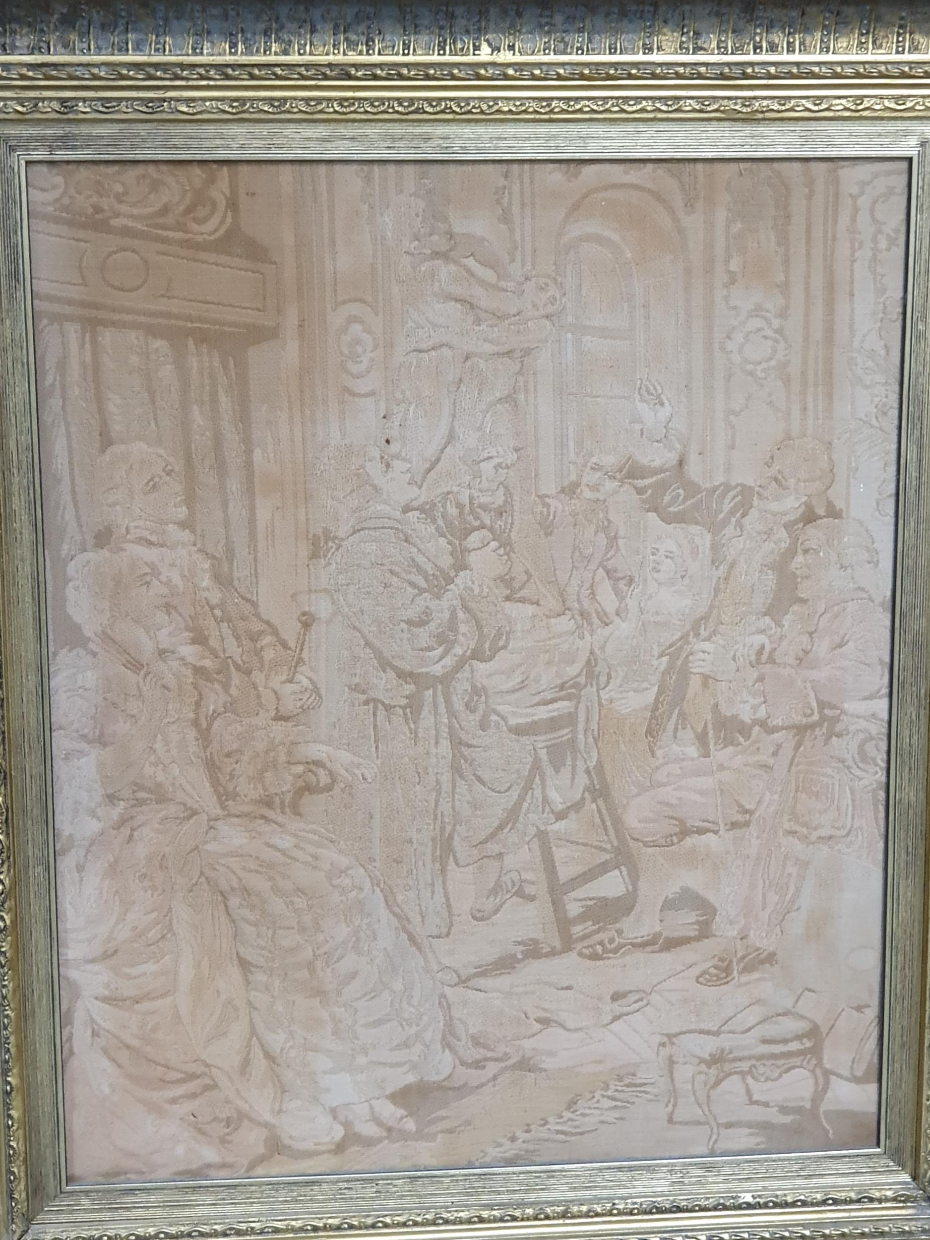 A pair of gilt framed Tapestry's of classical scenes, 2ft 8" x 2ft 4".