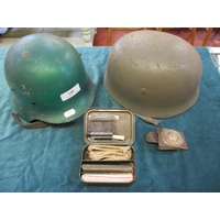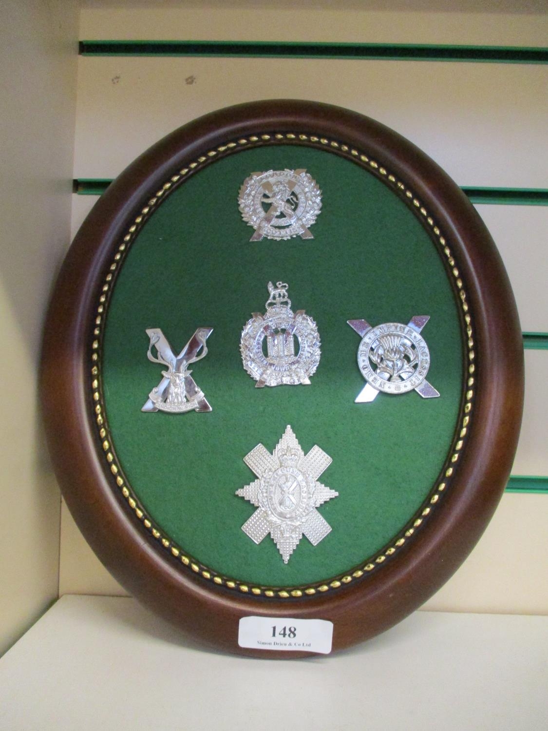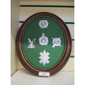 Five military badges set in a mahogany frame