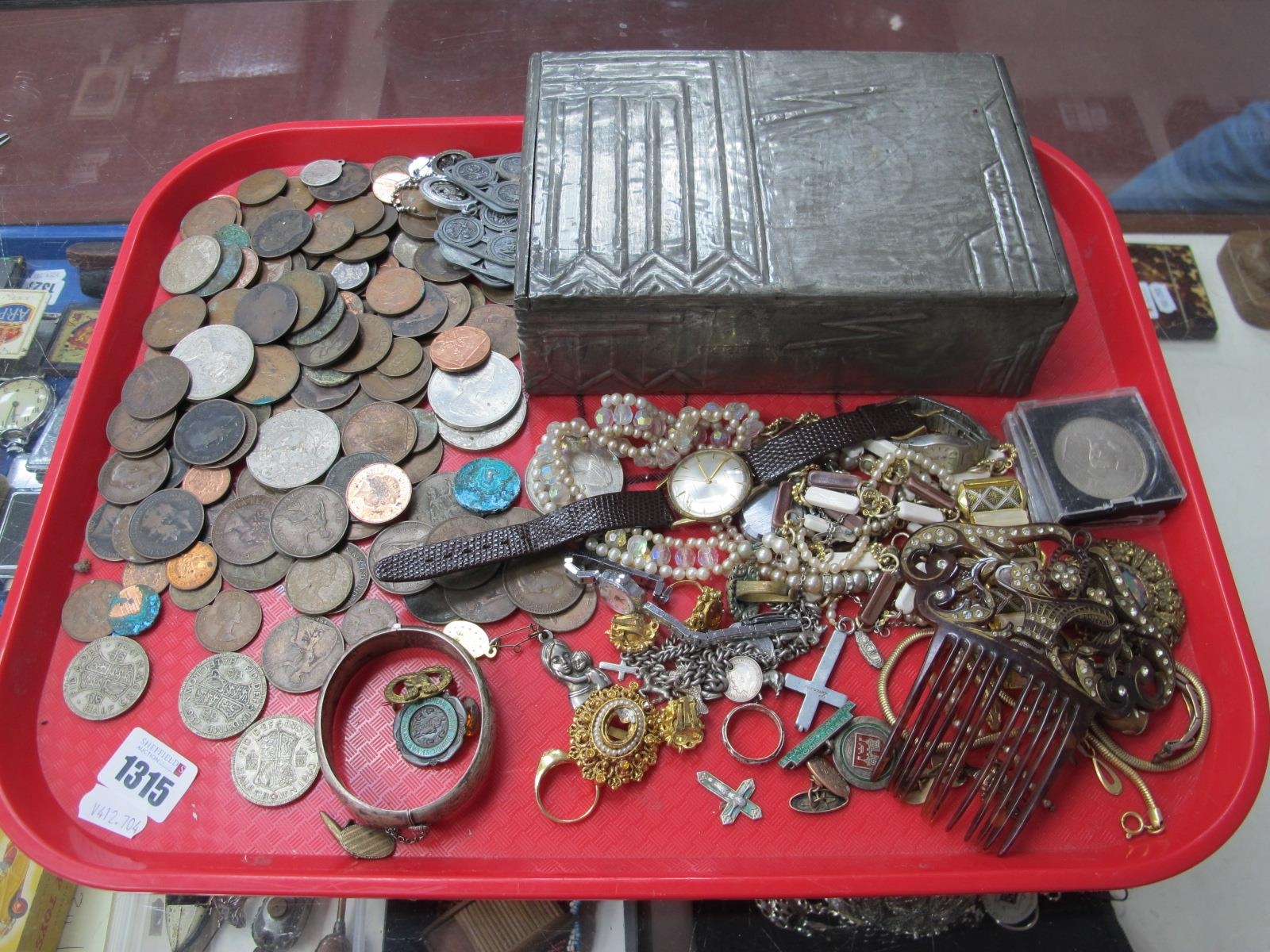 Coinage, Avia gent's wristwatch, pewter covered box, eternity ring, silver bangle, costume jewellery, etc:- One Tray.
