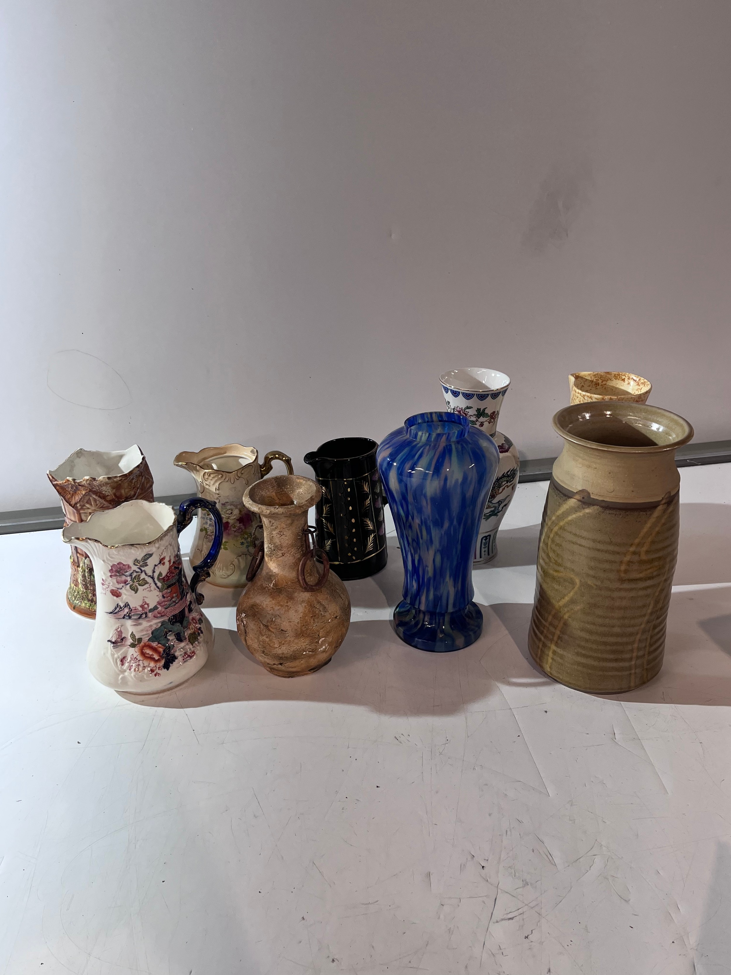 Box of assorted China & pottery jugs (some vases) inc Royal Devon, Price Cottage ware & oriental