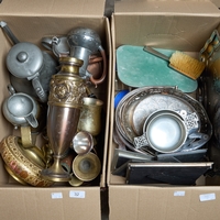 including brass carriage lamp, Art Nouveau copper vase, etc. (2 boxes)