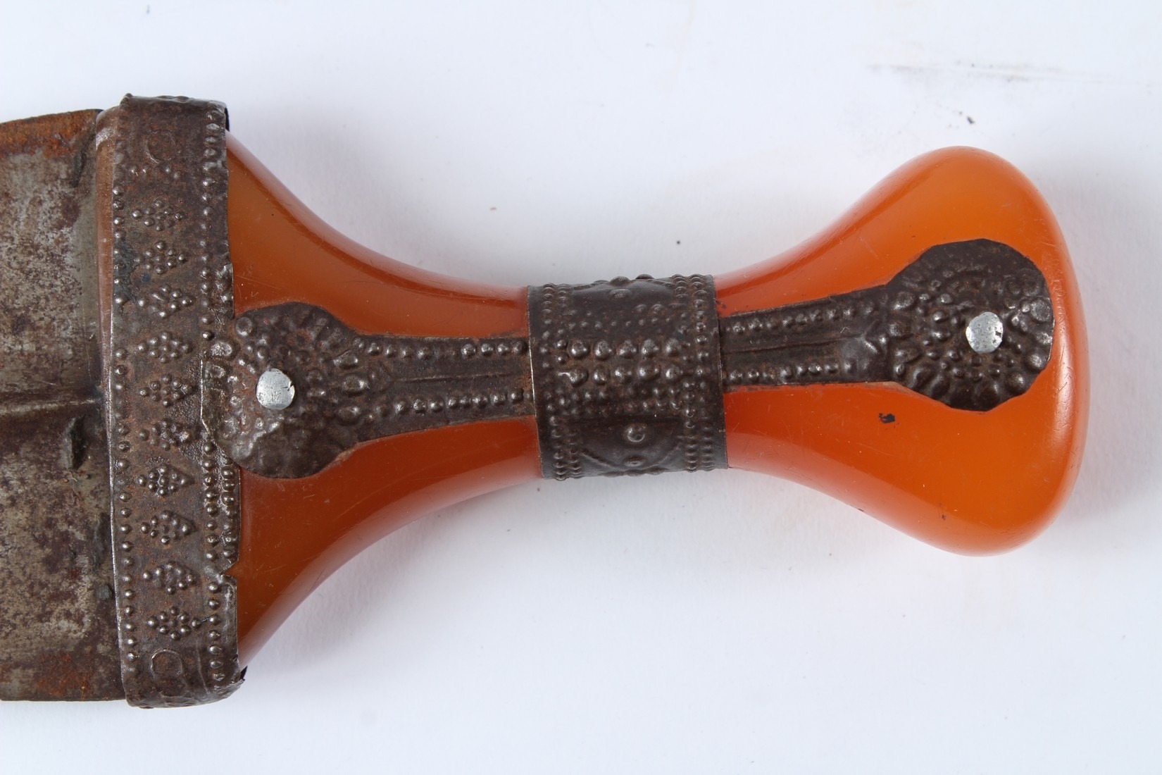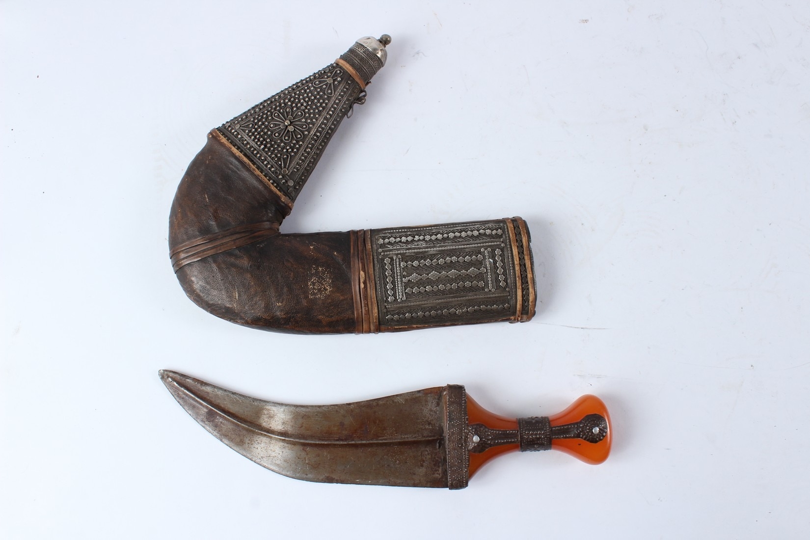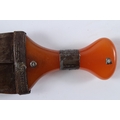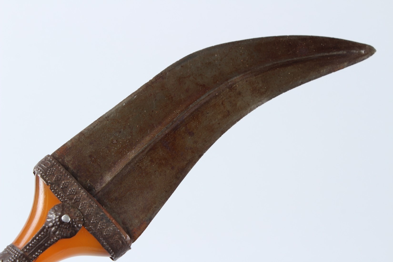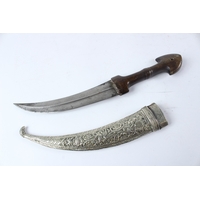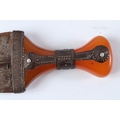 A LARGE 19TH CENTURY ARAB YEMENI JAMBIYA DAGGER with Bakelite handle and silver mounts.