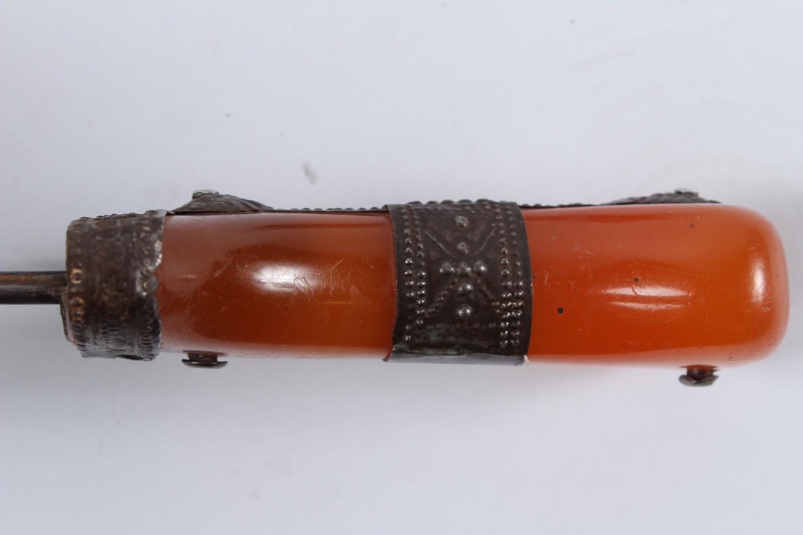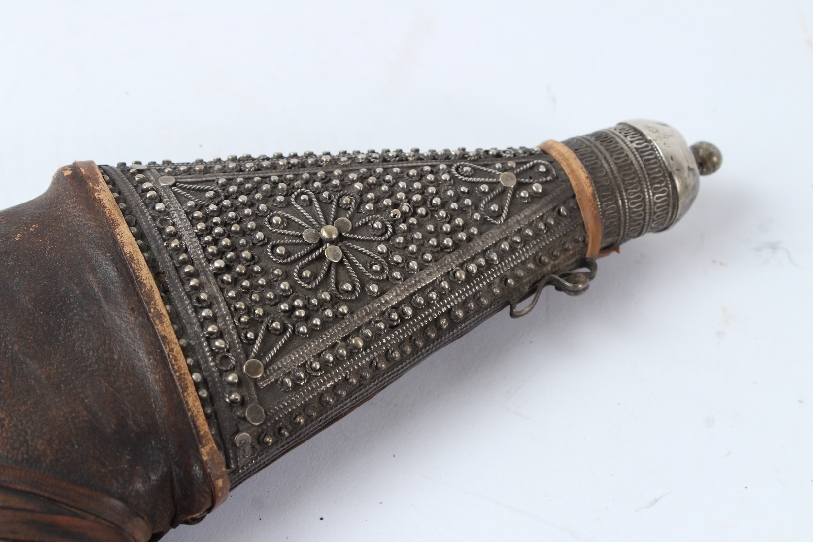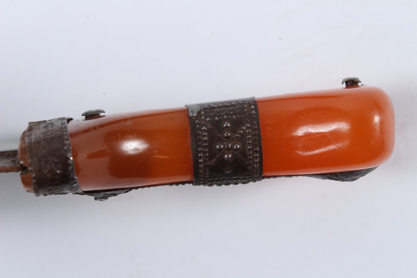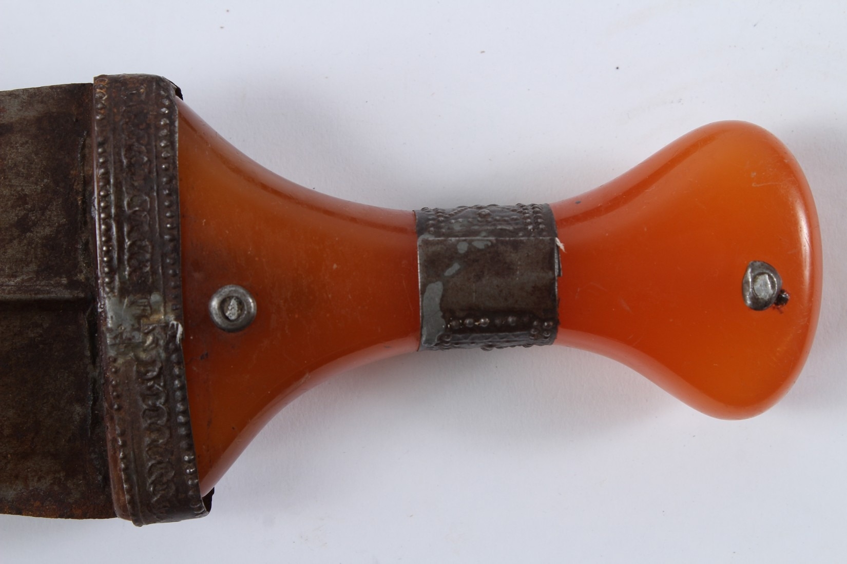 A LARGE 19TH CENTURY ARAB YEMENI JAMBIYA DAGGER with Bakelite handle and silver mounts.