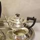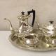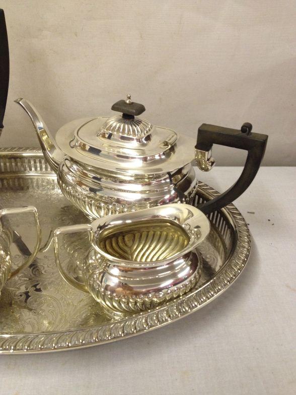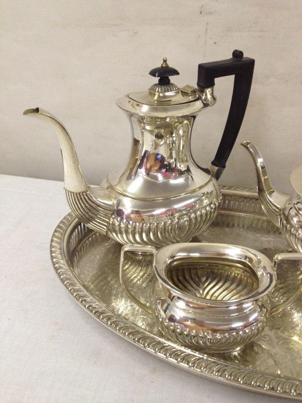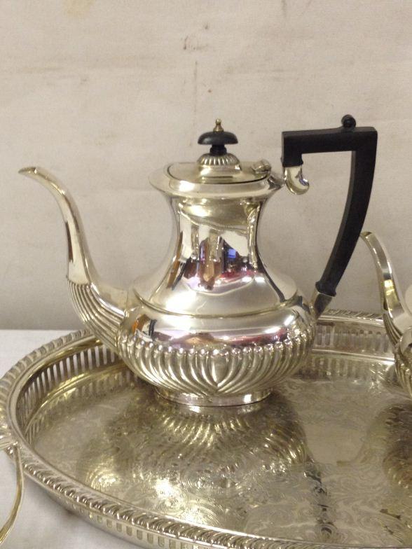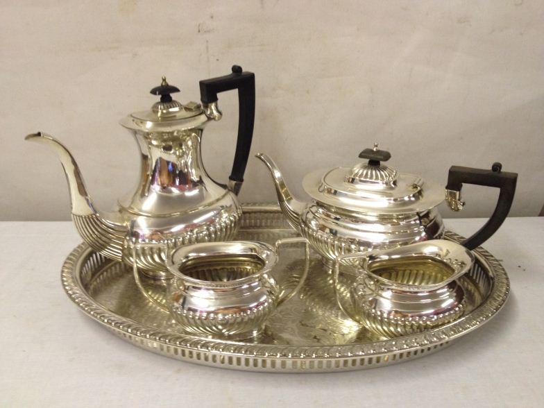 4 Piece Silver Plated Tea / Coffee Set With Sugar And Milk Jugs Together With Pierced Rim Silver Plated Tray / Salver