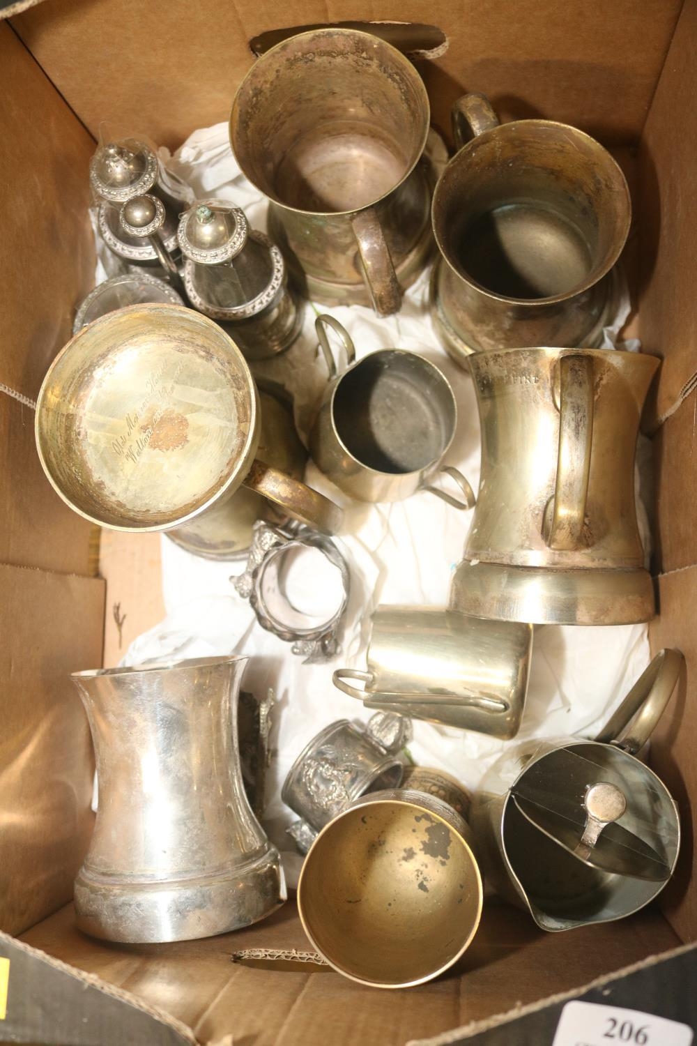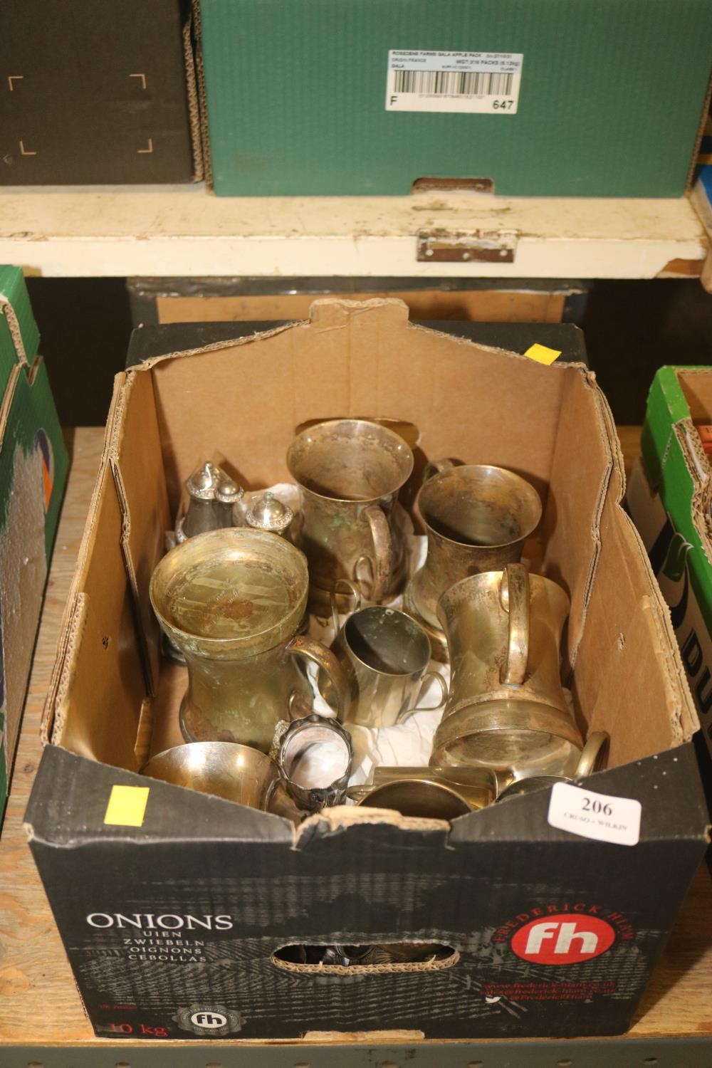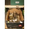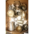BOX OF METALWARE INCLUDING TANKARDS FROM THE OLD MANOR HOUSE, WALTON UPON THAMES