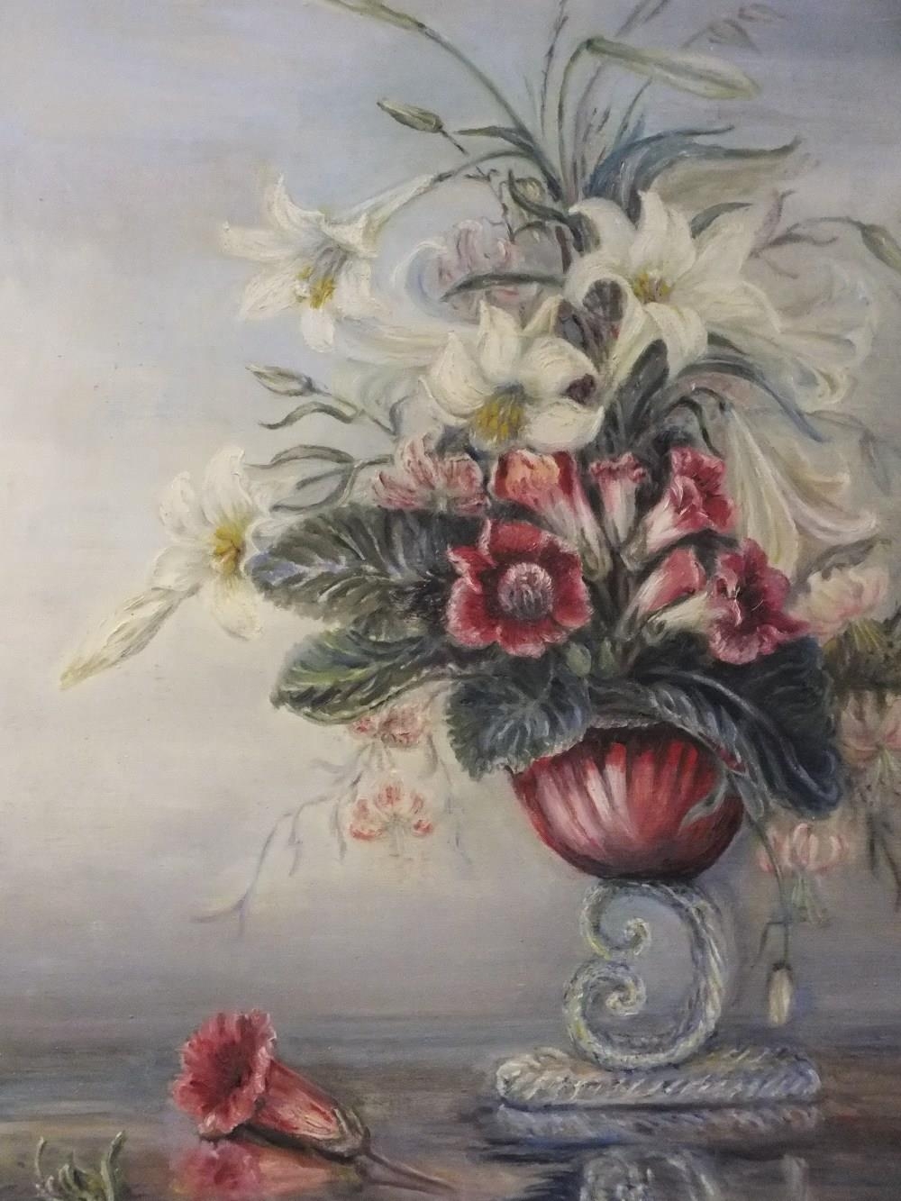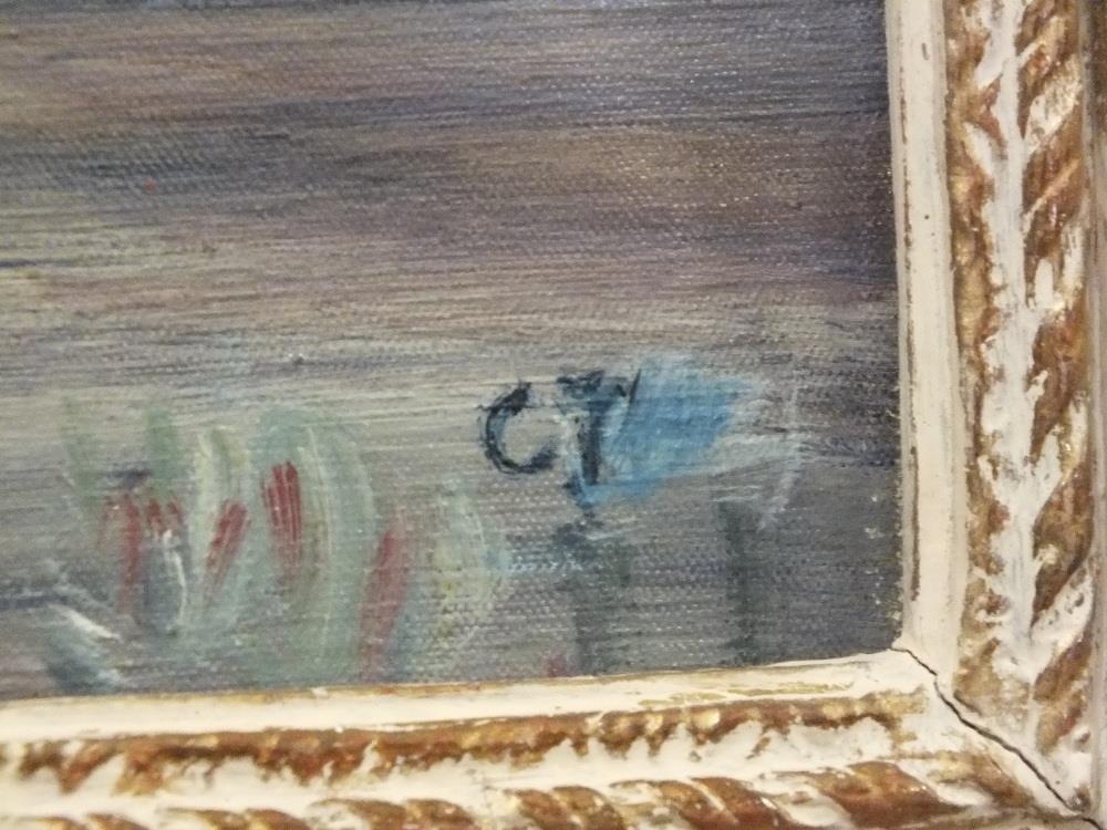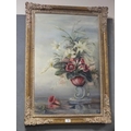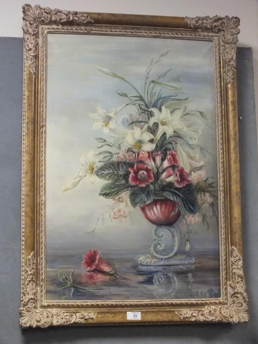 A LARGE GILT FRAMED STILL LIFE FLORAL OIL ON CANVAS MONOGRAMMED 'CJ' LOWER RIGHT 75 X 49.5 CM