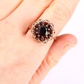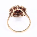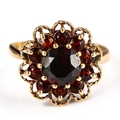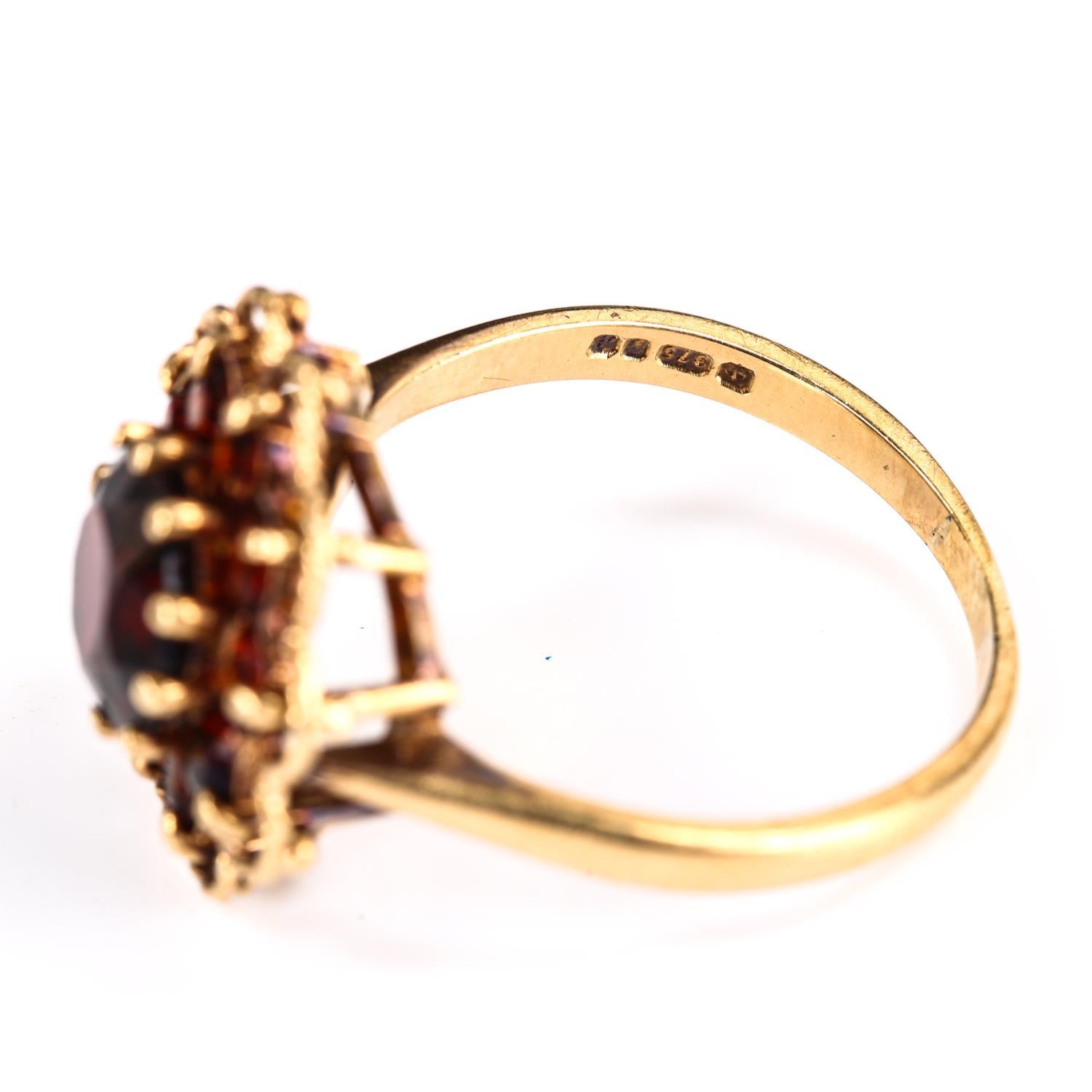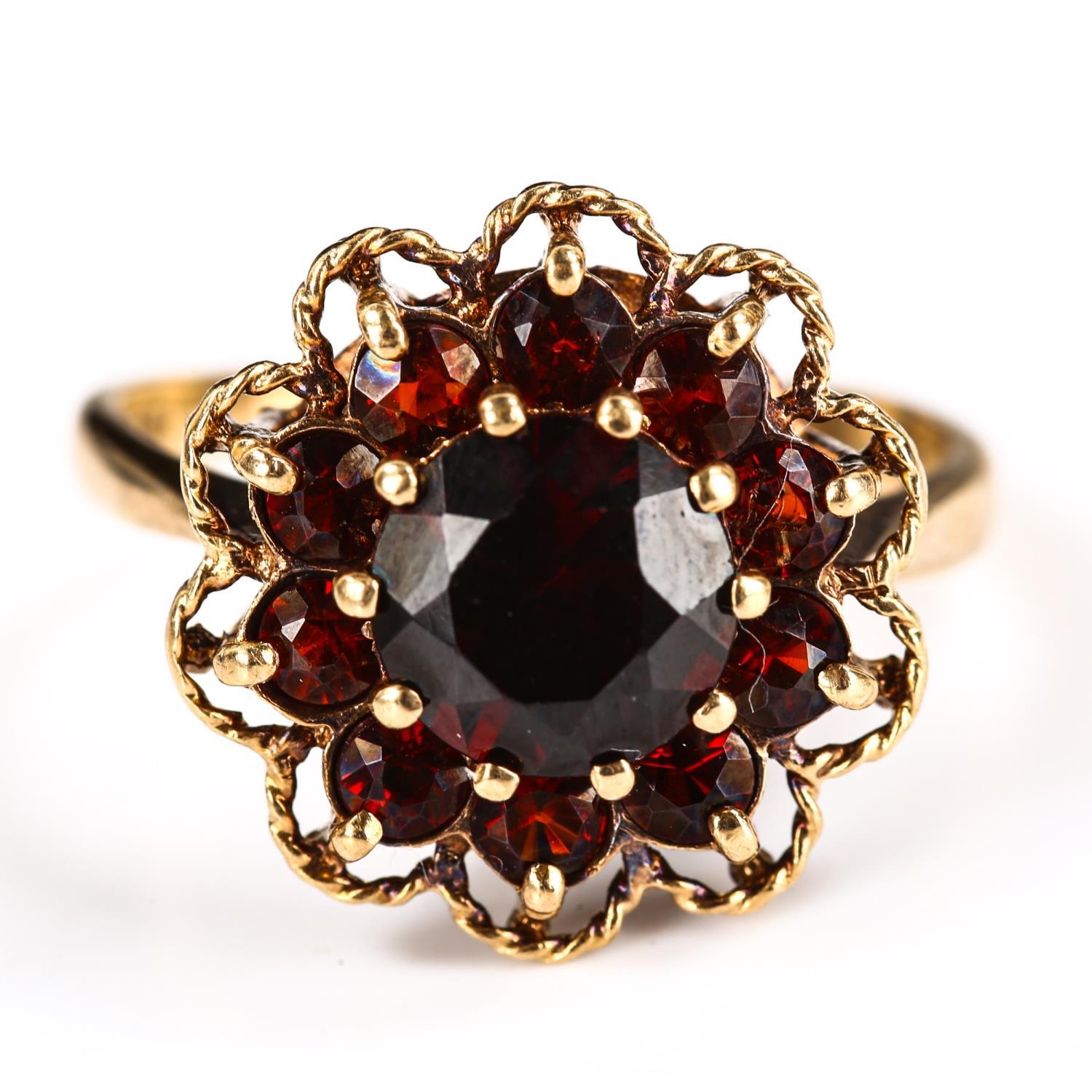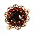 A late 20th century 9ct gold garnet cluster flowerhead ring, set with round-cut garnets, hallmarks London 1975, setting height 17.6mm, size S, 4.7g