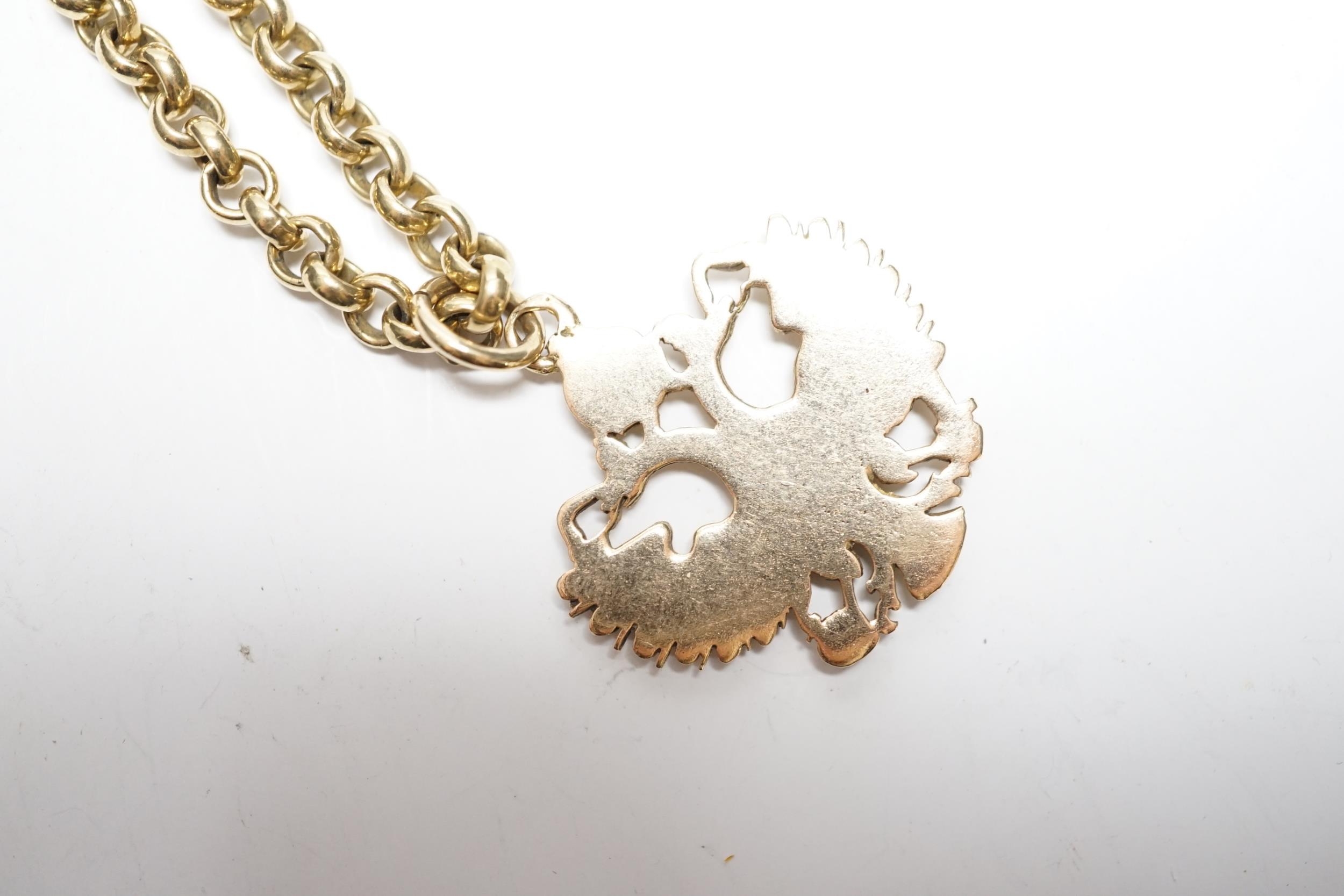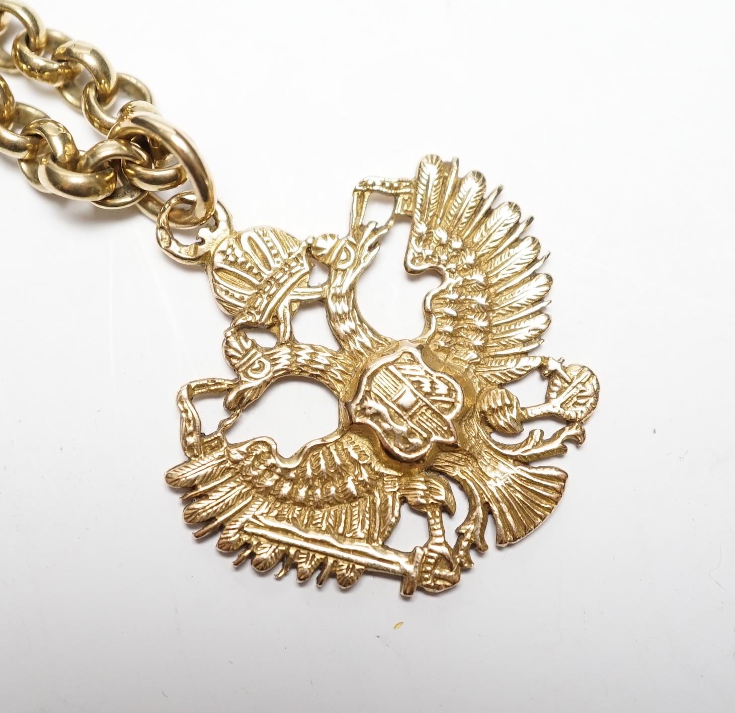 An Austrian yellow metal double eagle pendant, width 31mm, on a 9ct gold belcher link chain, 62cm, gross weight 52.1 grams.