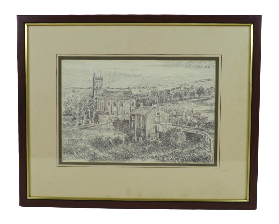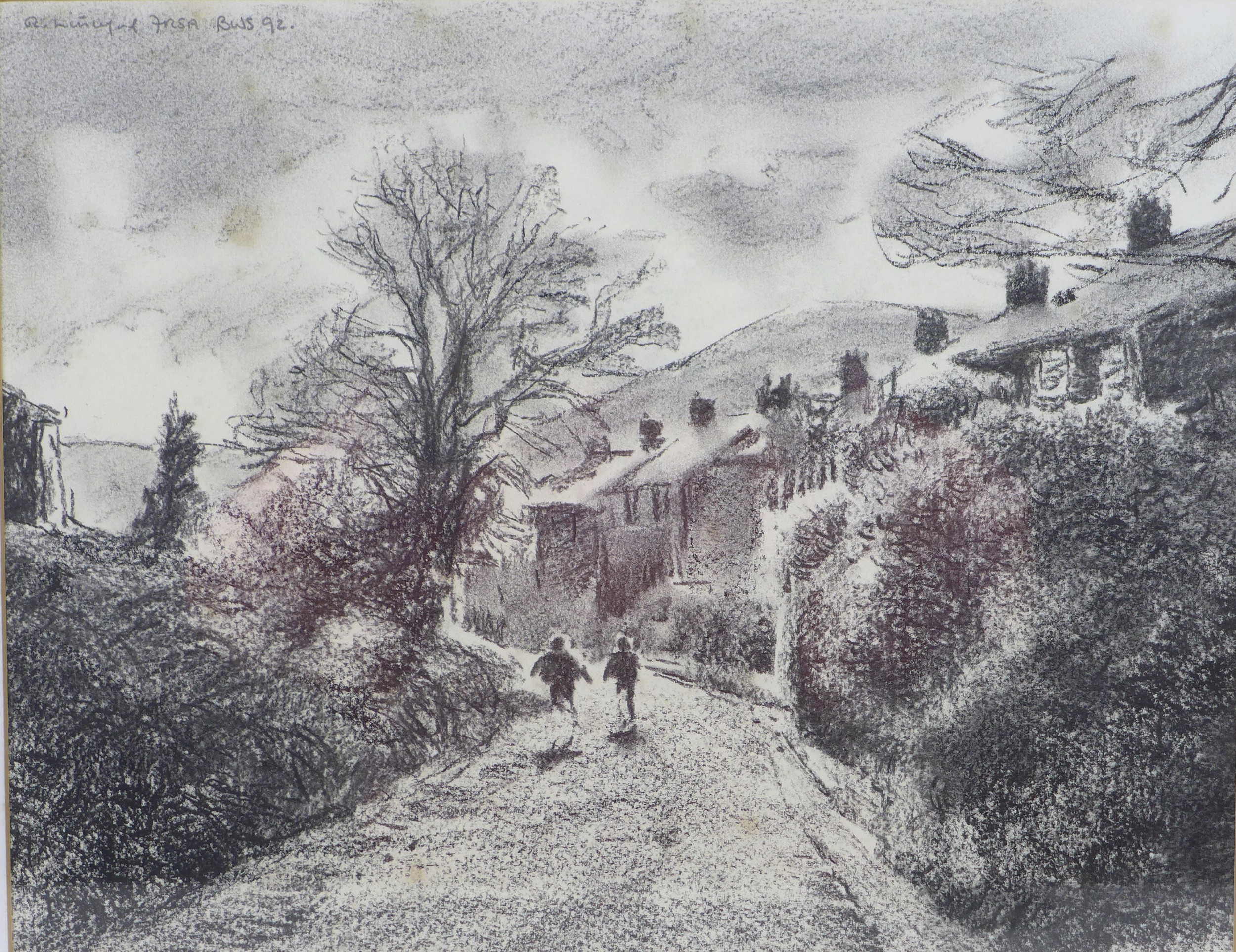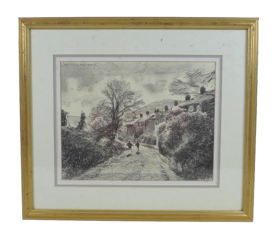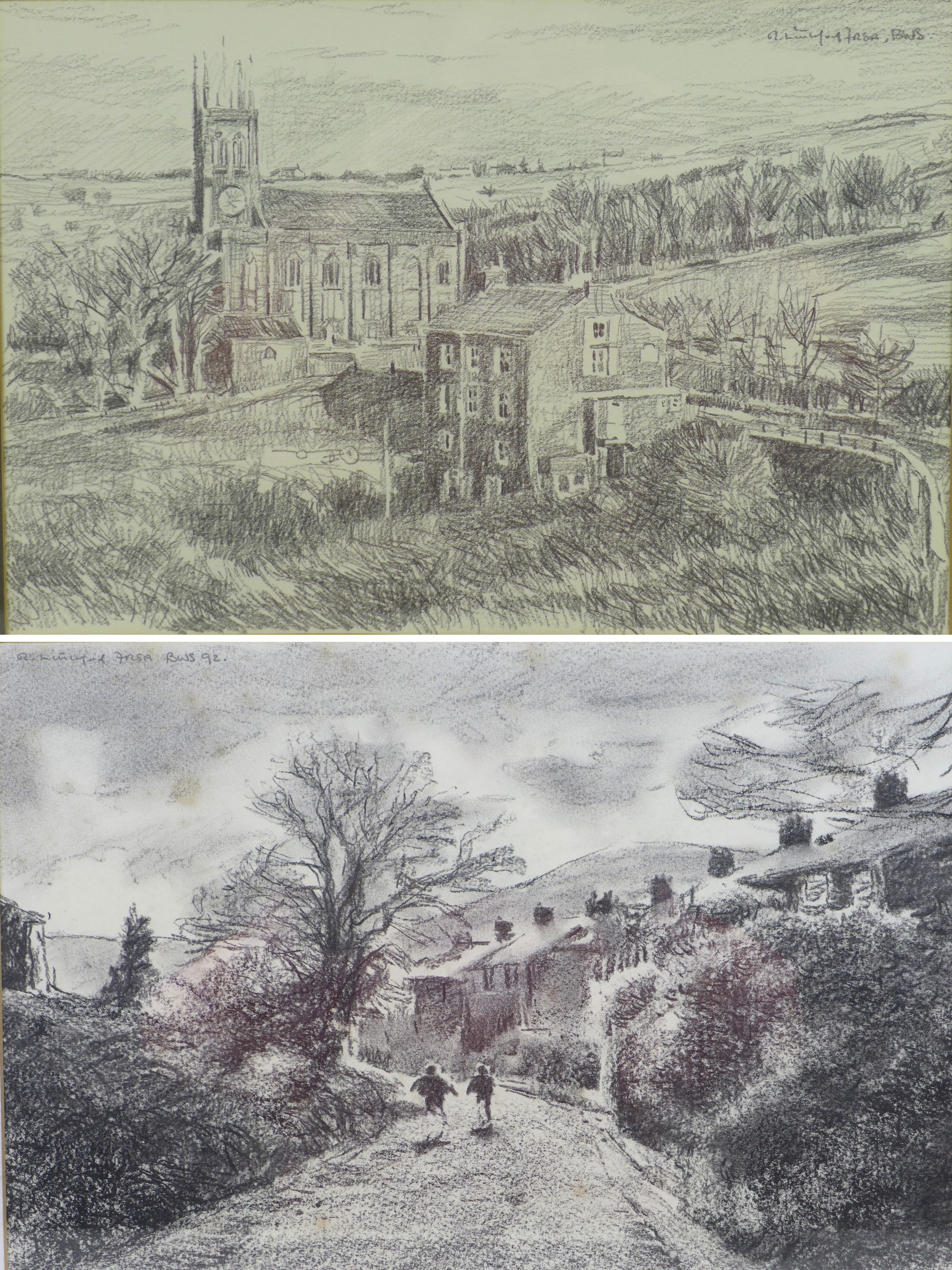 Robert Littleford (b. 1945): two landscape drawings, comprising a picture of a church, pencil on paper, signed top right corner, 22 by 33cm, framed and glazed, 41 by 51.5cm, together with a picture of two children running up a lane, charcoal on paper, signed top left corner, dated 1992, 28.5 by 37cm, framed and glazed, 49 by 56.5cm. (2)