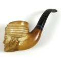 A Meerschaum pipe, the bowl modelled as a bearded gentleman wearing a turban, a further pipe with silver collar, in fitted case for H. P. & S London, and a curved brass, leather covered pipe stand. (3)