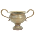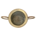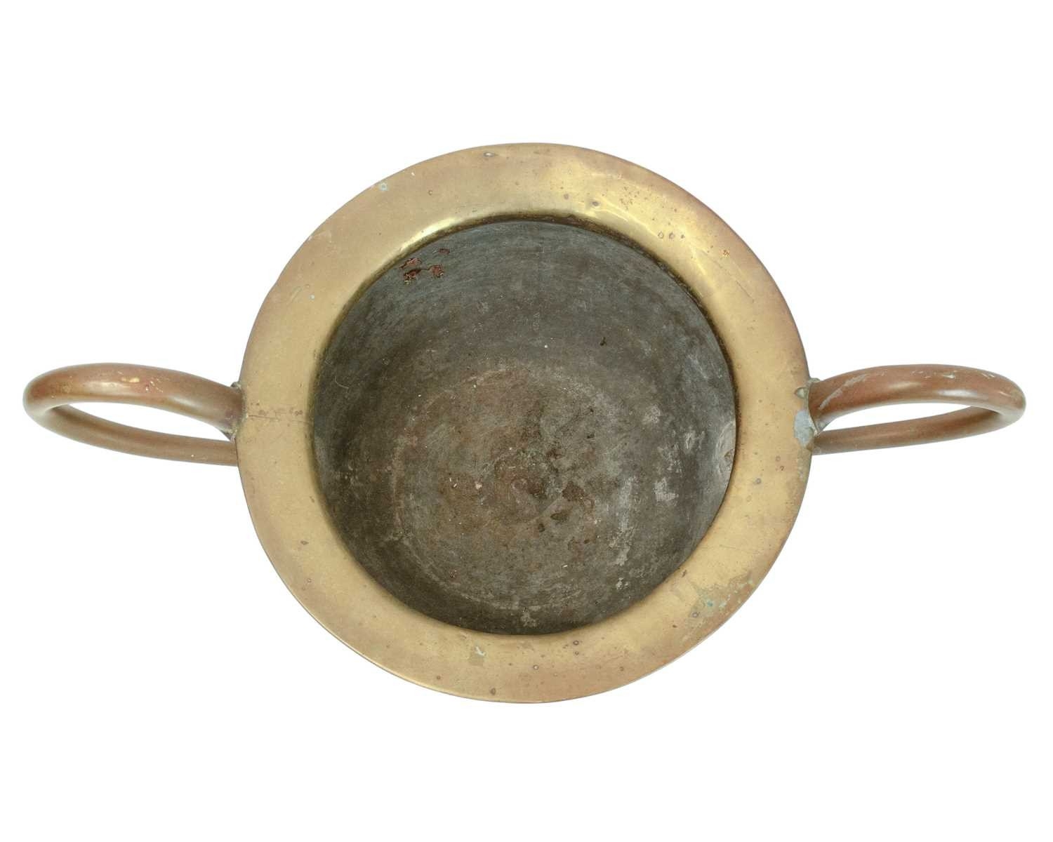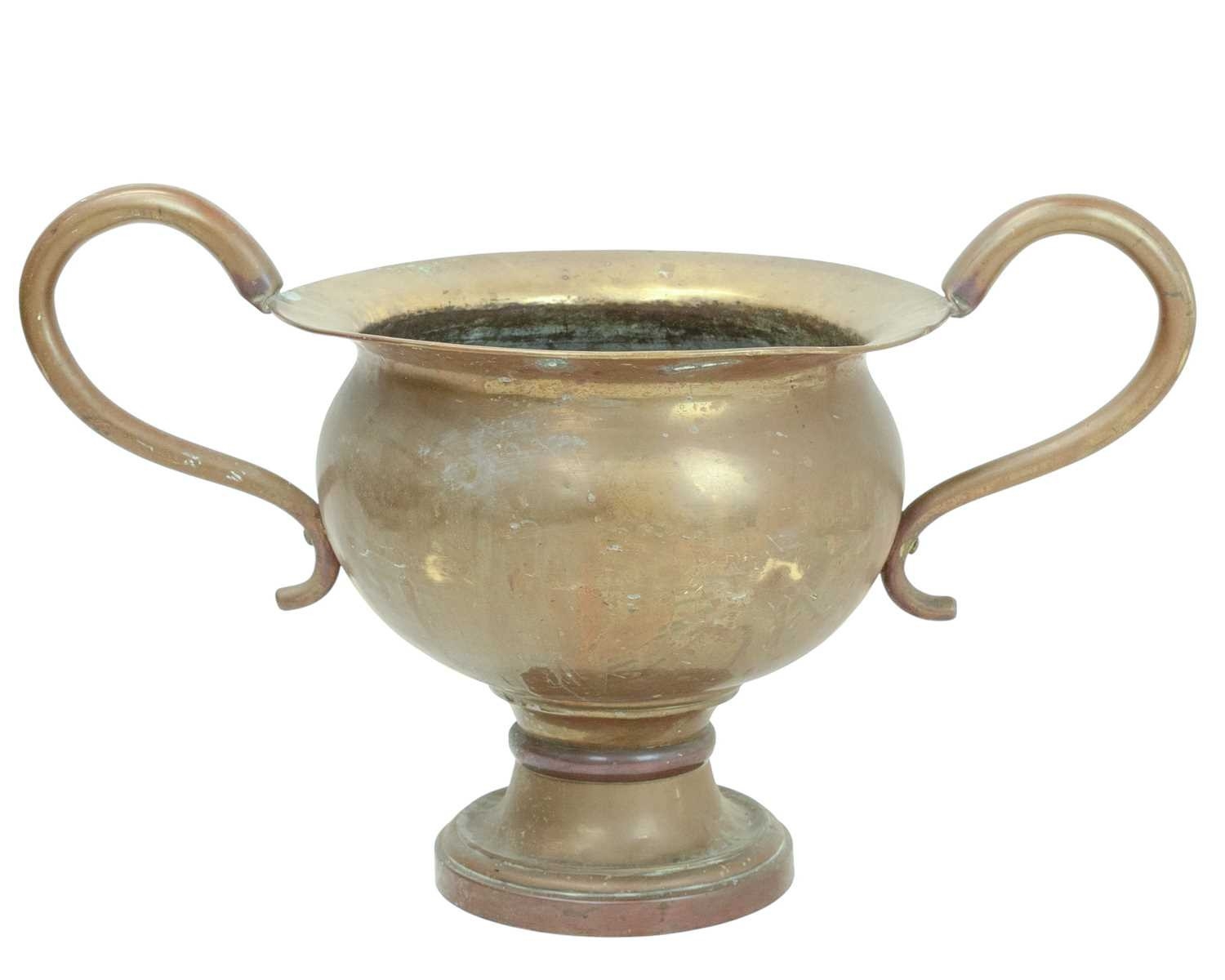 An oversized brass two handled urn or vase. 19th century, possibly a shop advertising promotion piece, height 44cm, width across the handles 72cm.