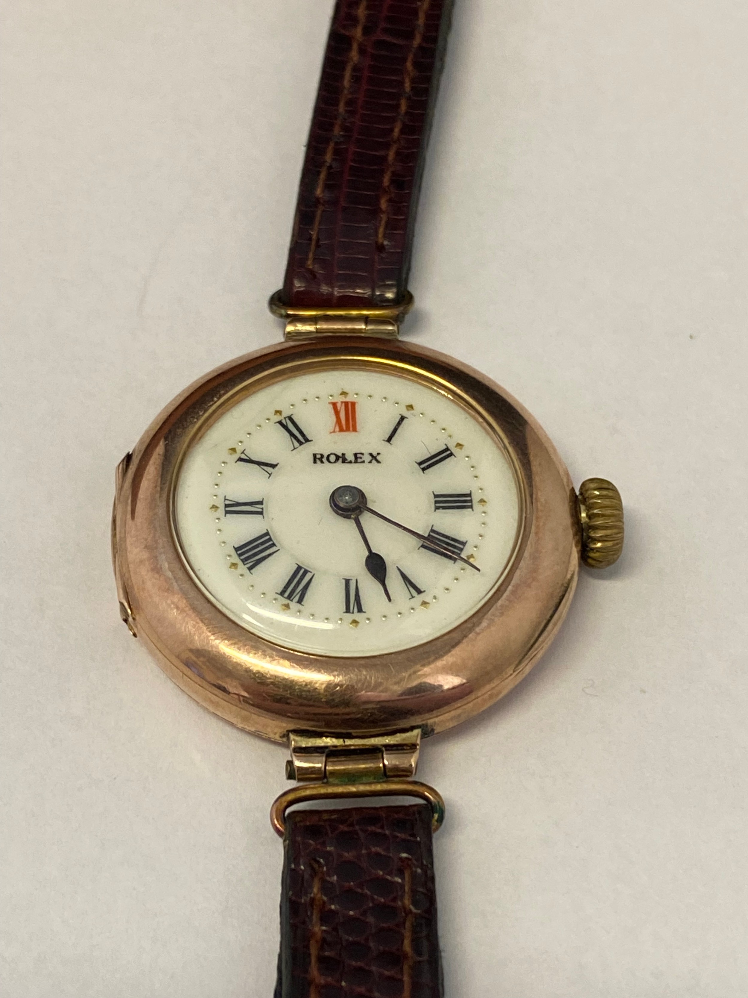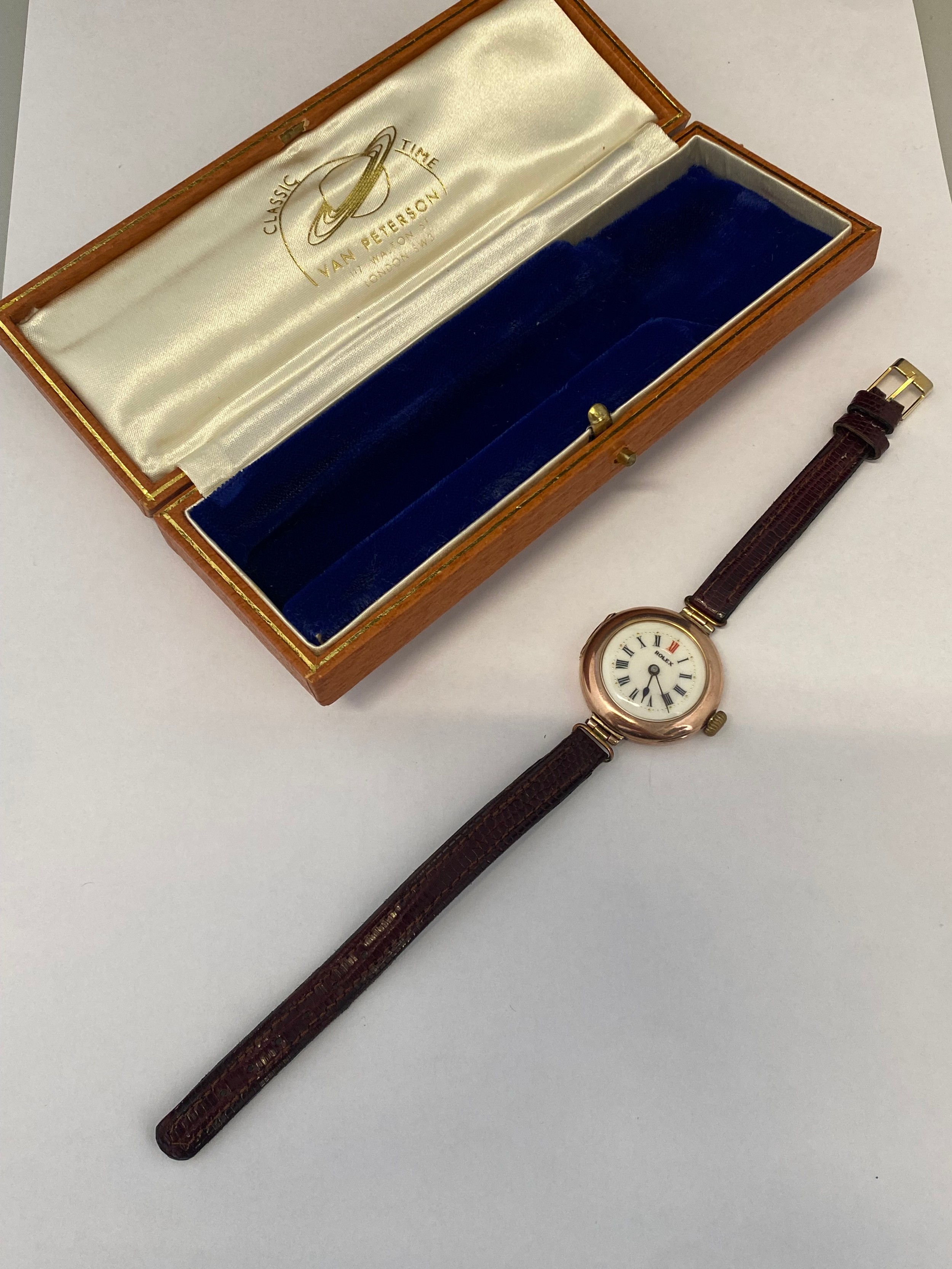 A lady's Rolex wristwatch, cream enamel dial, in a 9ct. gold case, on a leather strap, in a Classic Time Van Peterson leather covered box