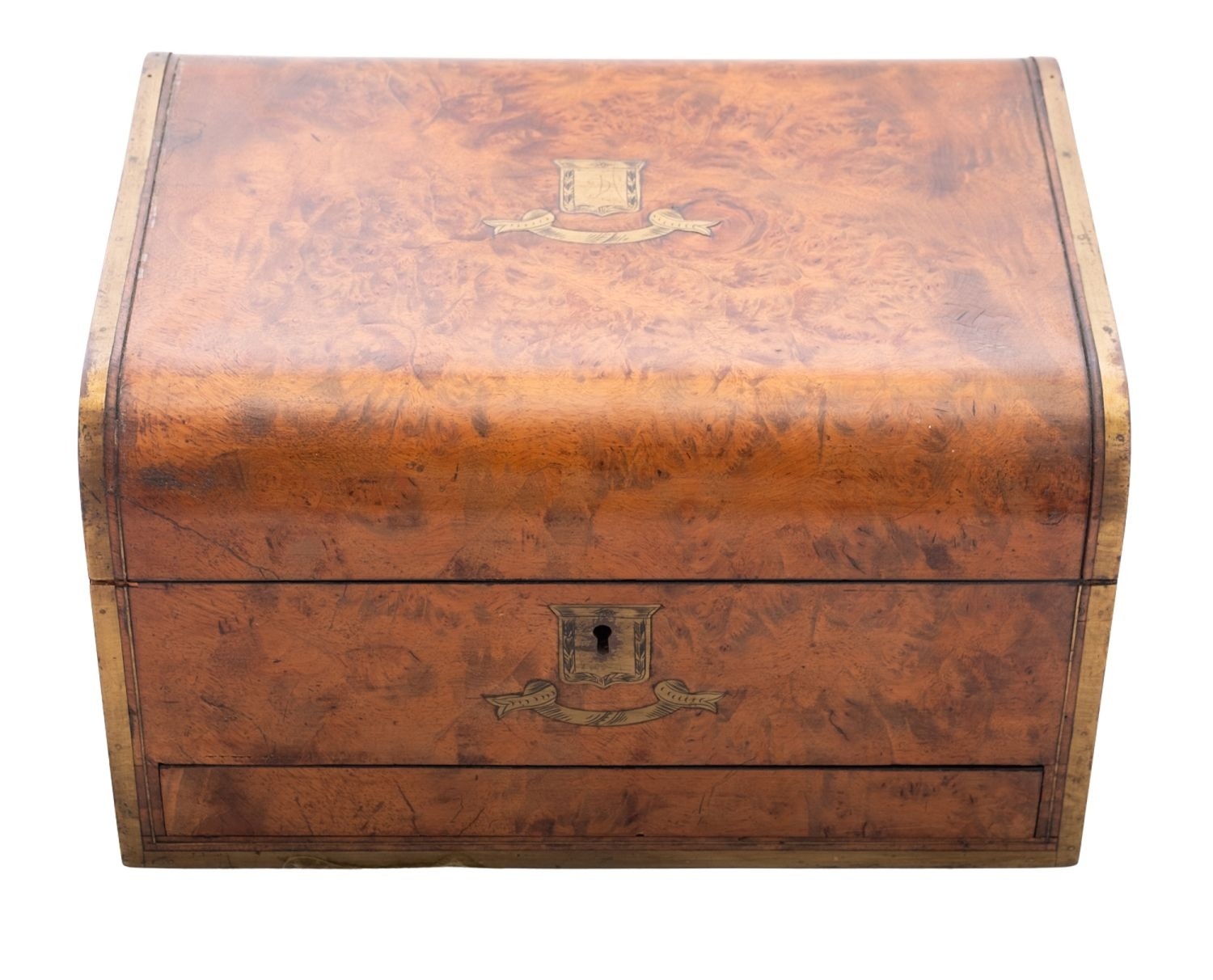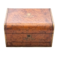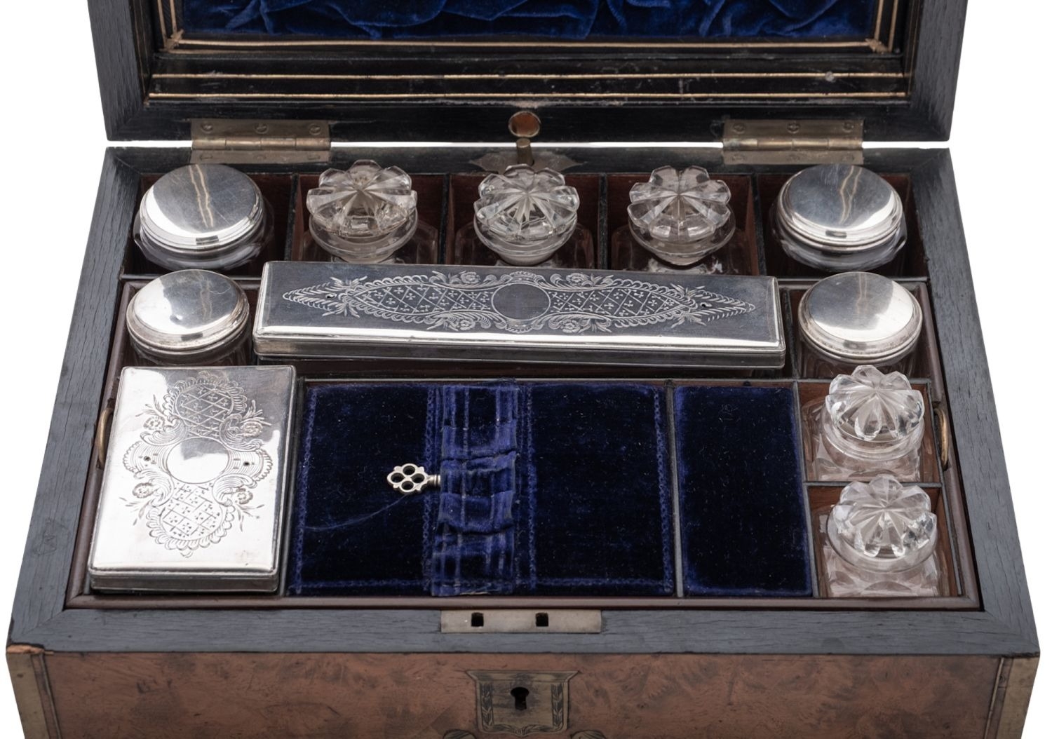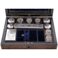 A 19th century brass bound walnut dressing case, the interior with a concealed jewellery drawer, a lift-out tray and fitted with 6 various silver plated mounted glass jars & six cut-glass bottles; the case 12'' (30.8cm) long