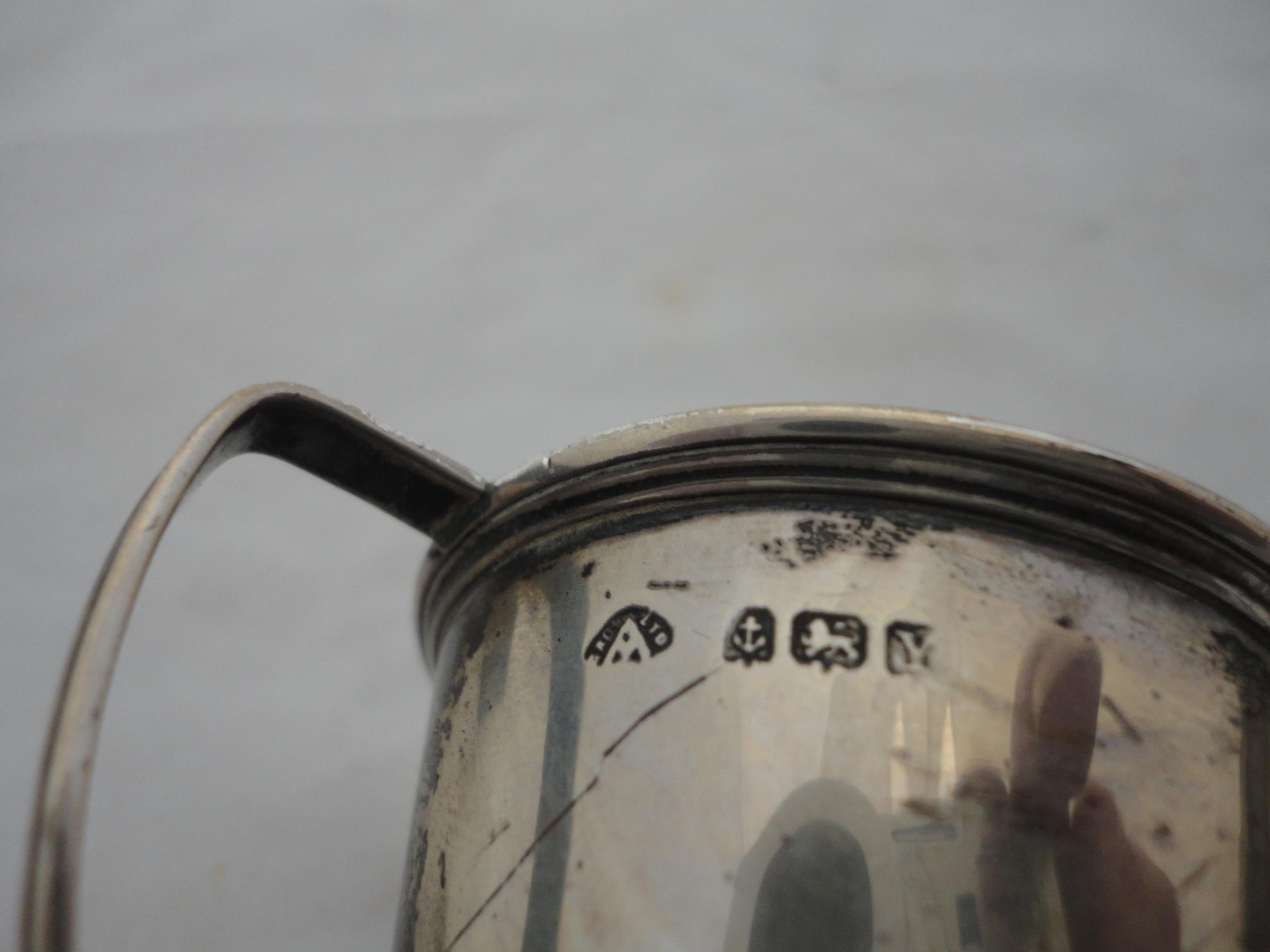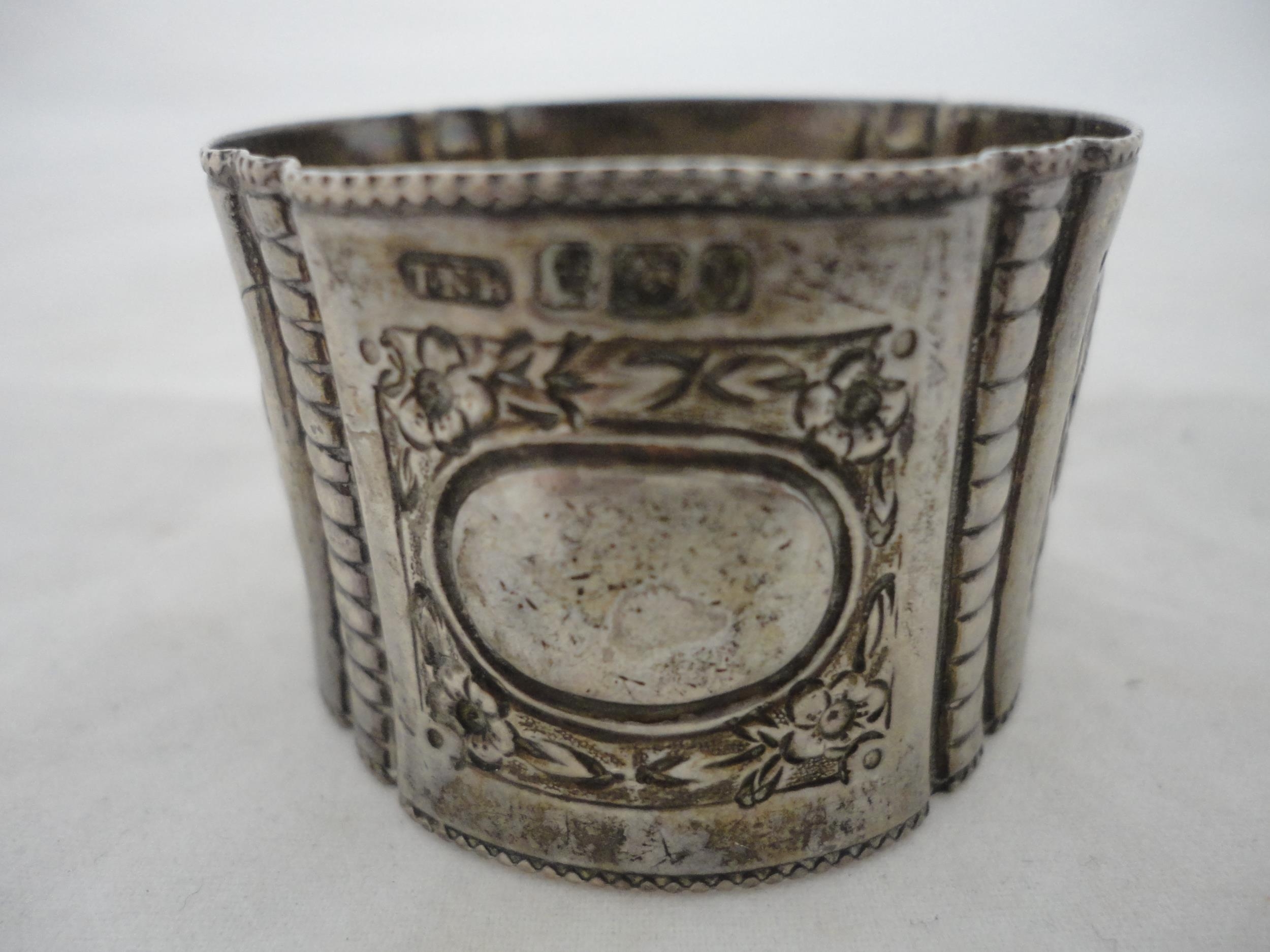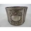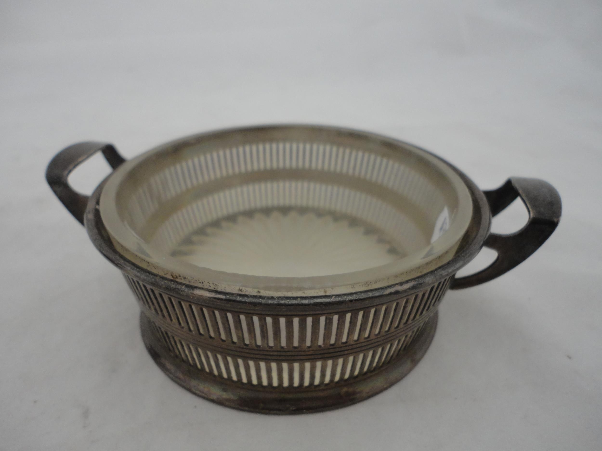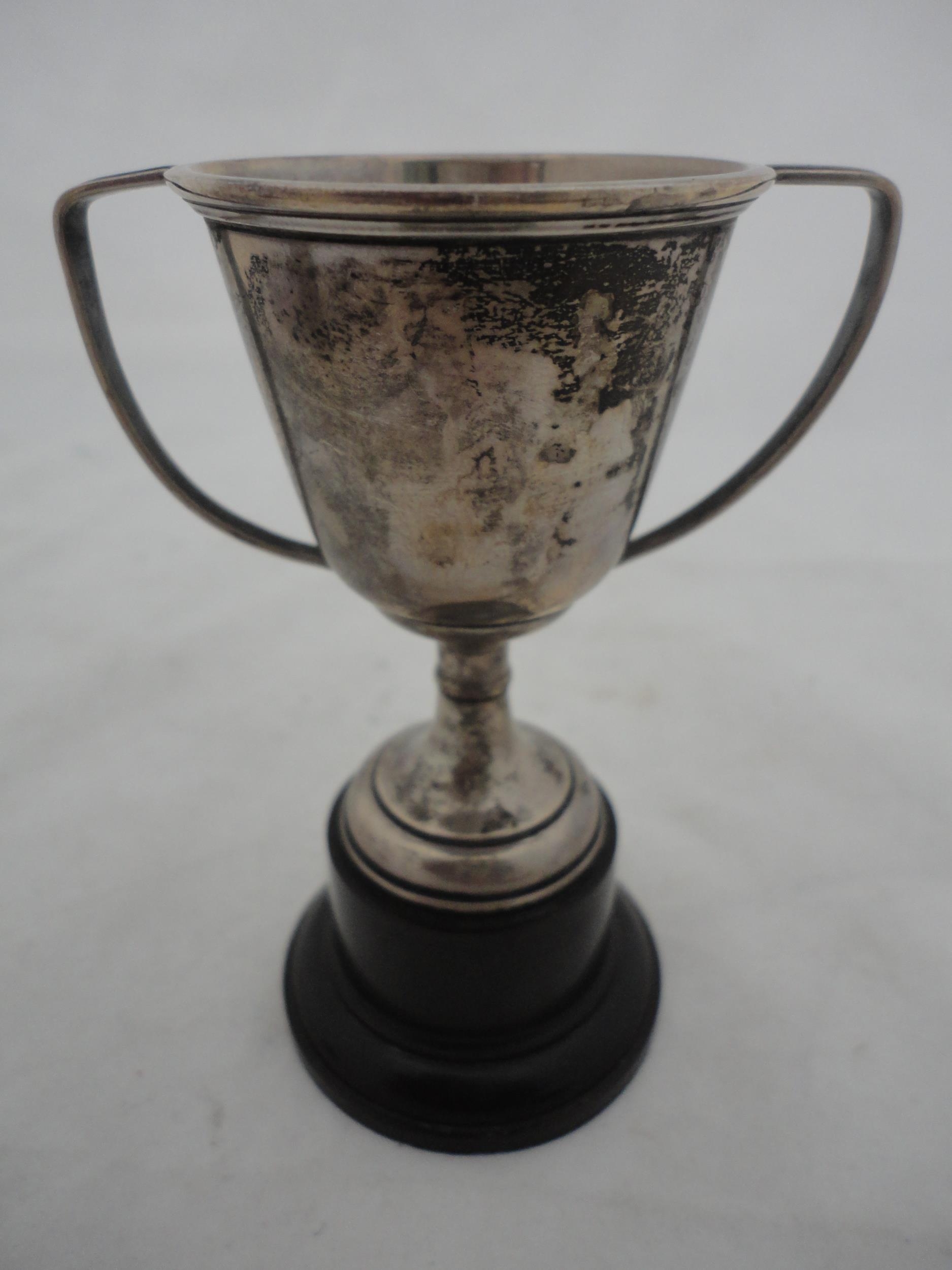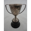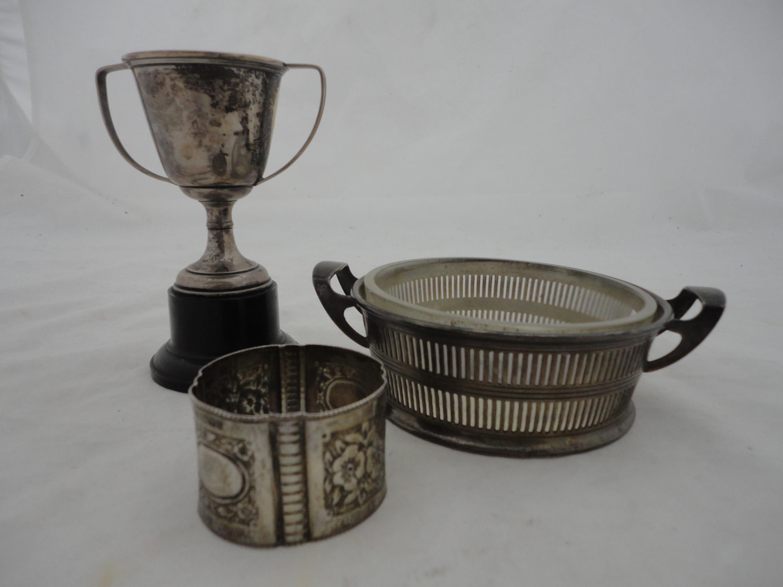 Silver-mounted butter dish with glass insert, silver napkin ring and a small silver prize cup, silver weight 157g gross.