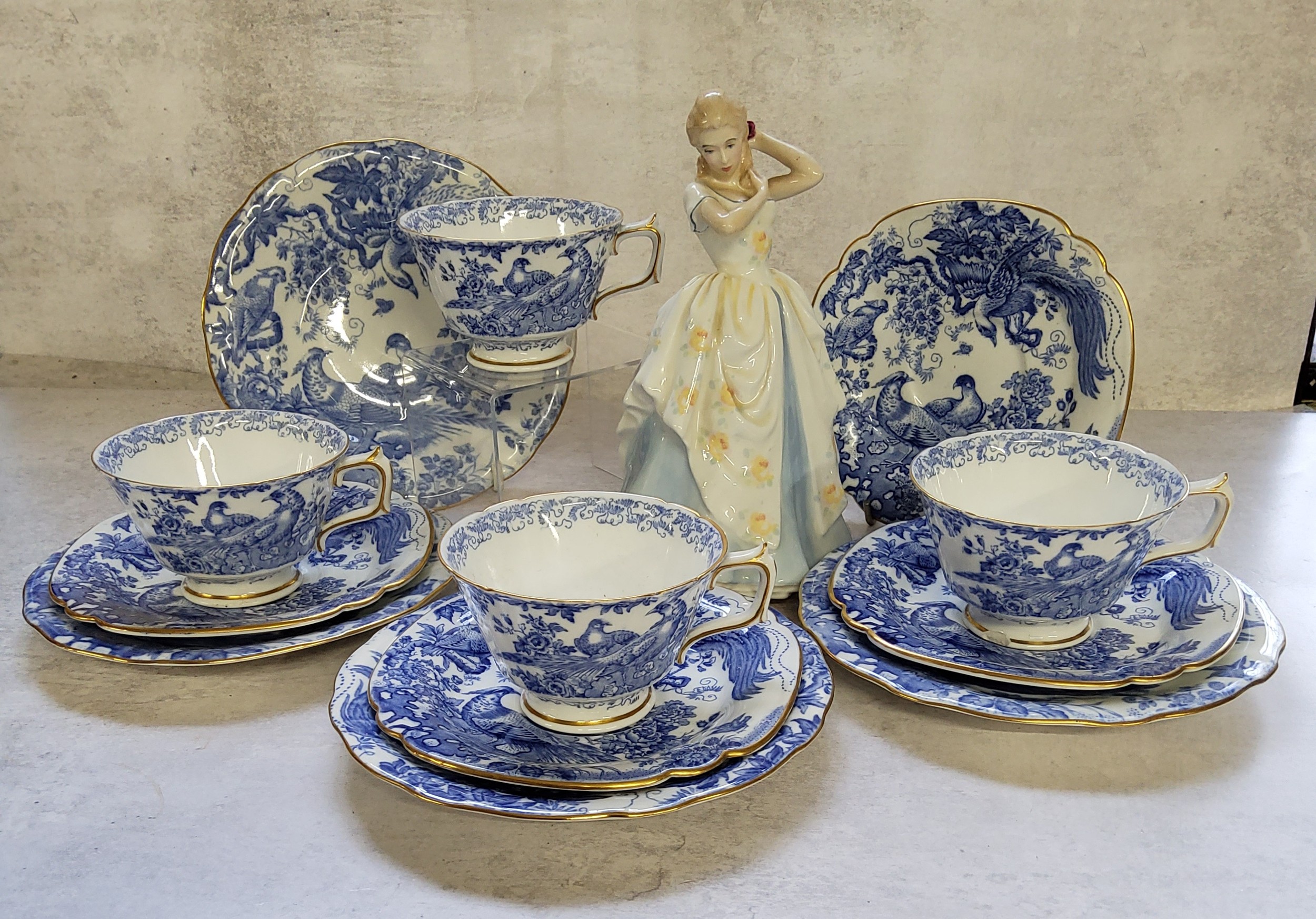 A Royal Crown Derby Blue Aves pattern part tea service; a Royal Doulton elegant lady titled Laura, printed marks to base, HN2960