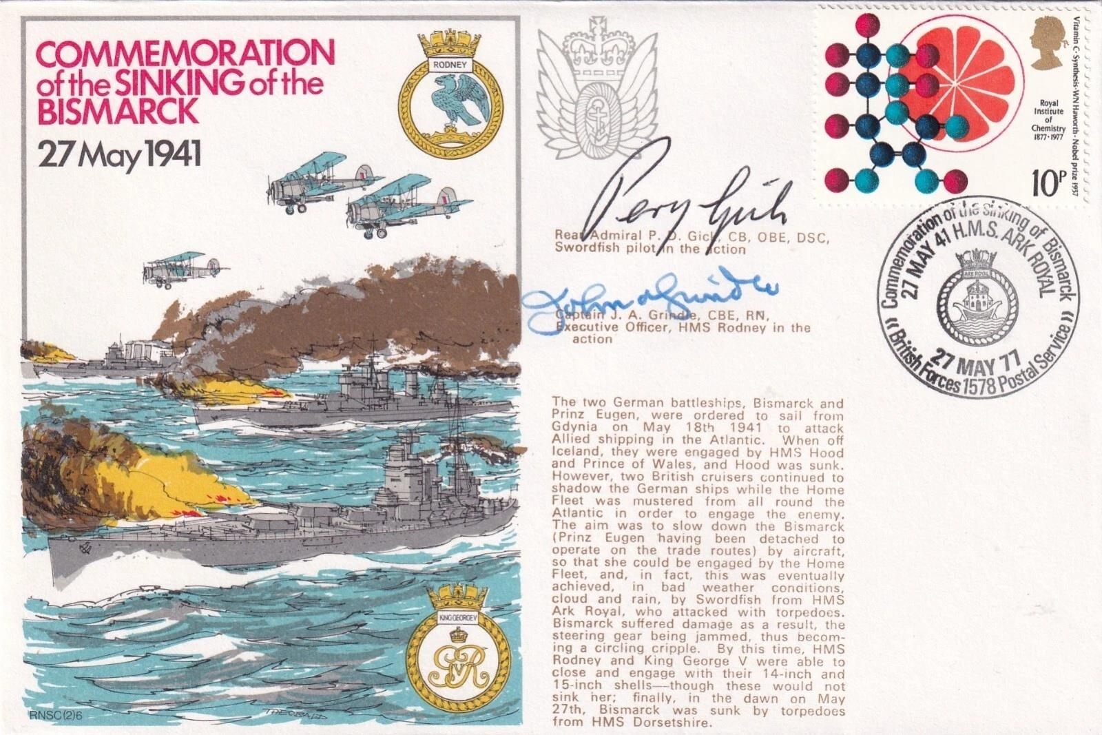 WW2 Navy Sinking the Bismarck Signed J A Grindle and P D Gick Swordfish Pilot Both in the action. 27 May 77 - BFPS 1578 - 8p Chemistry stamp. Commemoration of the sinking of the Bismarck Signed by Captain J A Grindle CBE Executive Officer HMS Rodney in the action. also Signed by Rear Admiral P D Gick Swordfish Pilot in the action with 825 Sqn flew off HMS Victorious Good condition. All autographs come with a Certificate of Authenticity. We combine postage on multiple winning lots and can ship worldwide. UK postage from £5.99, EU from £7.99, Rest of World from £9.99